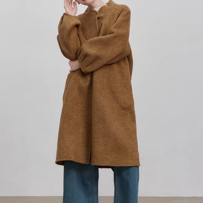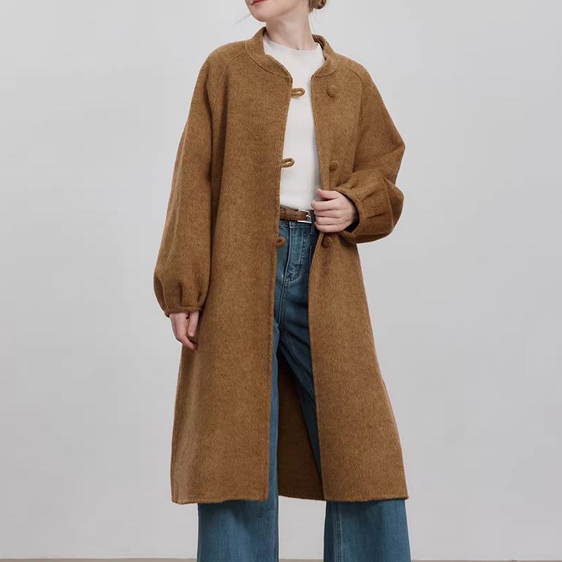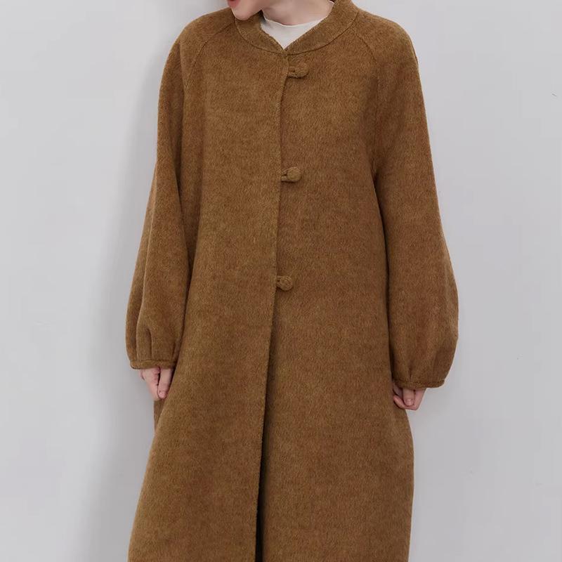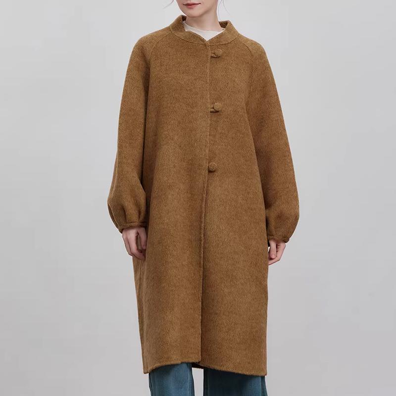 • New Chinese Style Loose Woolen Coat Women Autumn Winter Elegant Lantern Sleeve Round Neck Long Overcoat Solid Color Retro Casual Outerwear