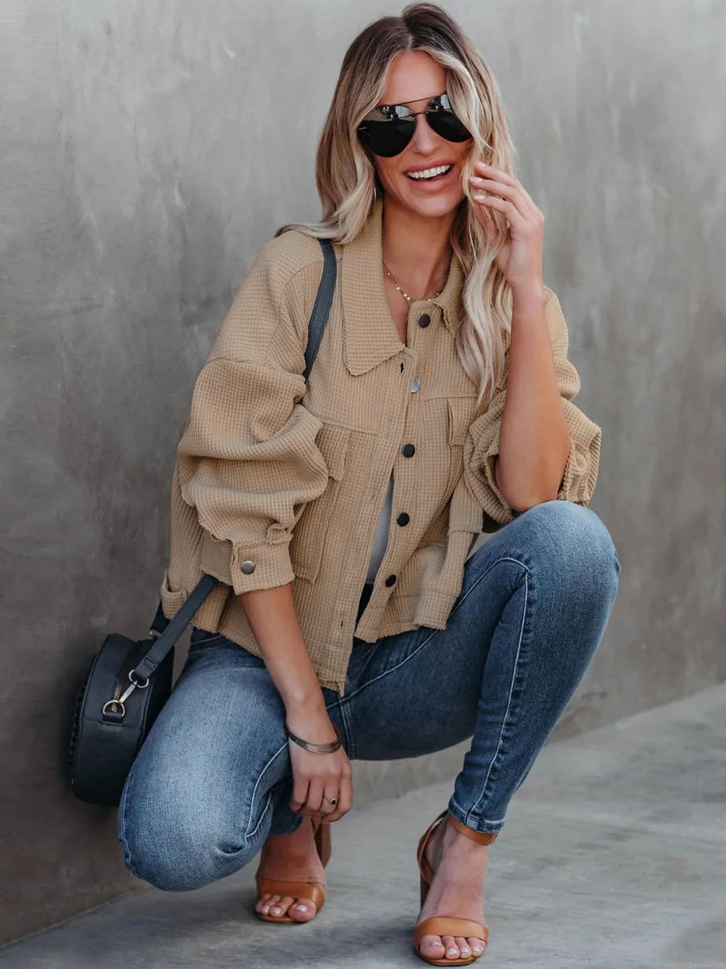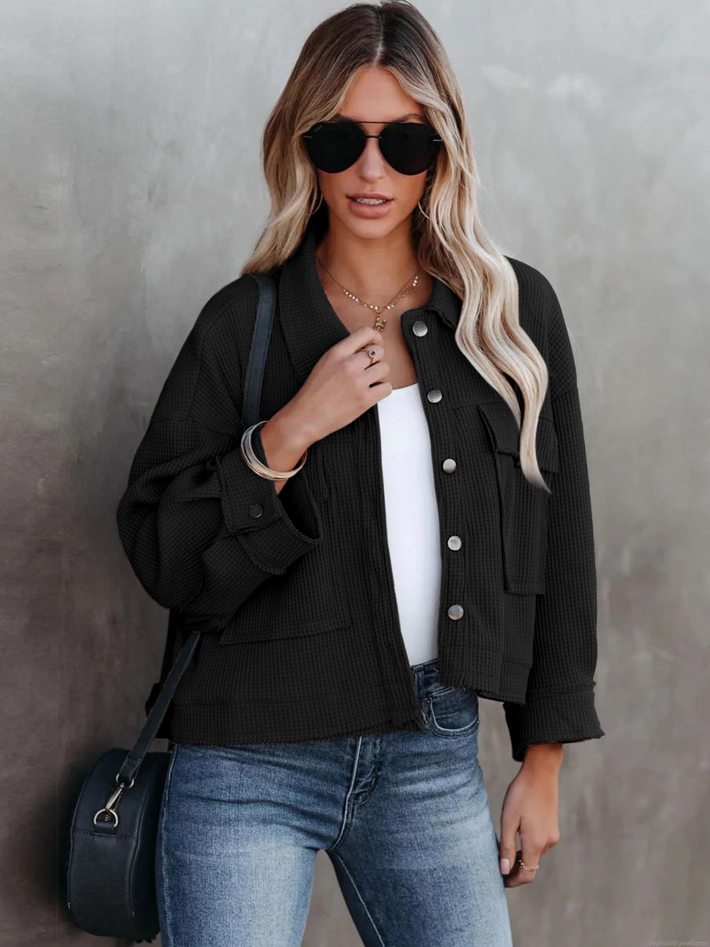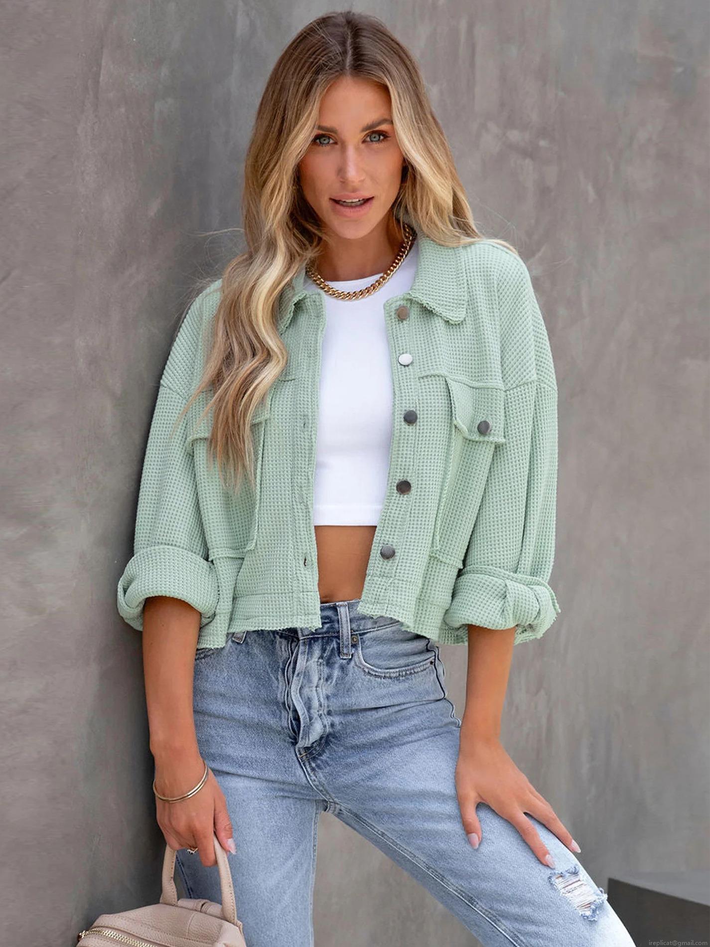 • Waffle Knit Shacket For Women Trendy Polo Collar Button Down Long Sleeve Crop Jacket Casual Lightweight Fall Outerwear With Pockets Solid Color Top