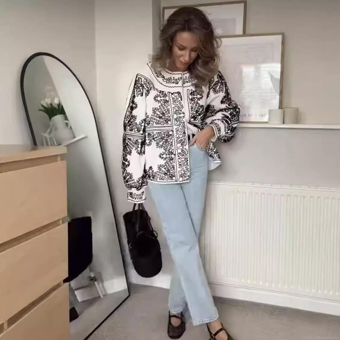 • Women 100% Cotton Bohemian Floral Embroidery Jacket Round Neck Long Sleeve Casual Western Style Outerwear With Hidden Buttons For Autumn Winter