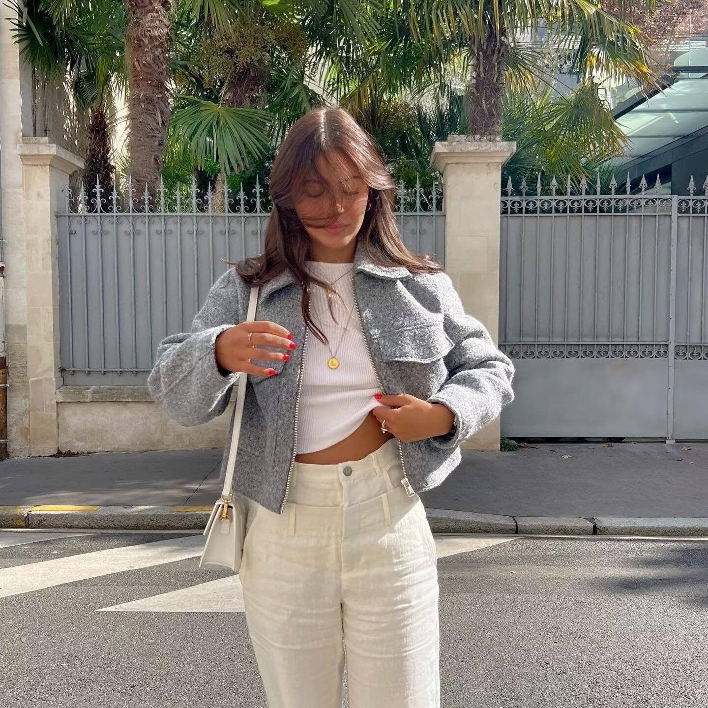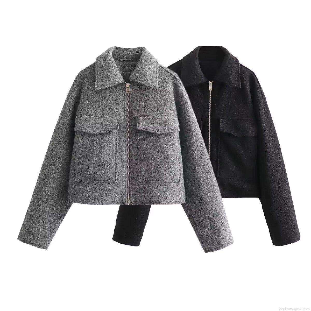 • Women Autumn Winter British Style Woolen Jacket Zipper Up Lapel Collar Short Outerwear With Flap Pockets Casual Commuter Streetwear Solid Color Polyester Top