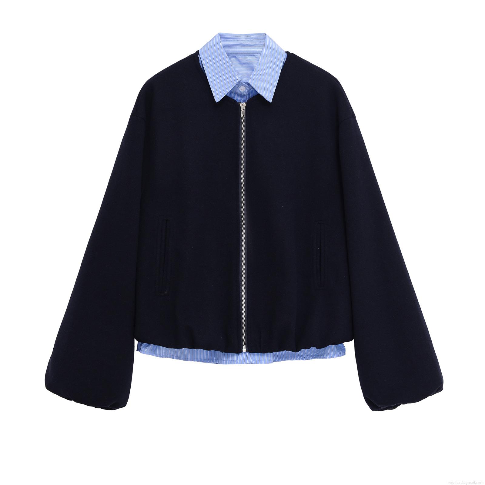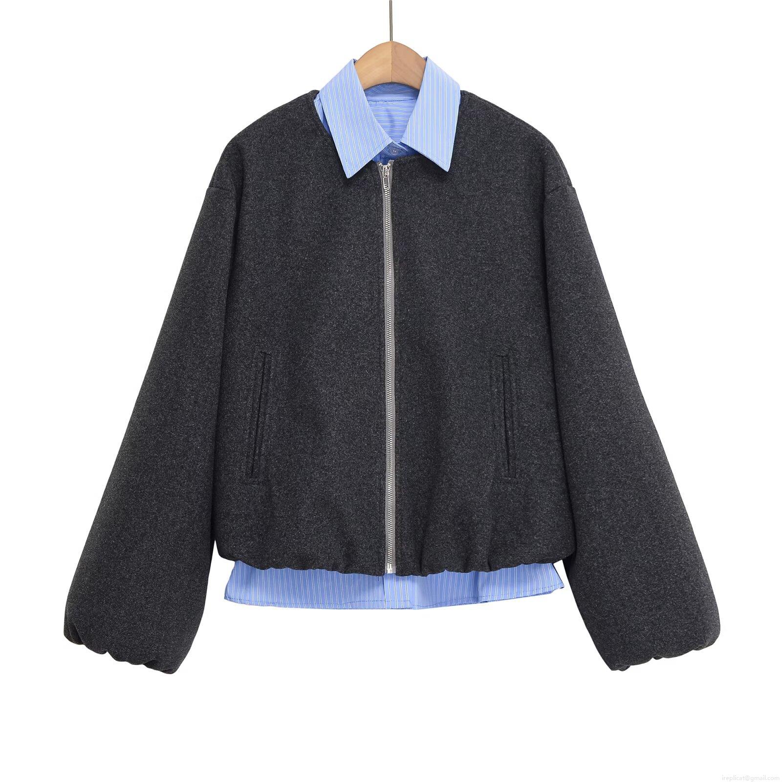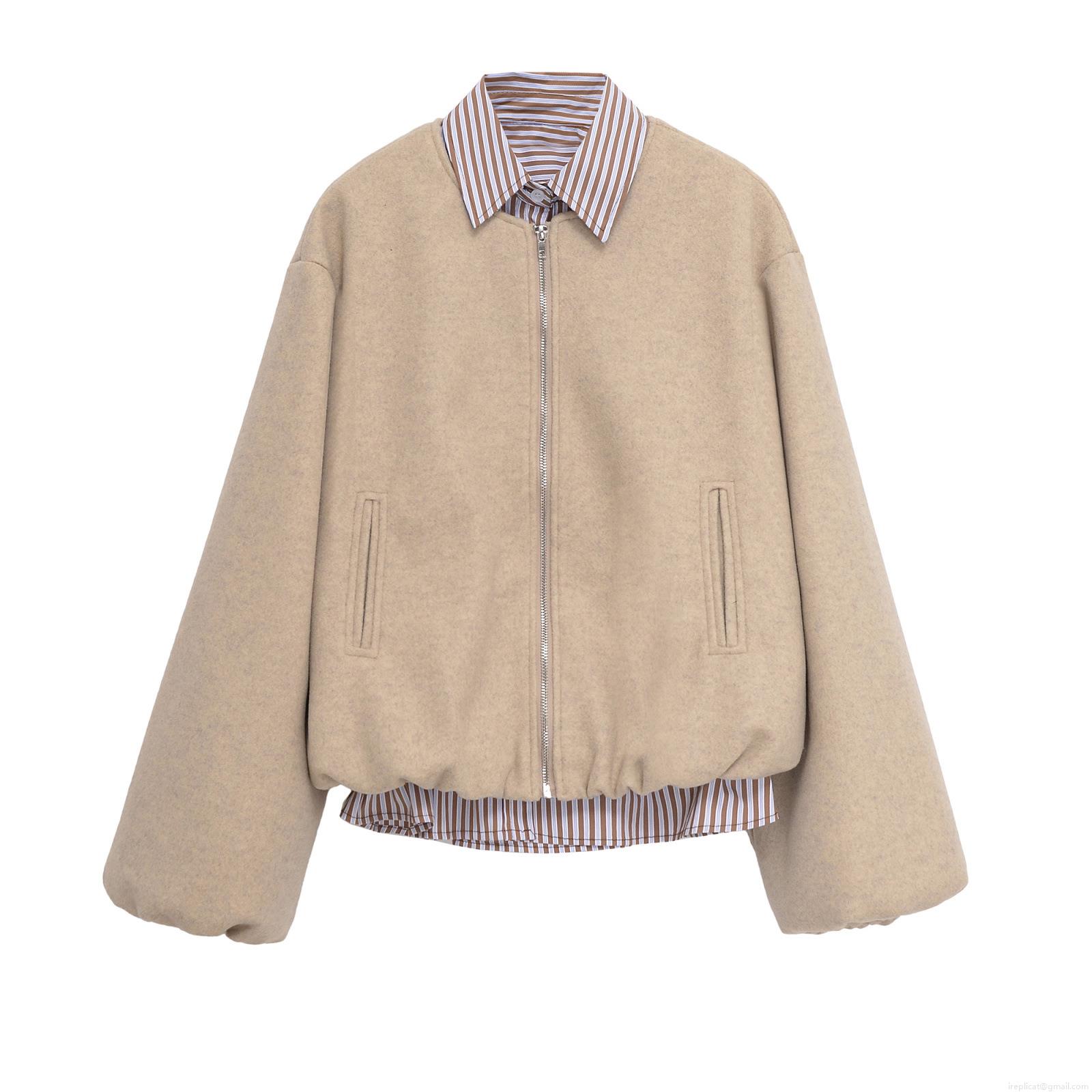 • Women Autumn Winter Loose Patchwork Striped Fake Two Piece Woolen Jacket Streetwear Lapel Zipper Baseball Uniform Casual Outerwear