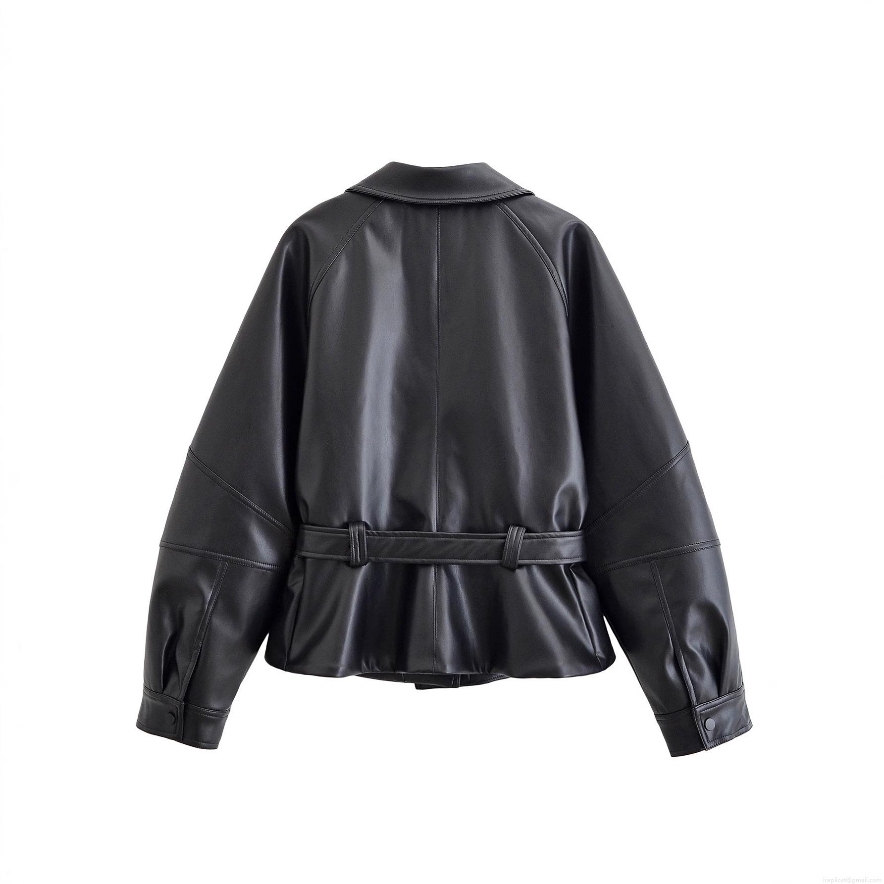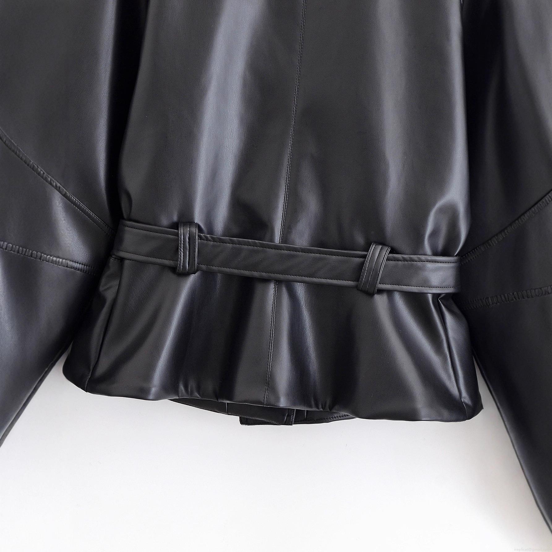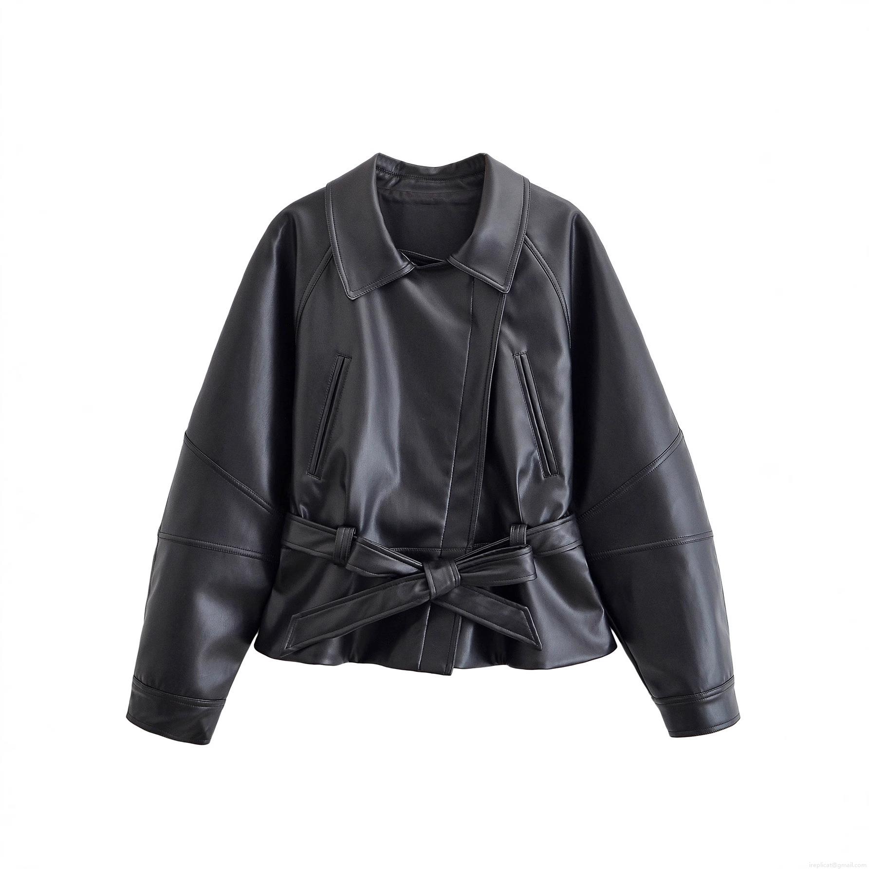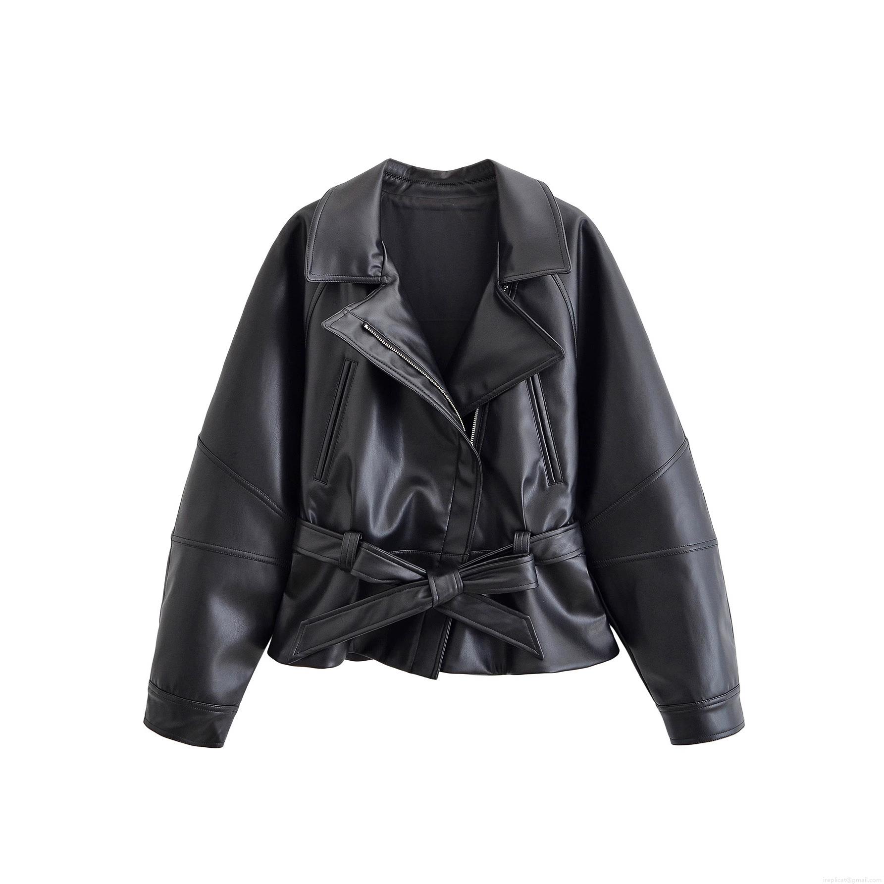 • Women Black PU Faux Leather Jacket Polyester Lining Lapel Collar Long Sleeve Short Trench Coat With Bow Tie Belt Fashion Streetwear Outerwear