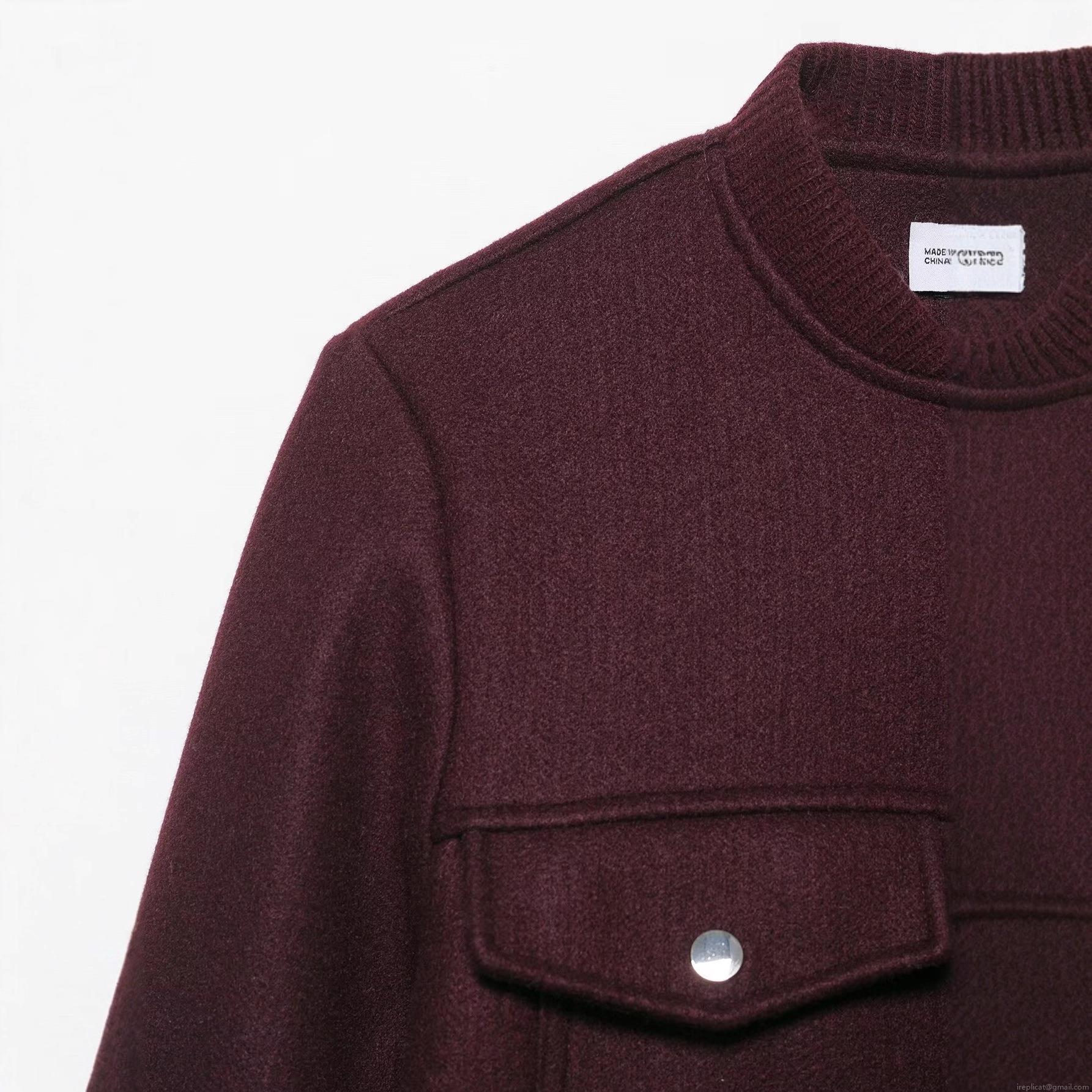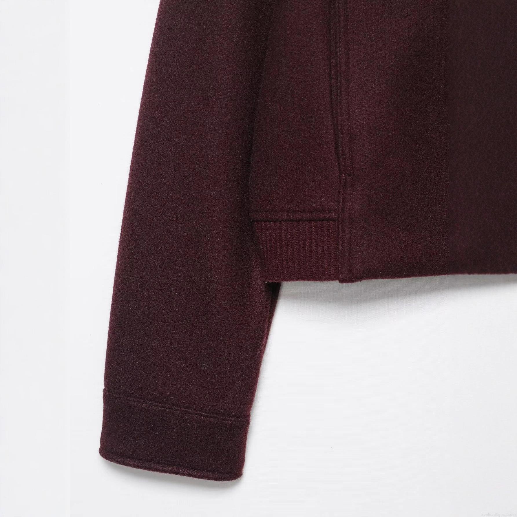 • Women Burgundy Short Bomber Jacket Woolen Texture Long Sleeve Zipper Coat Casual Streetwear Outwear With Pockets
