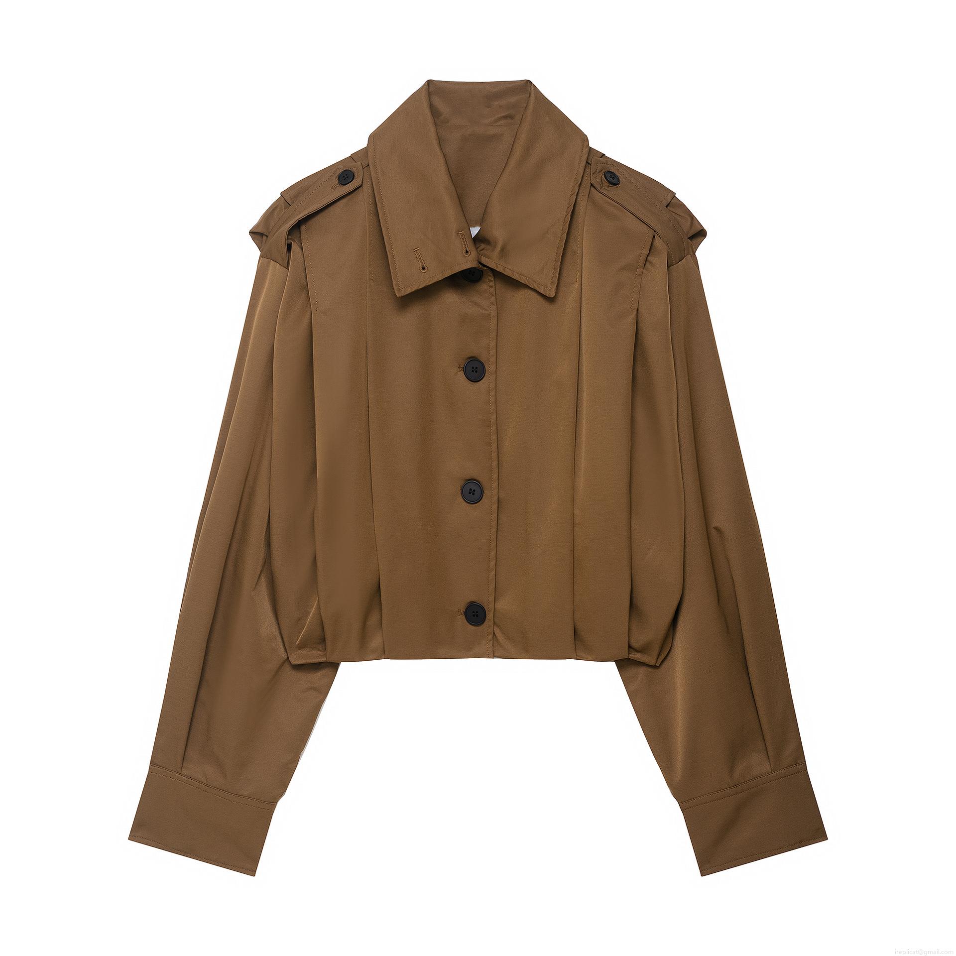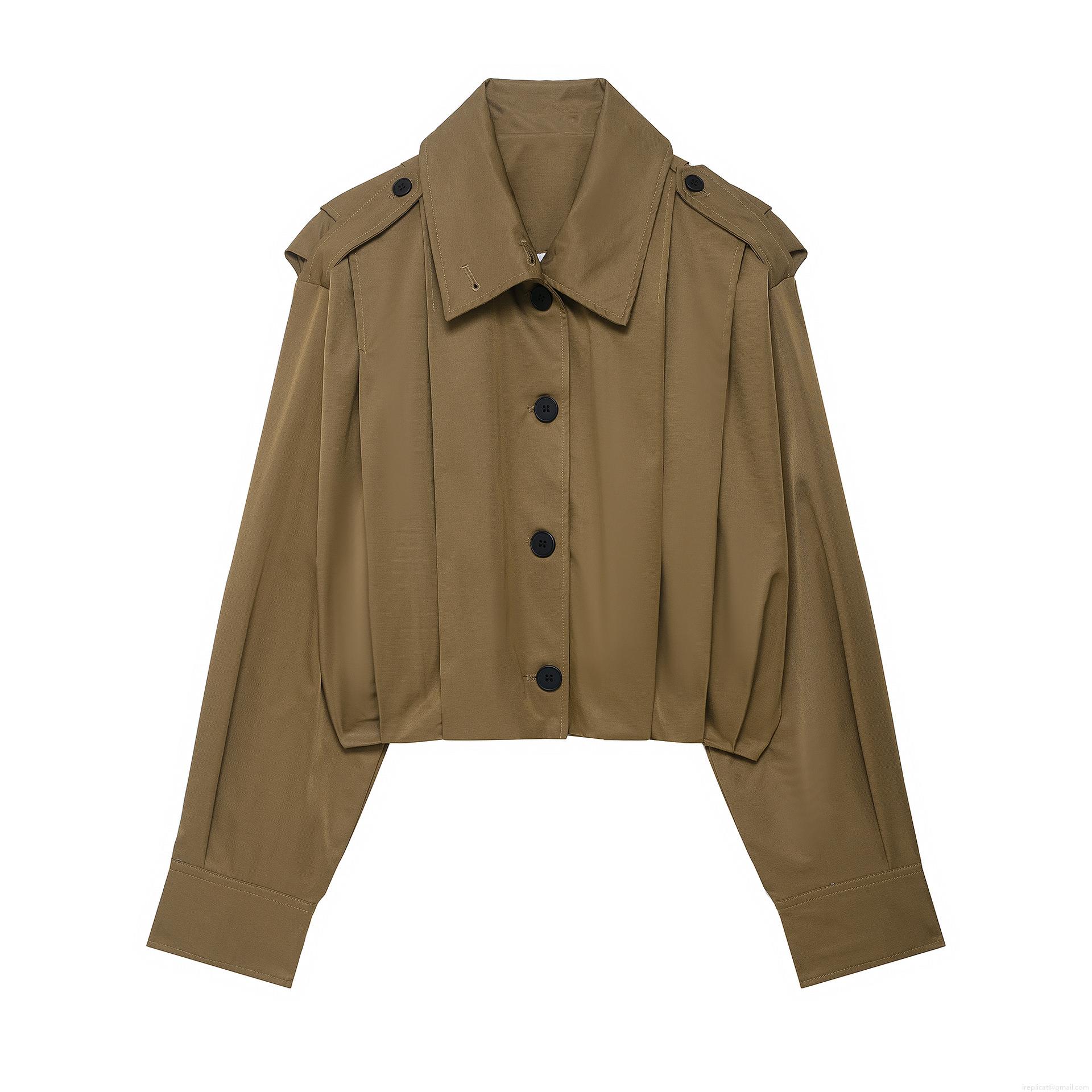 • Women Cargo Style Short Jacket Turn-down Collar Long Sleeve Single Breasted Coat With Epaulets Pleated Solid Color Polyester Outerwear For Women