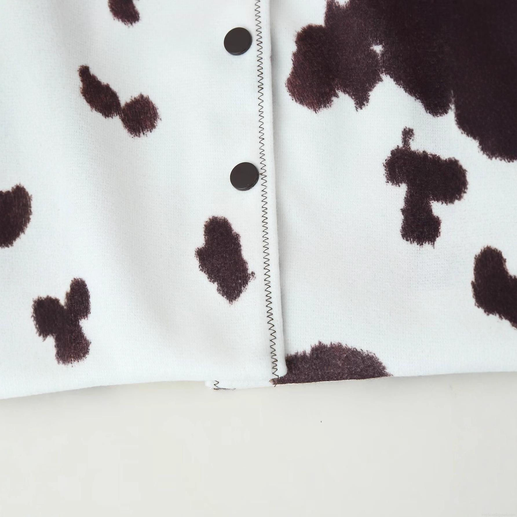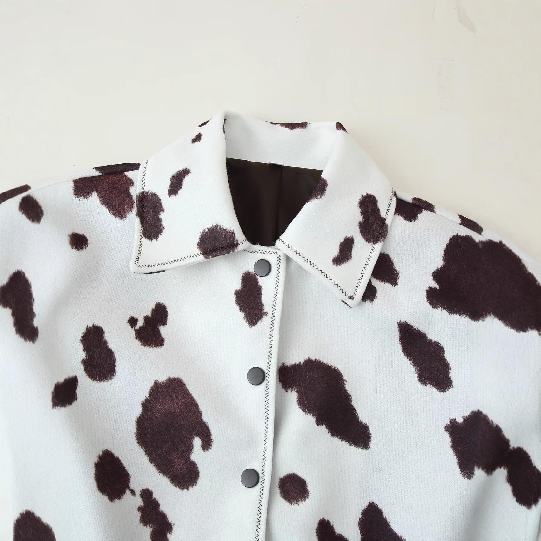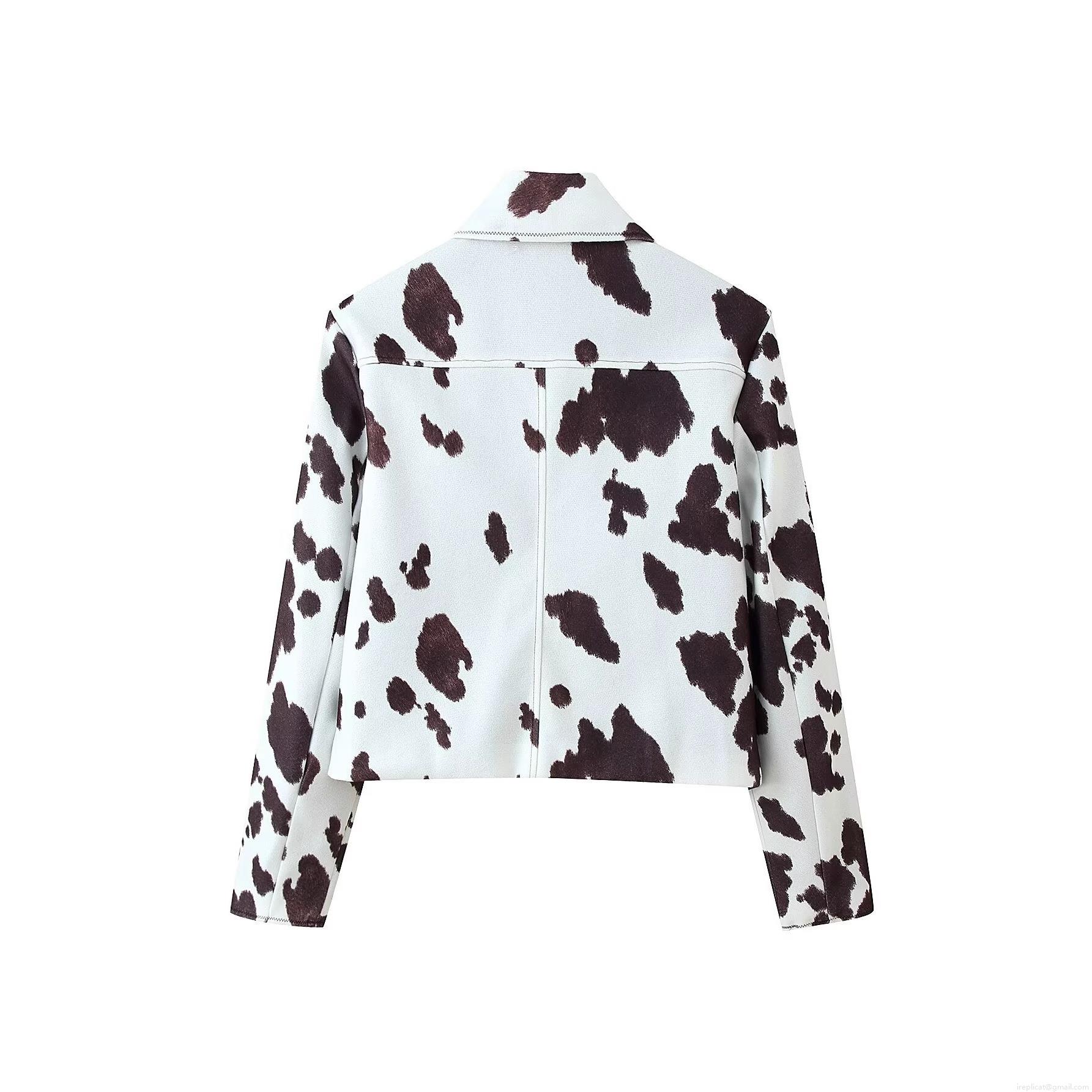 Women Casual Cow Print Jacket Fashion Polyester Lapel Button Down Cropped Outerwear Long Sleeve Streetwear Top For Ladies