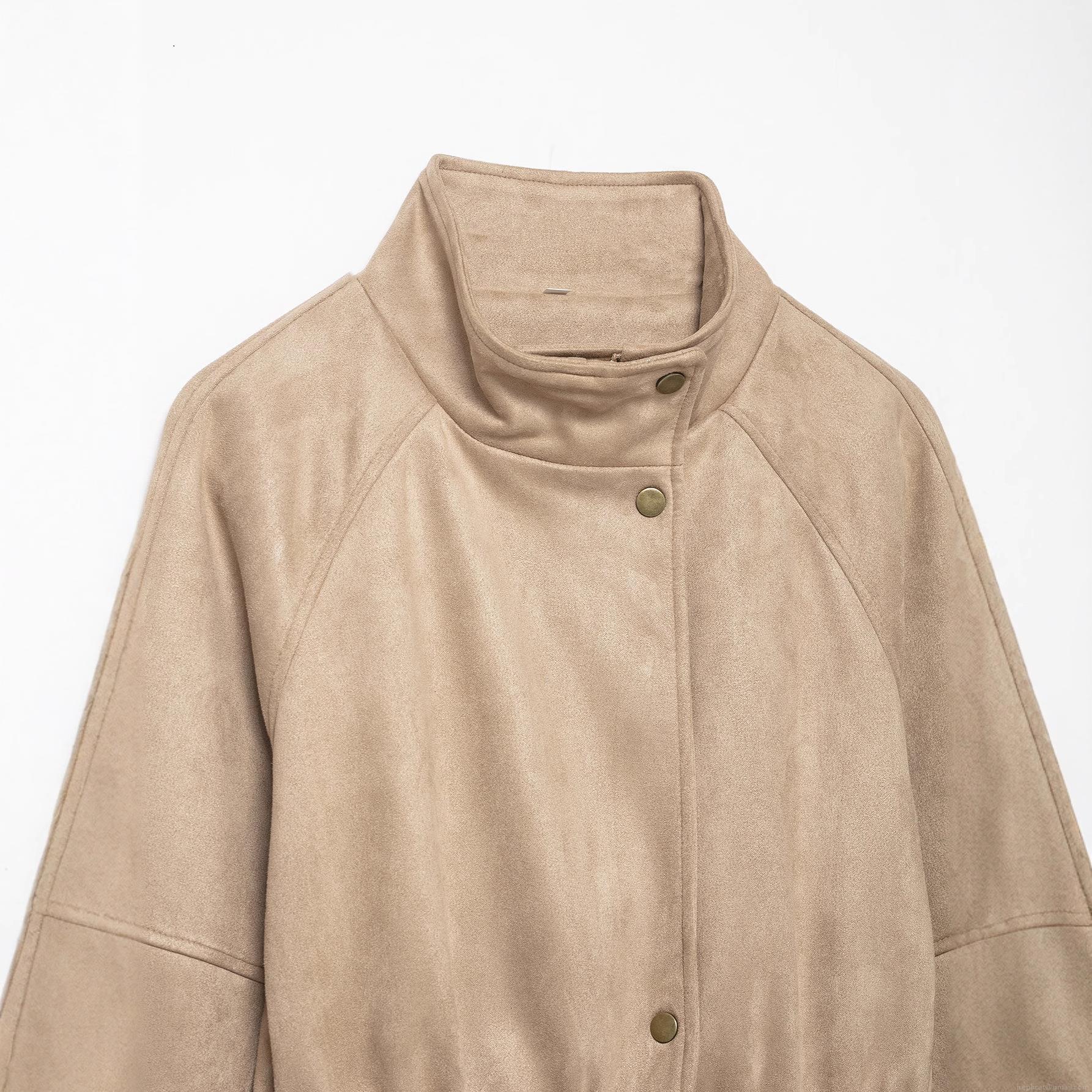 Women Casual Faux Suede Mid-Length Jacket Loose Stand Collar Drawstring Waist Snap Button Khaki Coat Streetwear Windbreaker Outwear