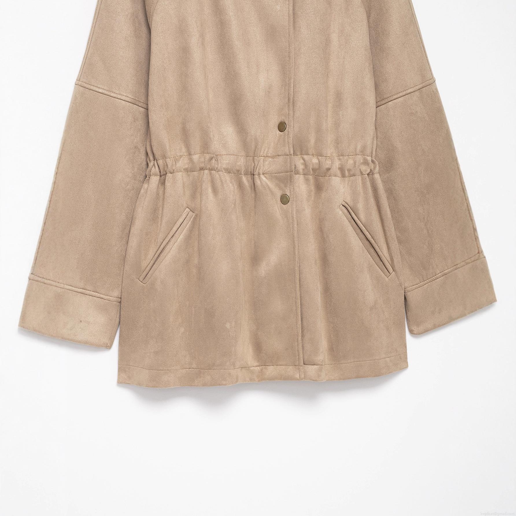 • Women Casual Faux Suede Mid-Length Jacket Loose Stand Collar Drawstring Waist Snap Button Khaki Coat Streetwear Windbreaker Outwear
