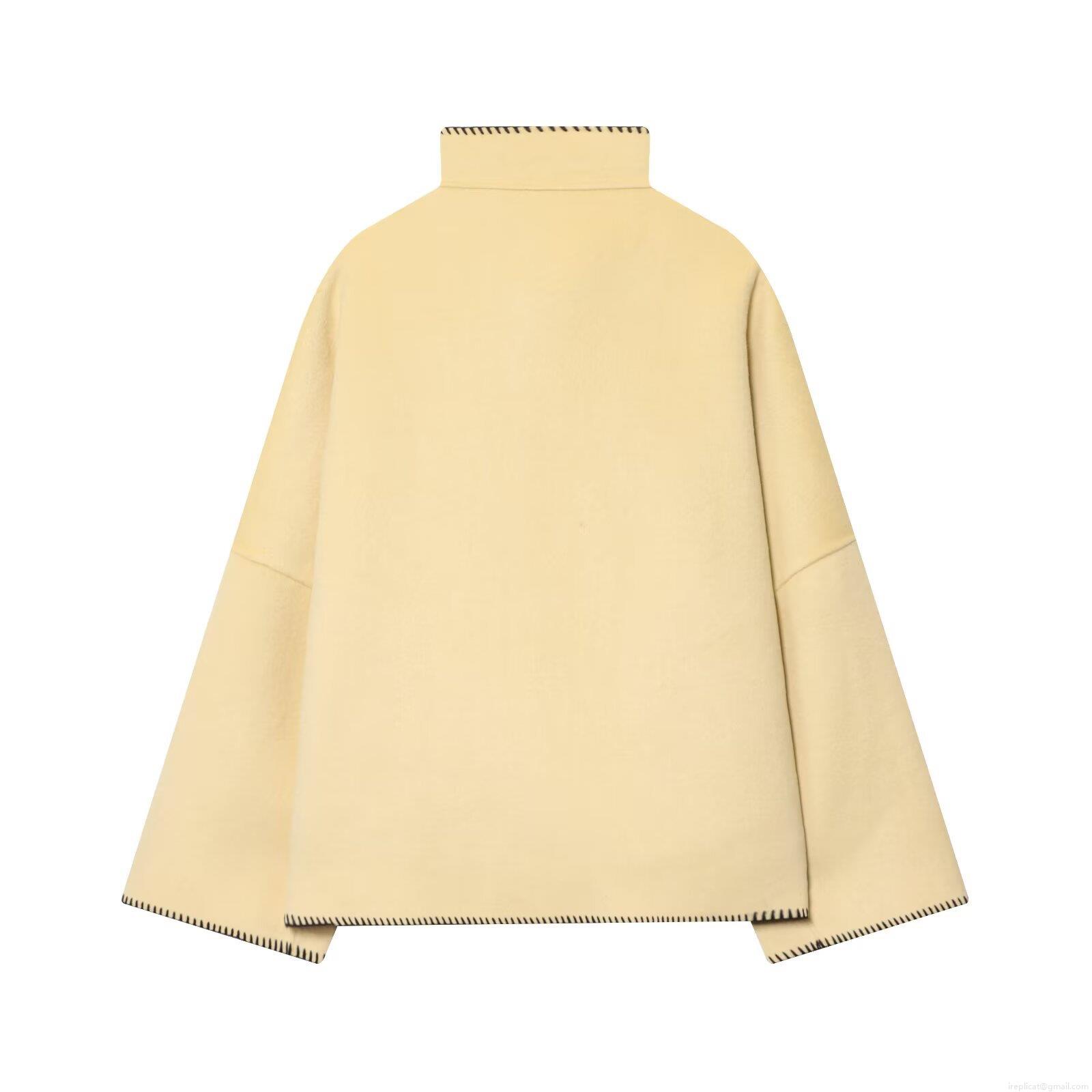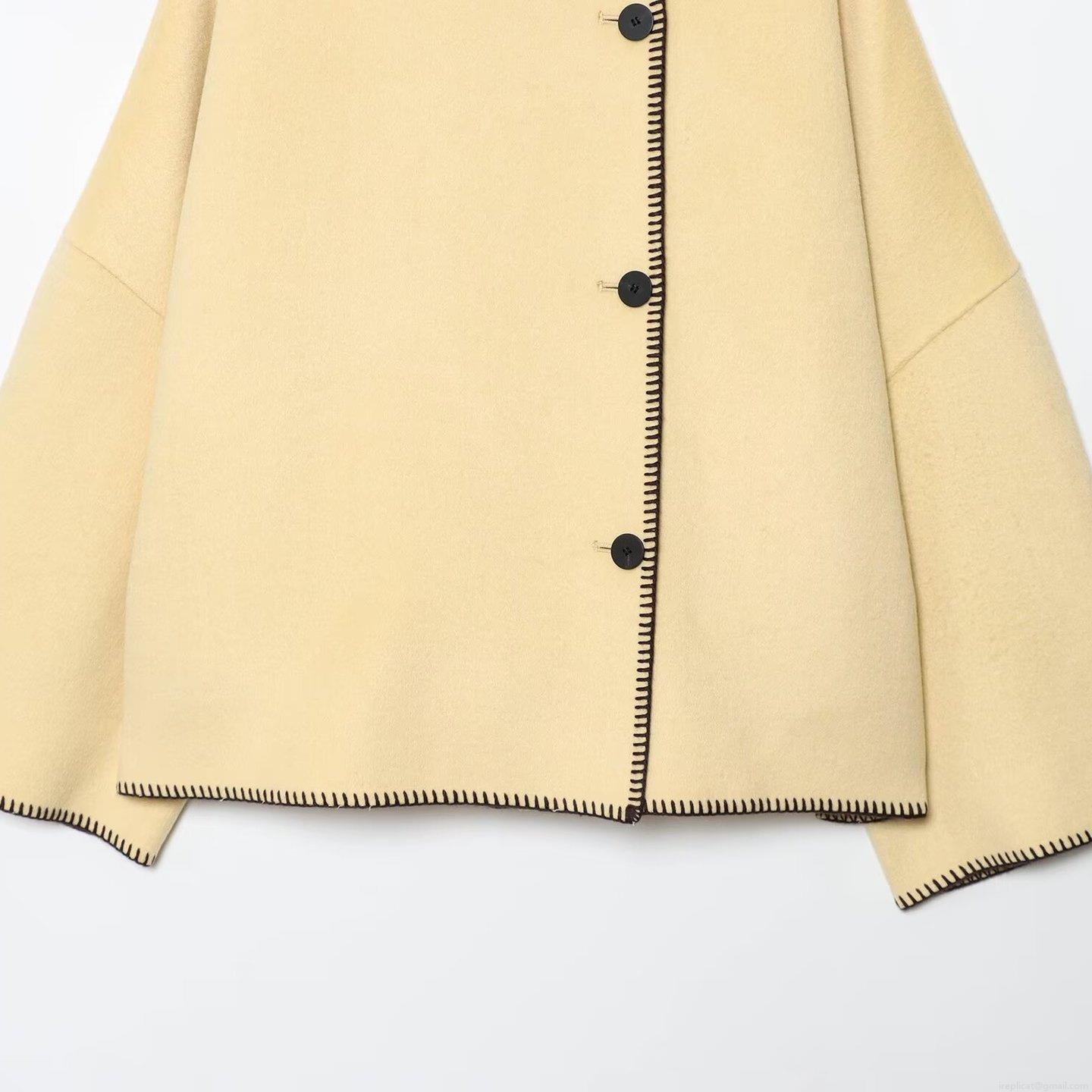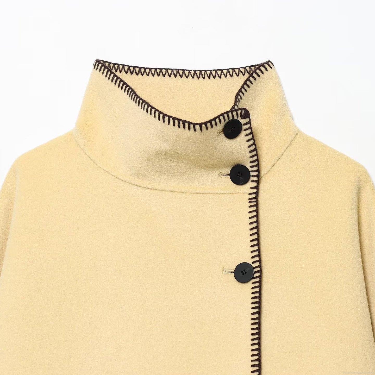 • Women Chic High Neck Woolen Short Jacket Autumn Winter Loose Fit Contrast Stitching Single Breasted Casual Outerwear Coat