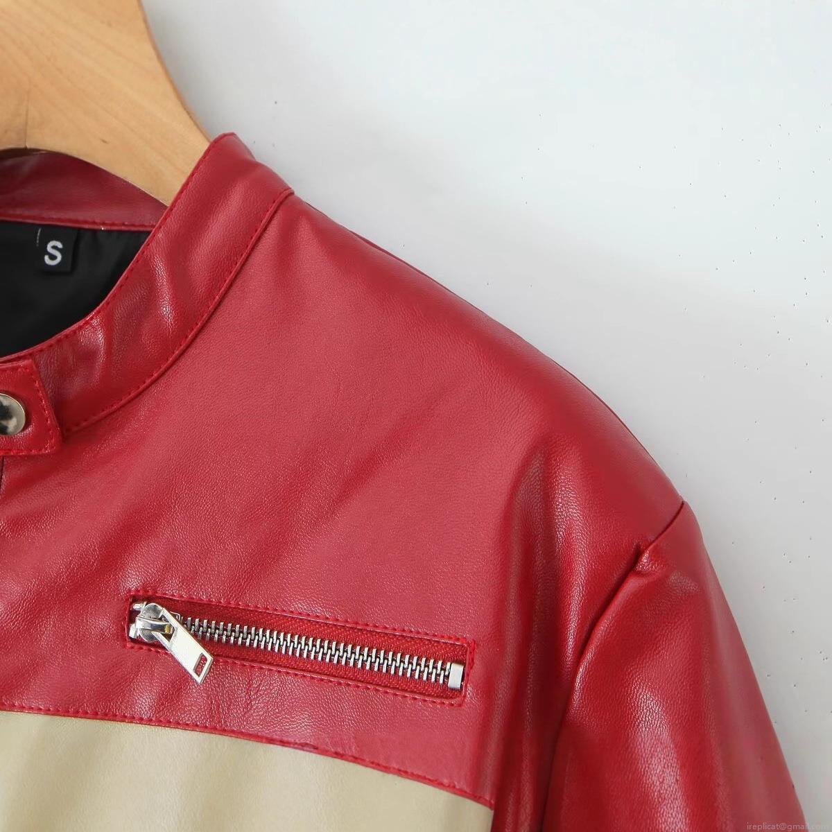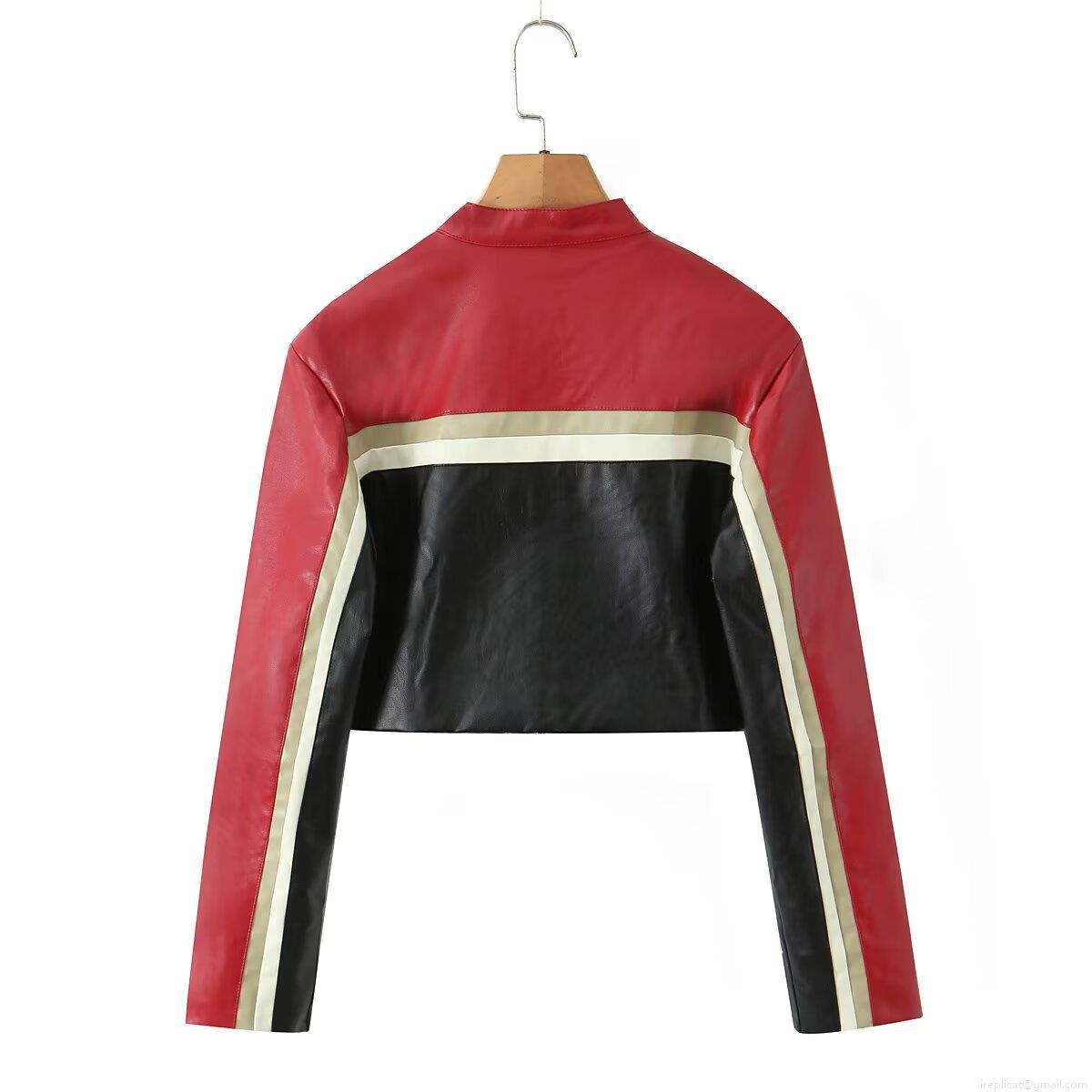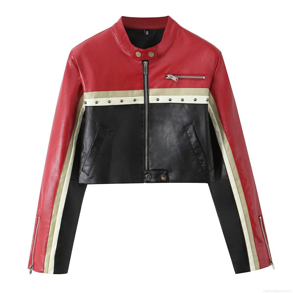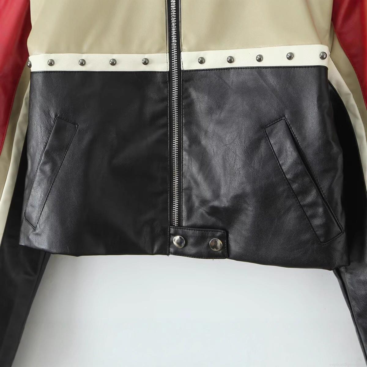 • Women Color Block PU Leather Motorcycle Jacket Stand Collar Short Zip Up Moto Coat Rivet Decor Streetwear Autumn Outerwear