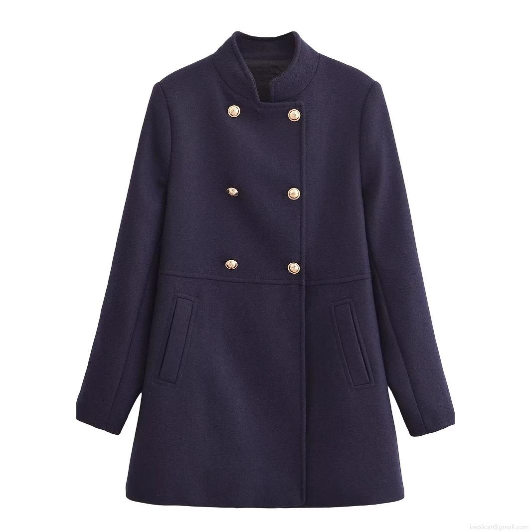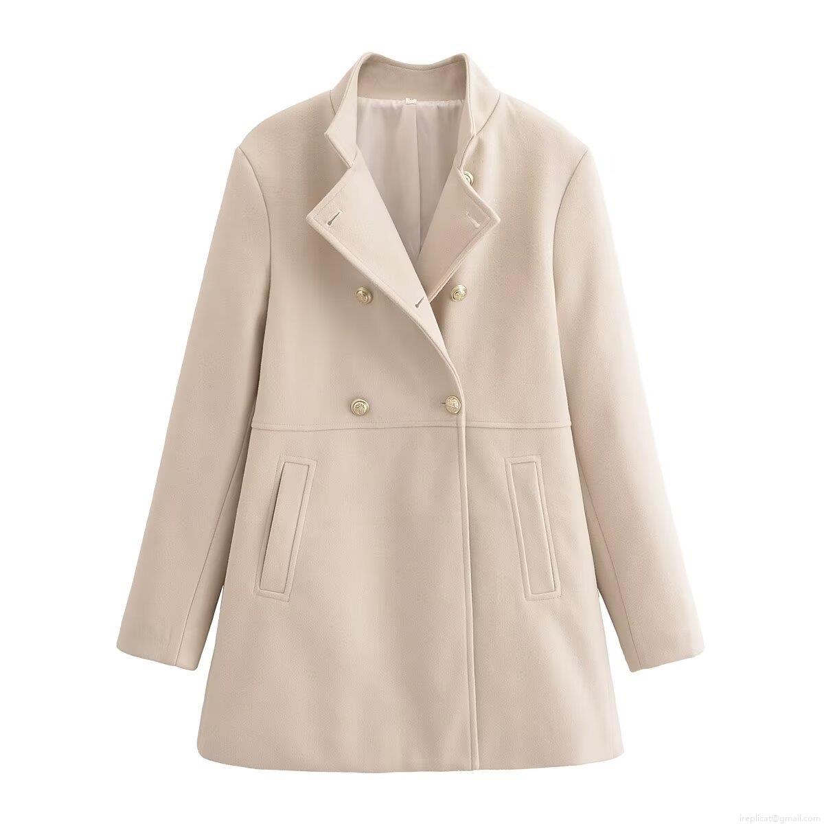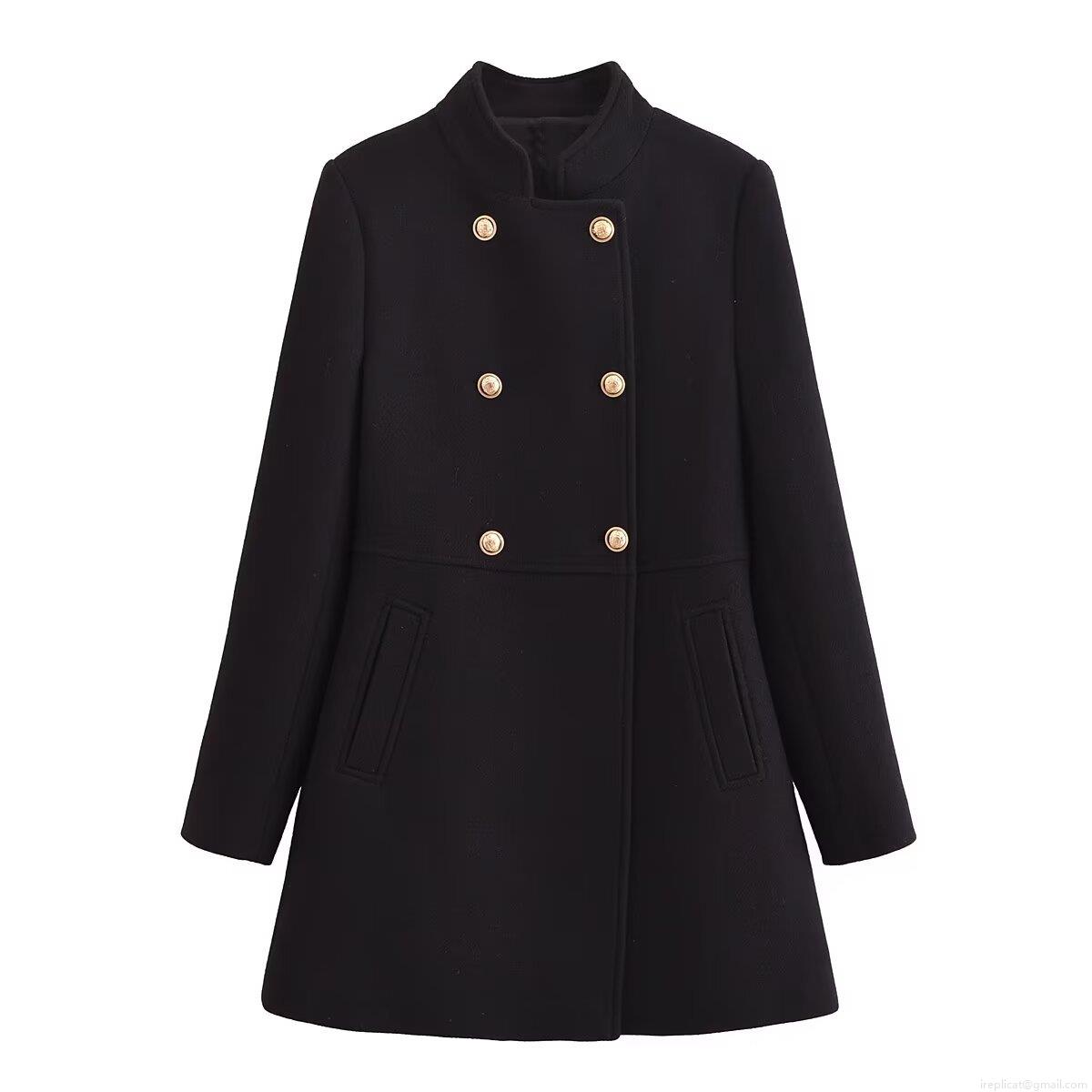 • Women Double Breasted Woolen Coat Stand Collar Gold Button Mid Length Long Sleeve Jacket Elegant Casual Office Solid Color Polyester Blend Overcoat