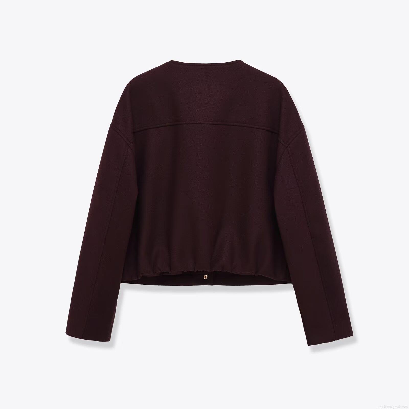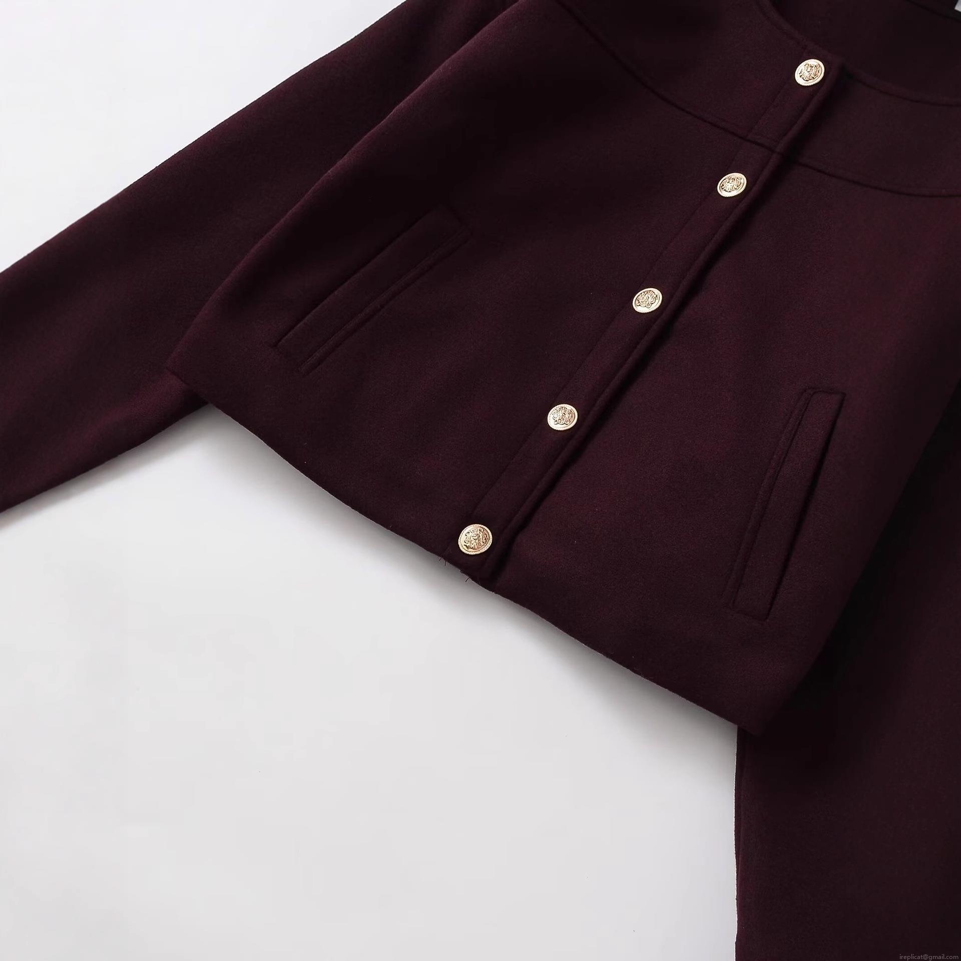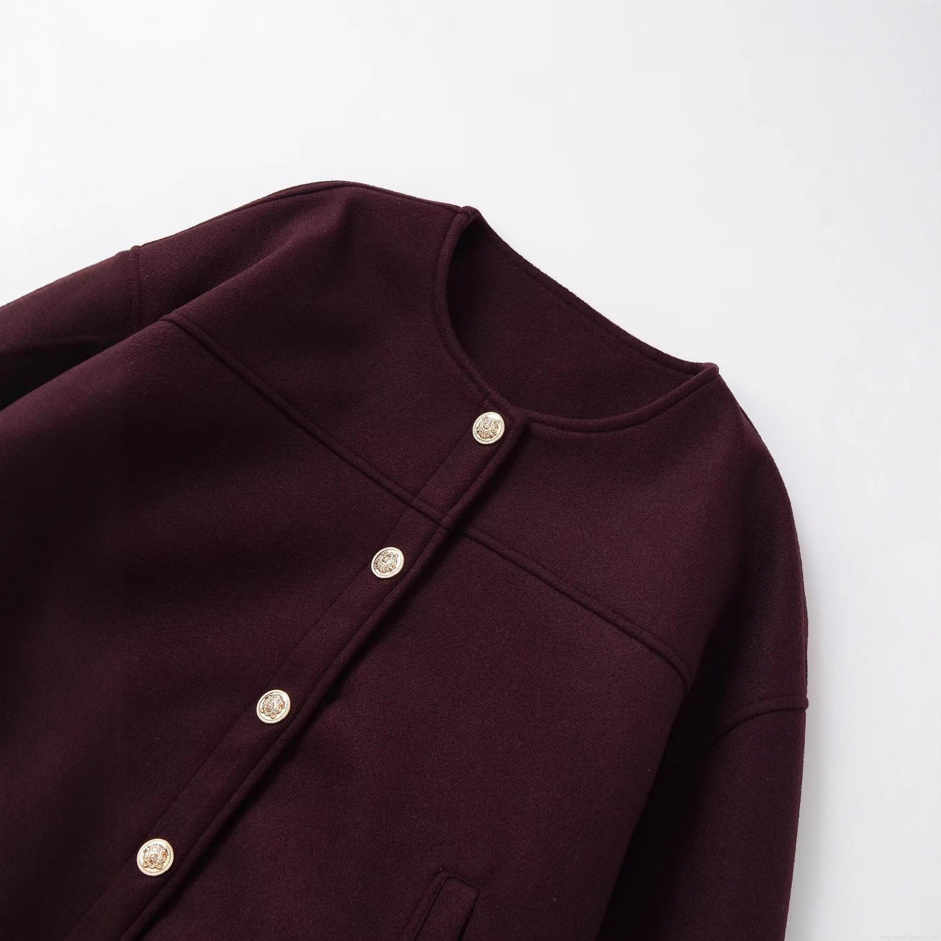 • Women Elegant Burgundy Short Jacket Coat With Gold Embossed Buttons Round Neck Long Sleeve Casual Outerwear Polyester Clothing For Lady