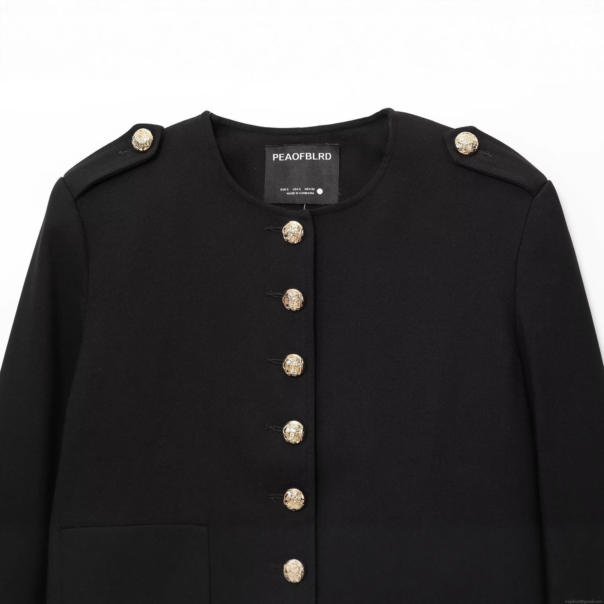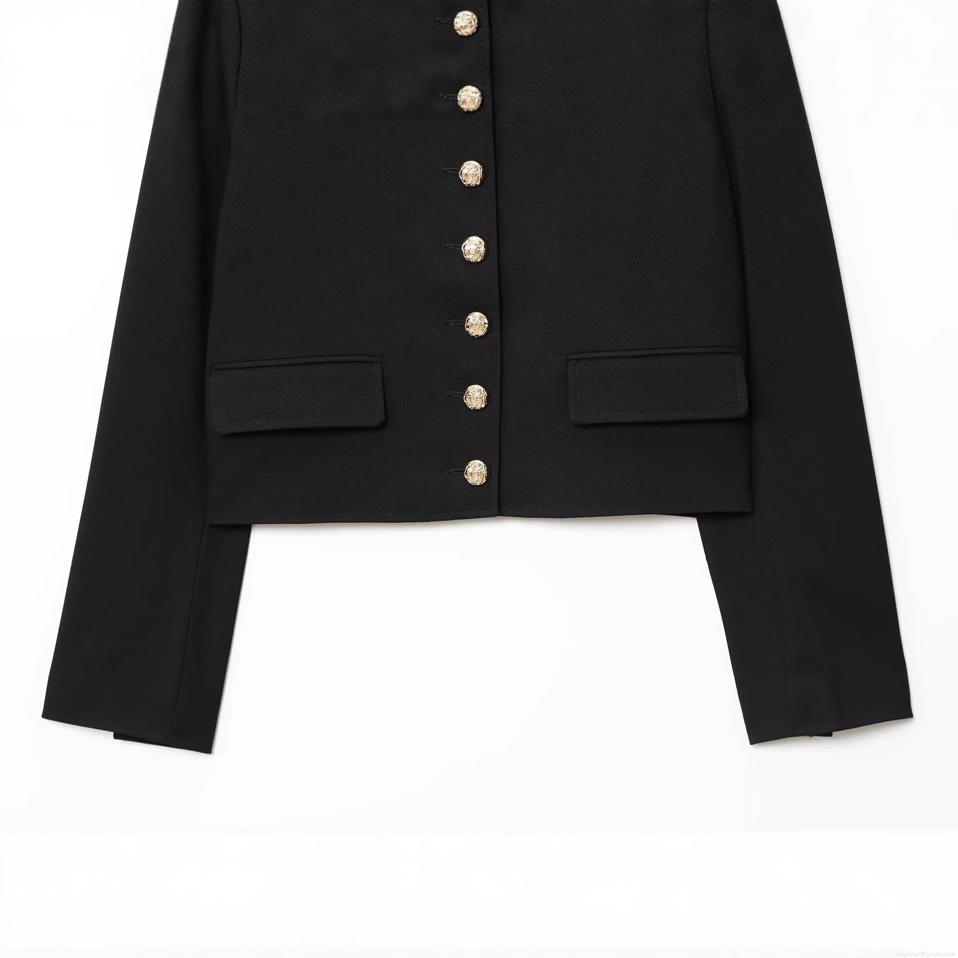 • Women Elegant Chanel Style Short Jacket With Gold Lion Head Buttons Round Neck Long Sleeve Black Tailored Coat For Daily Office Party