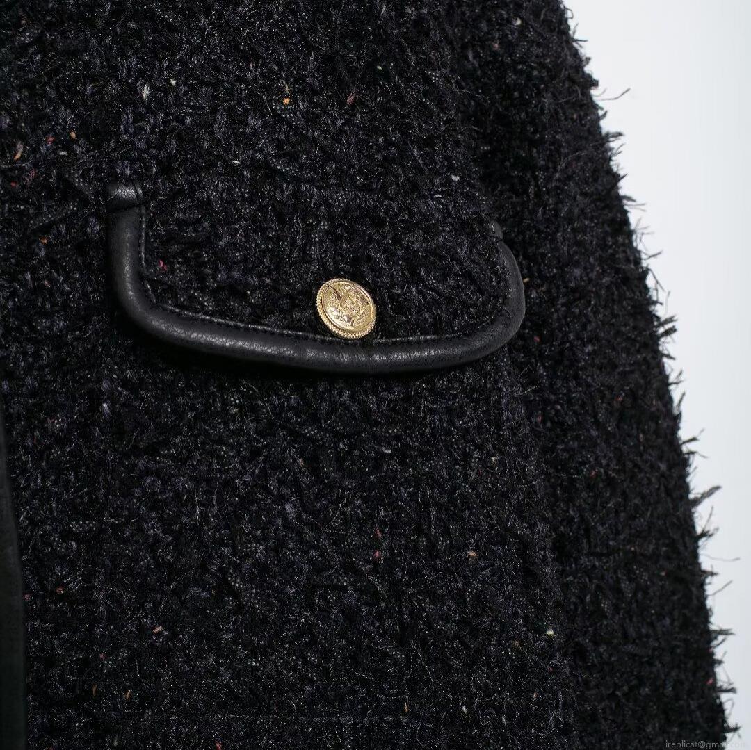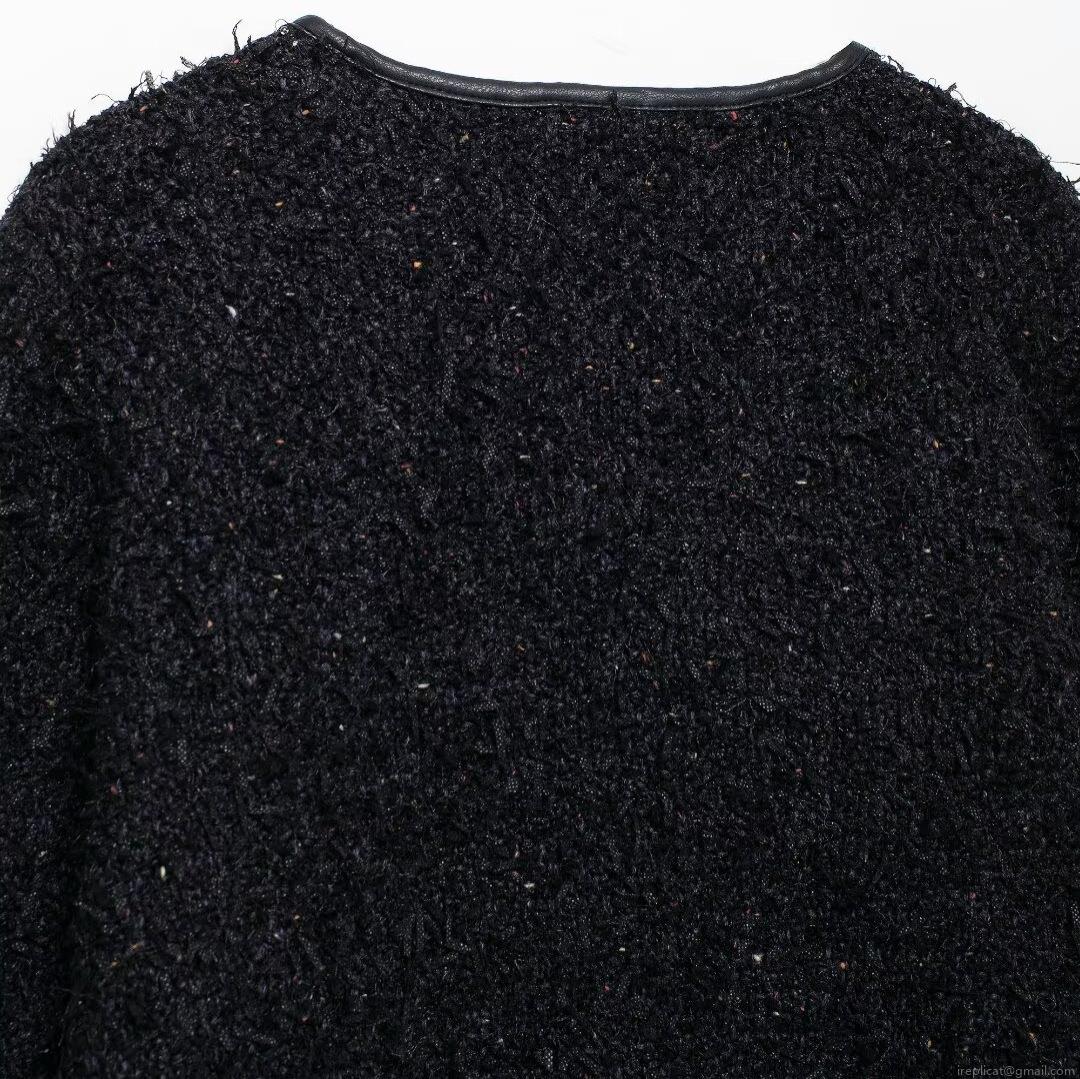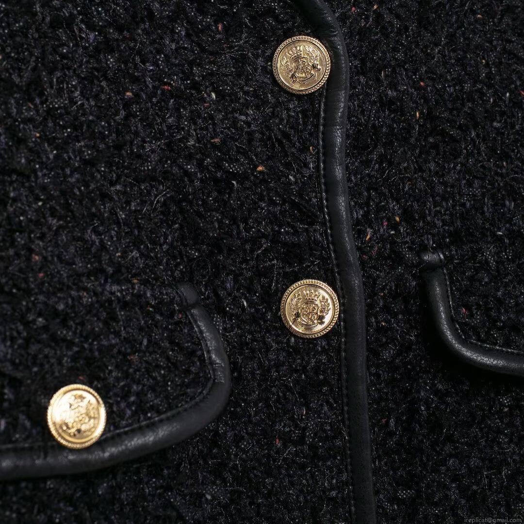 • Women Elegant Chanel Style Tweed Jacket Short Round Neck Long Sleeve Button Up Outerwear With Leather Trim For Office Daily Party Black Fall Cardigan