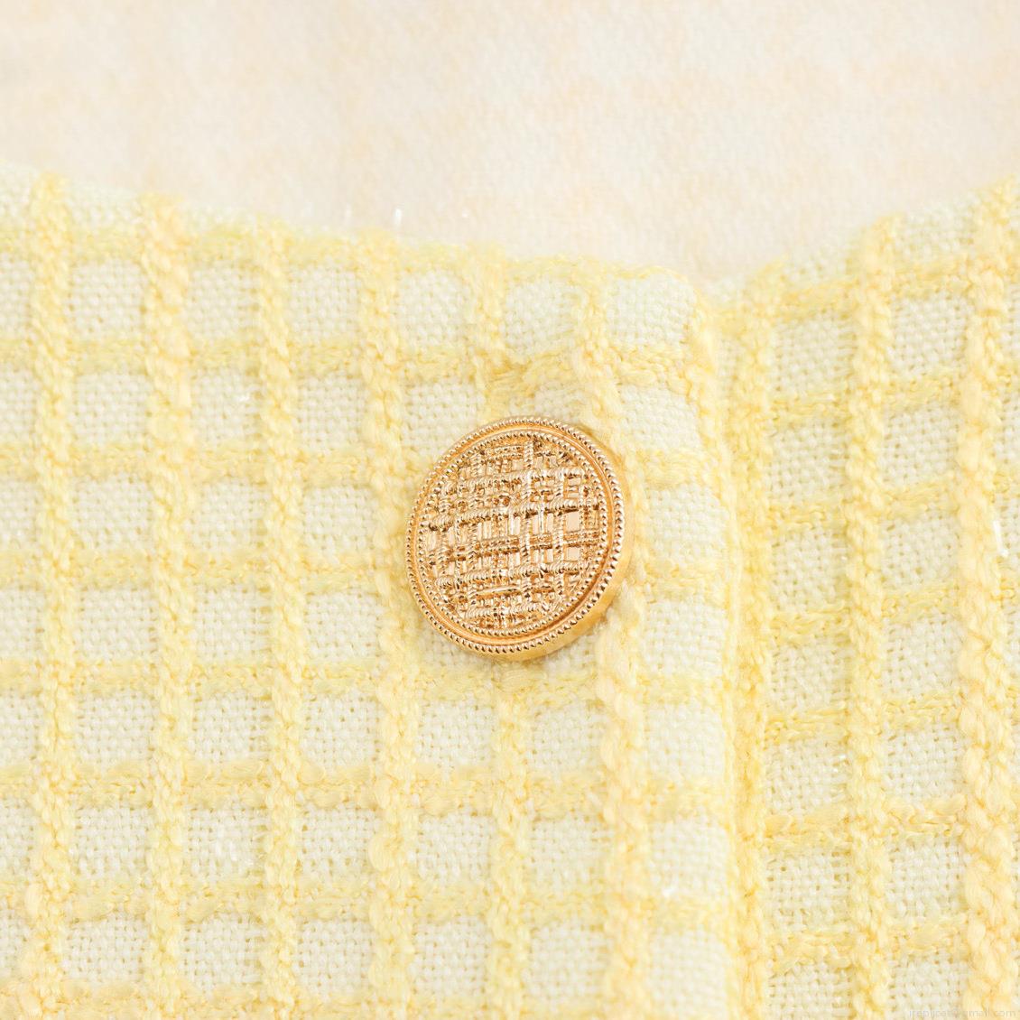 • Women Elegant Cheese Yellow Tweed Short Jacket Round Neck Gold Button Decor Long Sleeve Pocket Outerwear Autumn Winter Lady Top