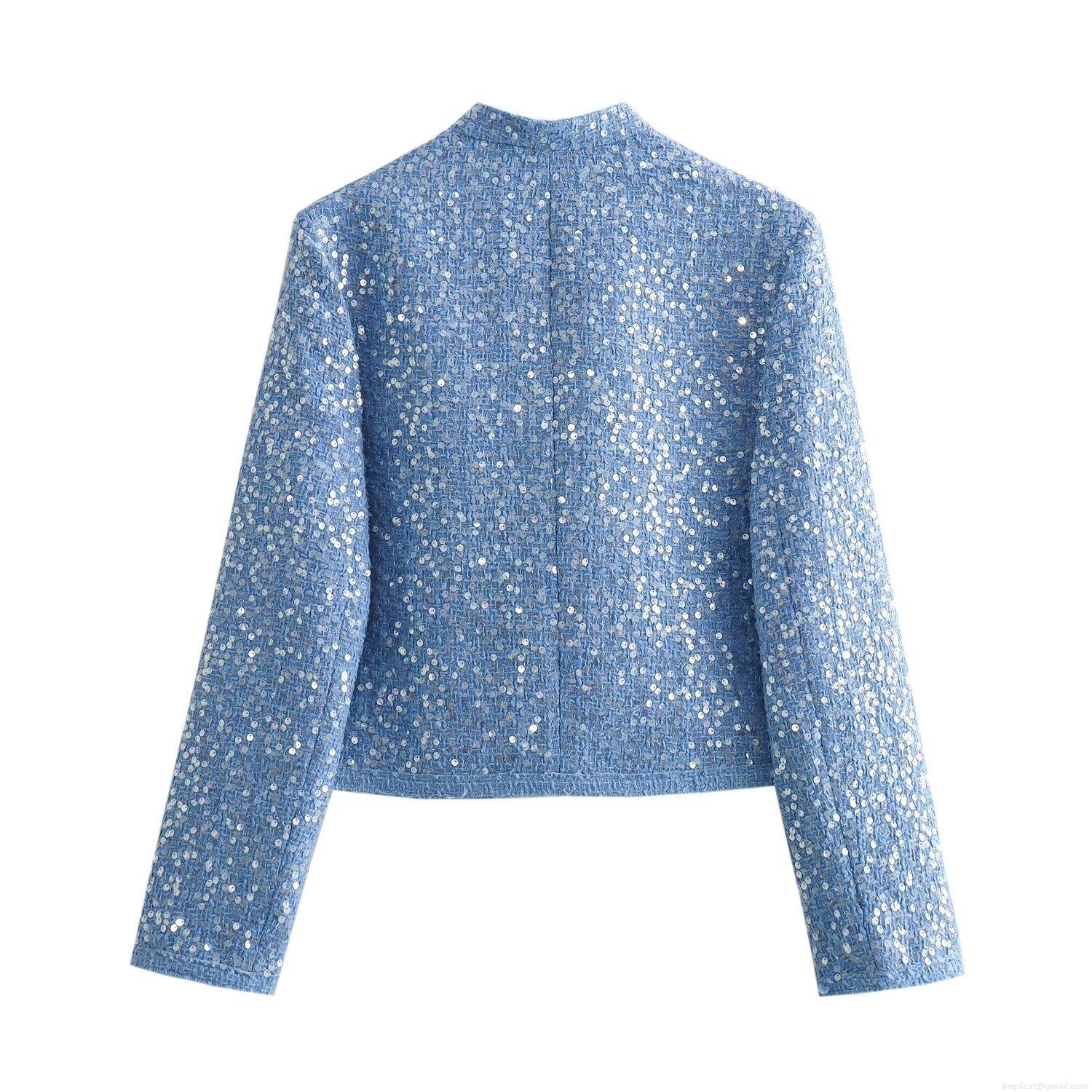 Women Elegant Light Blue Sequin Tweed Jacket Shiny Glitter Short Coat Long Sleeve Stand Collar Zipper Outwear For Party Daily Autumn Winter