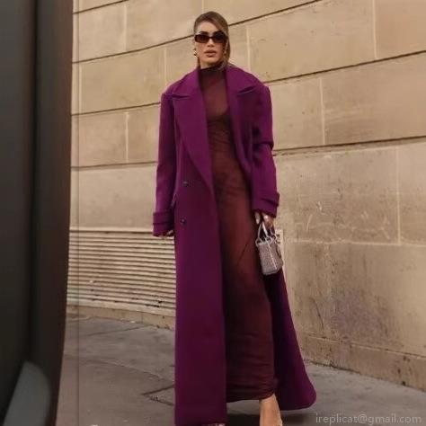 • Women Elegant Long Woolen Coat Double Breasted Notched Lapel Loose Fit Winter Overcoat Rose Red Maxi Outerwear Solid Color Long Sleeve Jacket
