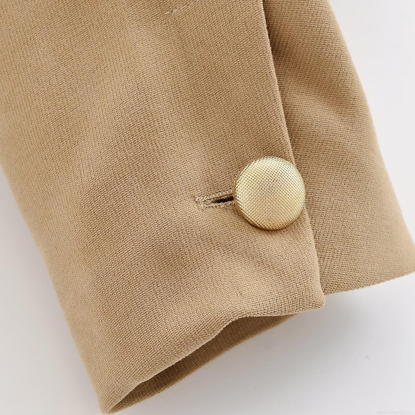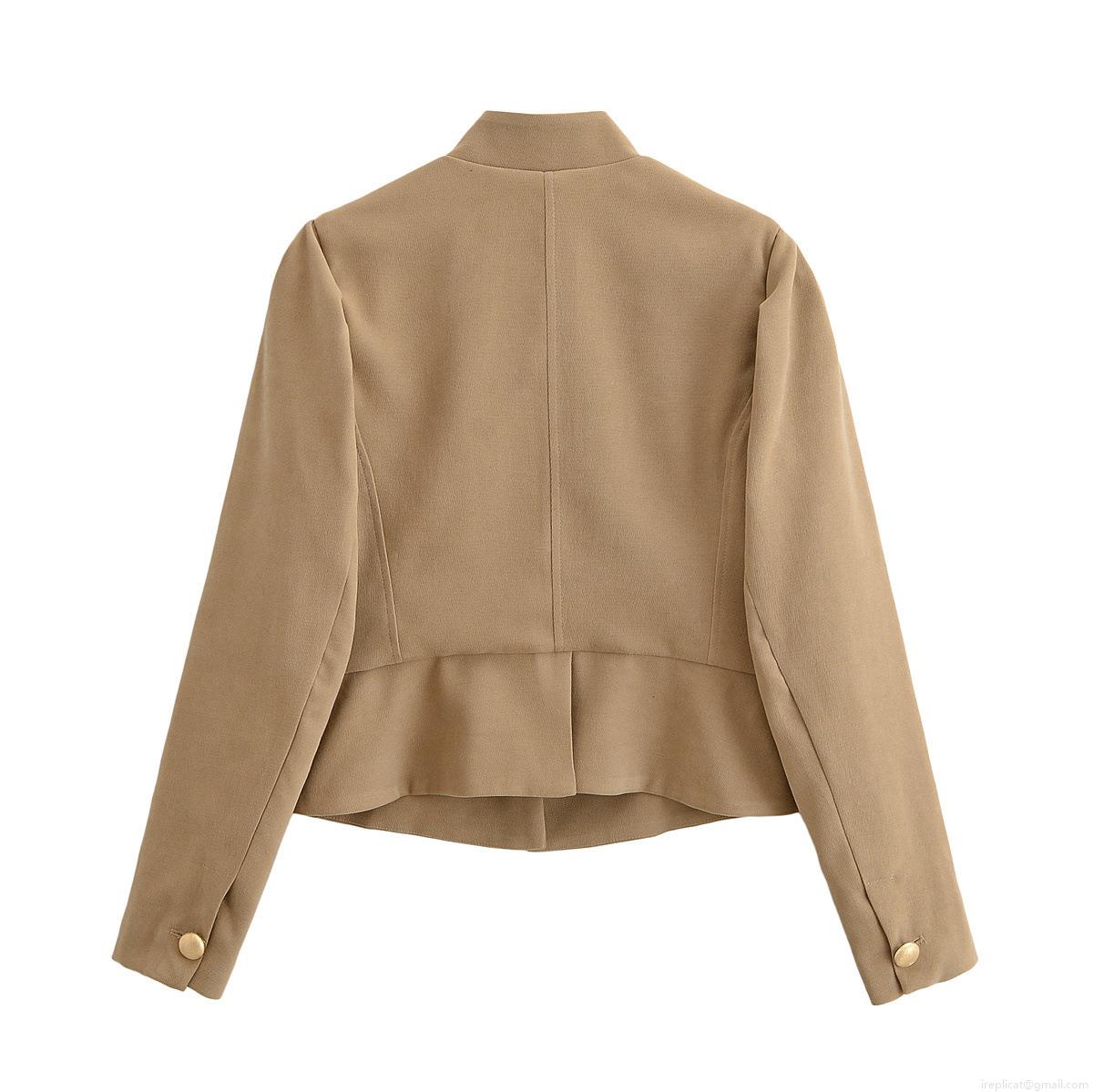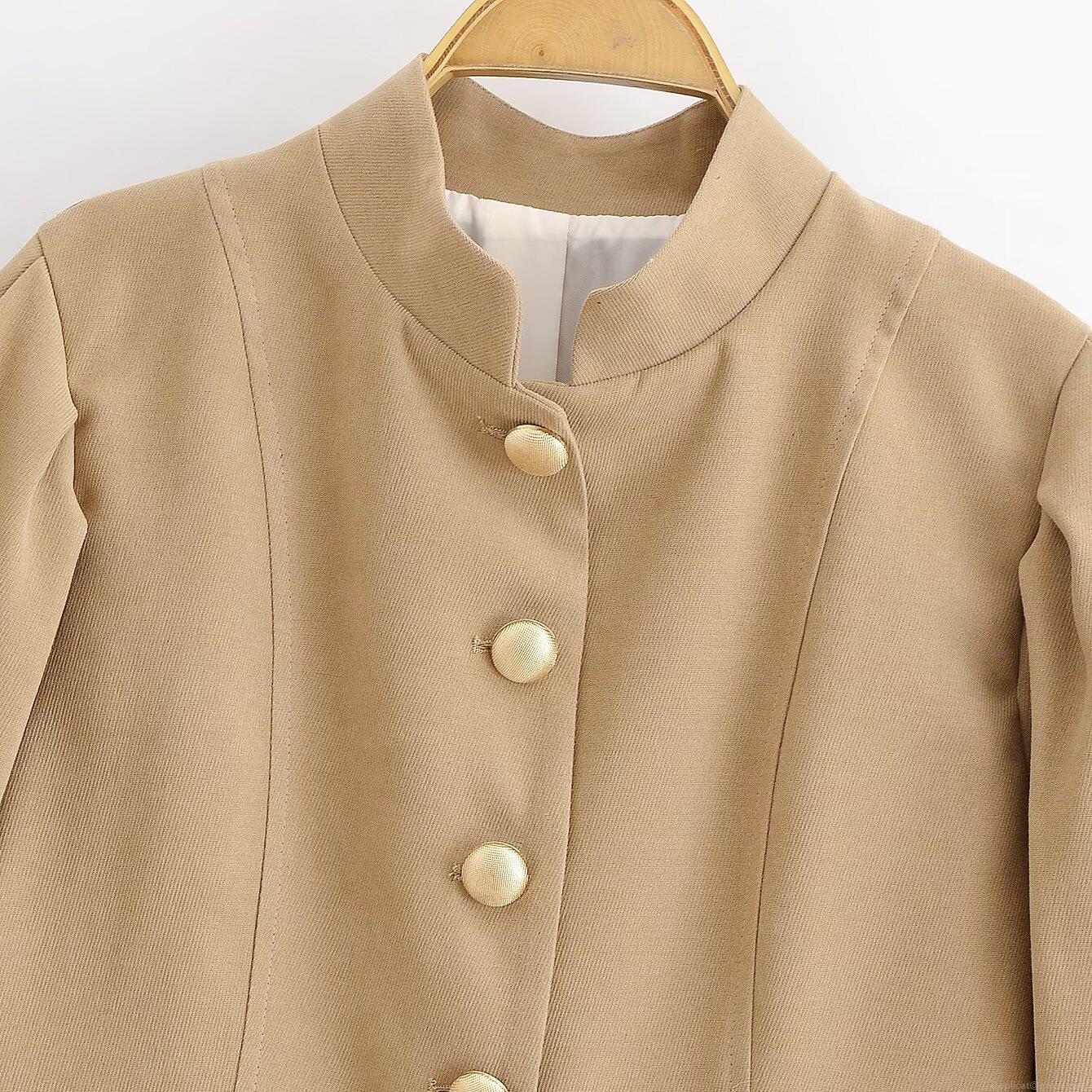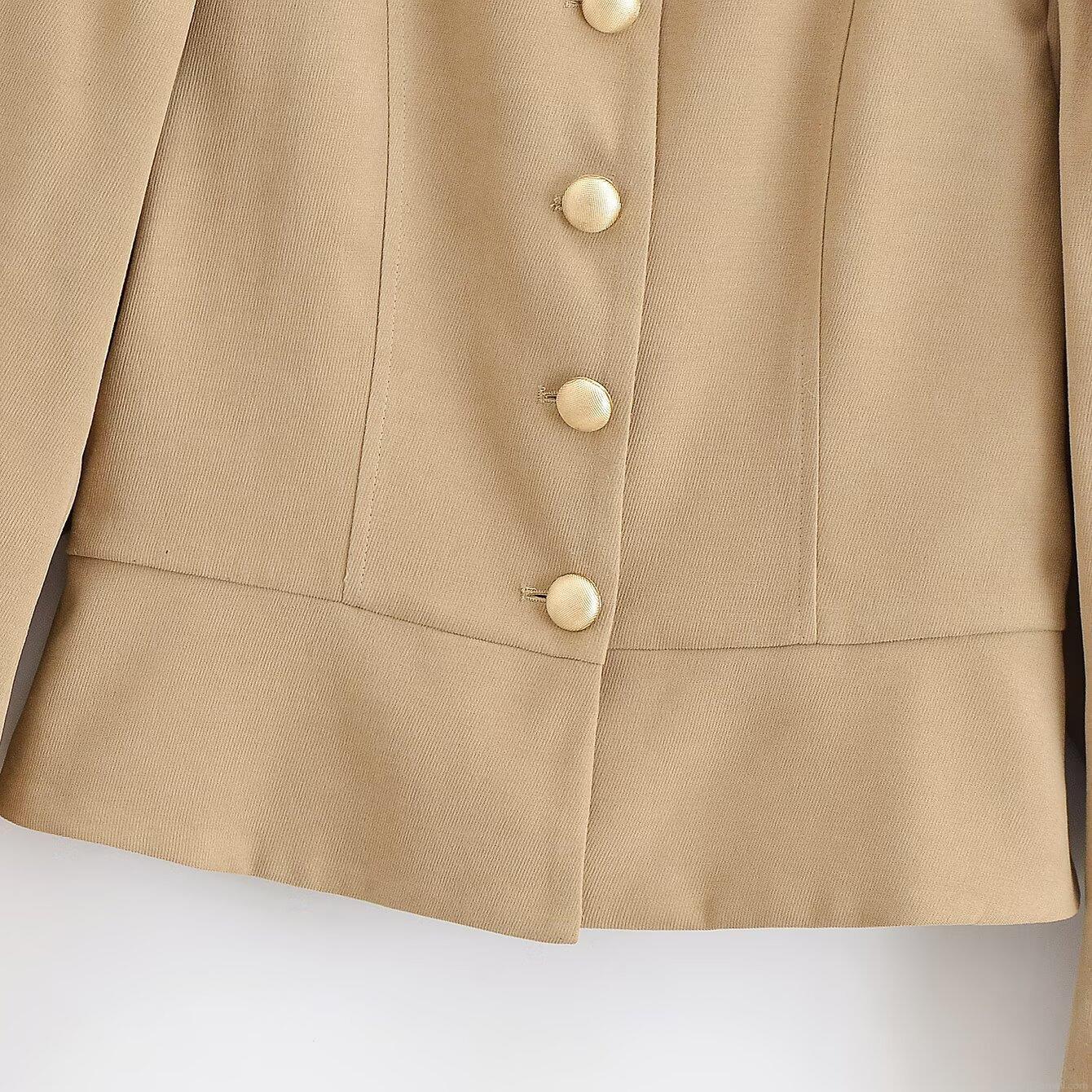 • Women Elegant Solid Khaki Short Blazer Jacket With Gold Buttons Peplum Hem Stand Collar Long Sleeve Office Commuter Outwear Polyester Coat