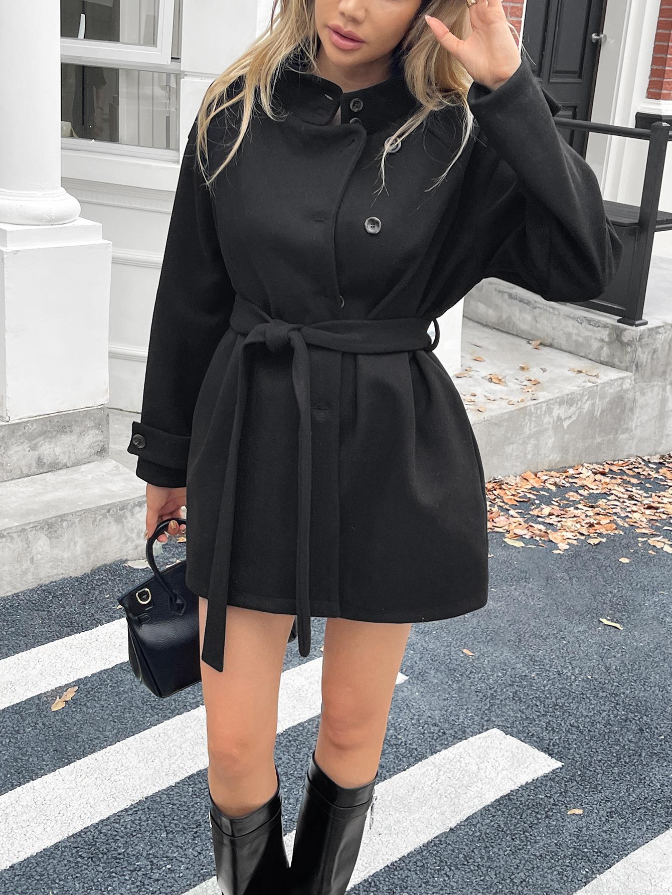 • Women Elegant Stand Collar Belted Woolen Coat Autumn Winter Thick Long Sleeve Single Breasted Mid-length Polyester Viscose Blend Overcoat For Casual Office Lady
