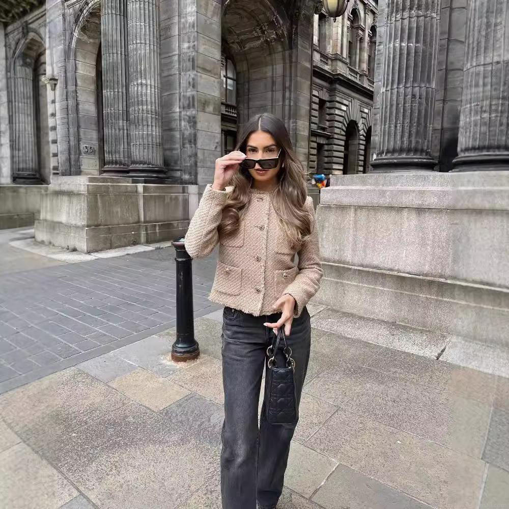 Women Elegant Tweed Jacket With Gold Buttons Long Sleeve Fringe Trimmed Short Coat Chanel Style Outerwear Slim Fit For Office Party Ladies Fashion
