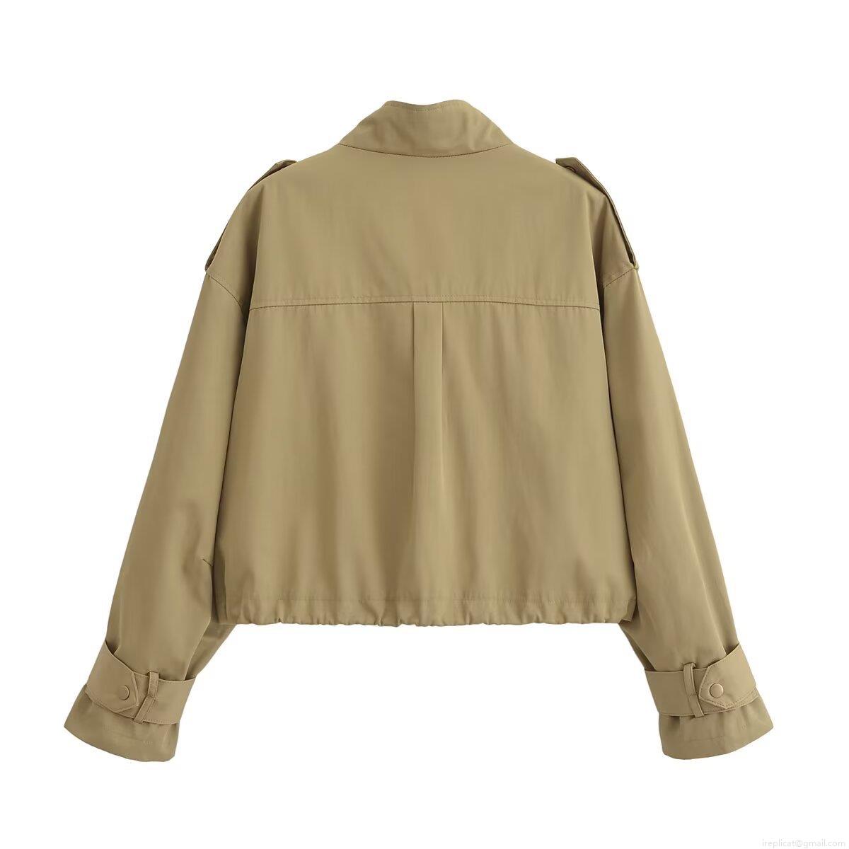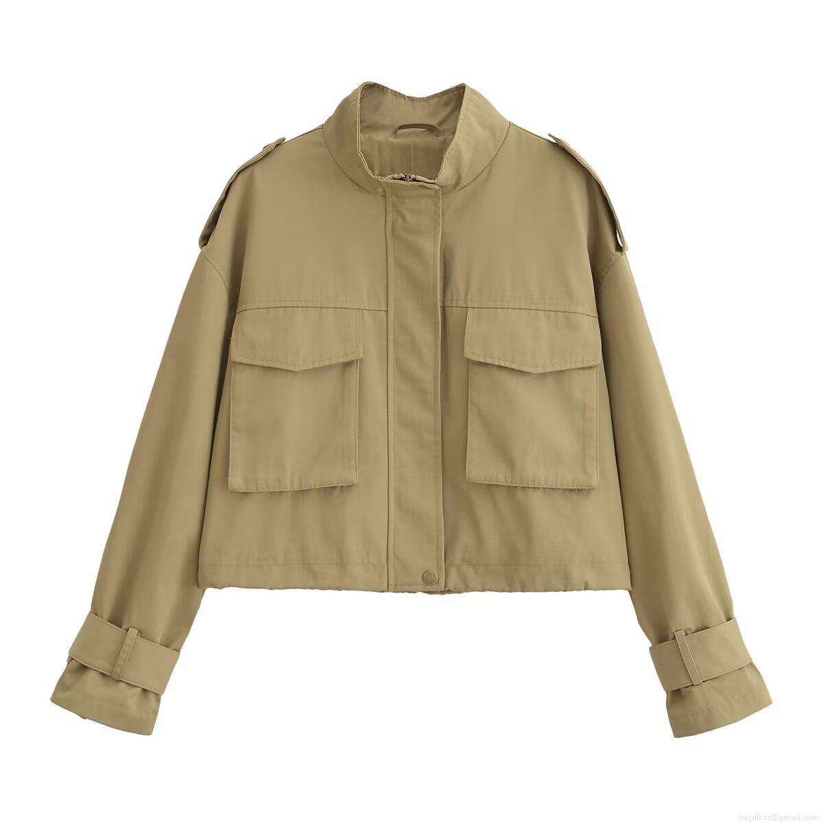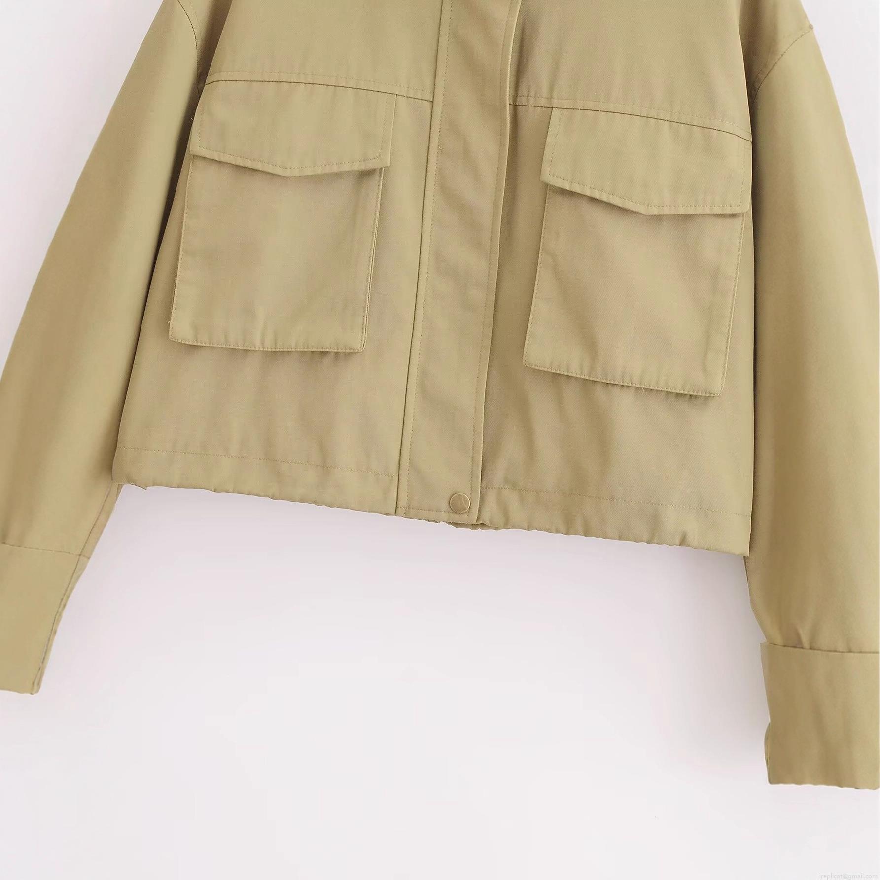 • Women European Street Style Utility Jacket Loose Fit Stand Collar Long Sleeve Patchwork Baseball Uniform Large Pockets Khaki Autumn Outerwear Coat