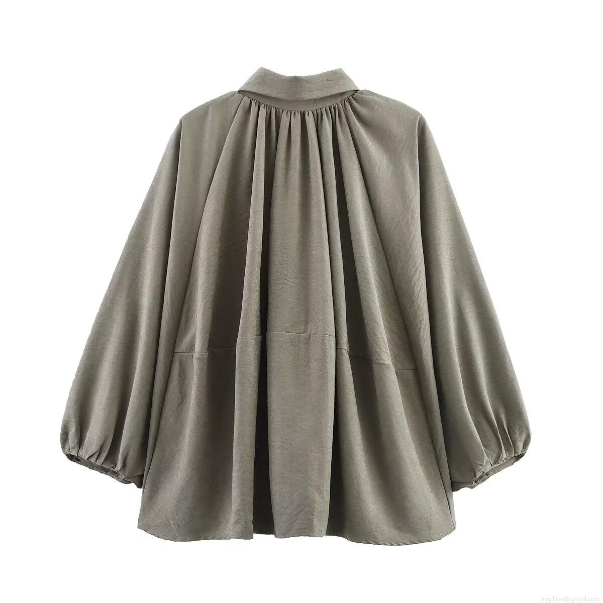 Women European Style Moss Green Puffy Bomber Jacket 100% Polyester Lapel Zipper Lantern Sleeve Loose Fit Pleated Shoulder Outerwear Streetwear For Women
