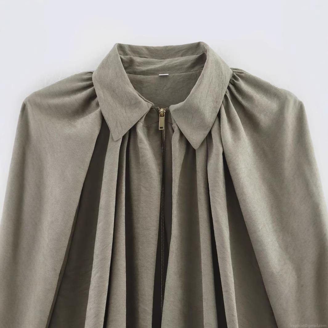 • Women European Style Moss Green Puffy Bomber Jacket 100% Polyester Lapel Zipper Lantern Sleeve Loose Fit Pleated Shoulder Outerwear Streetwear For Women