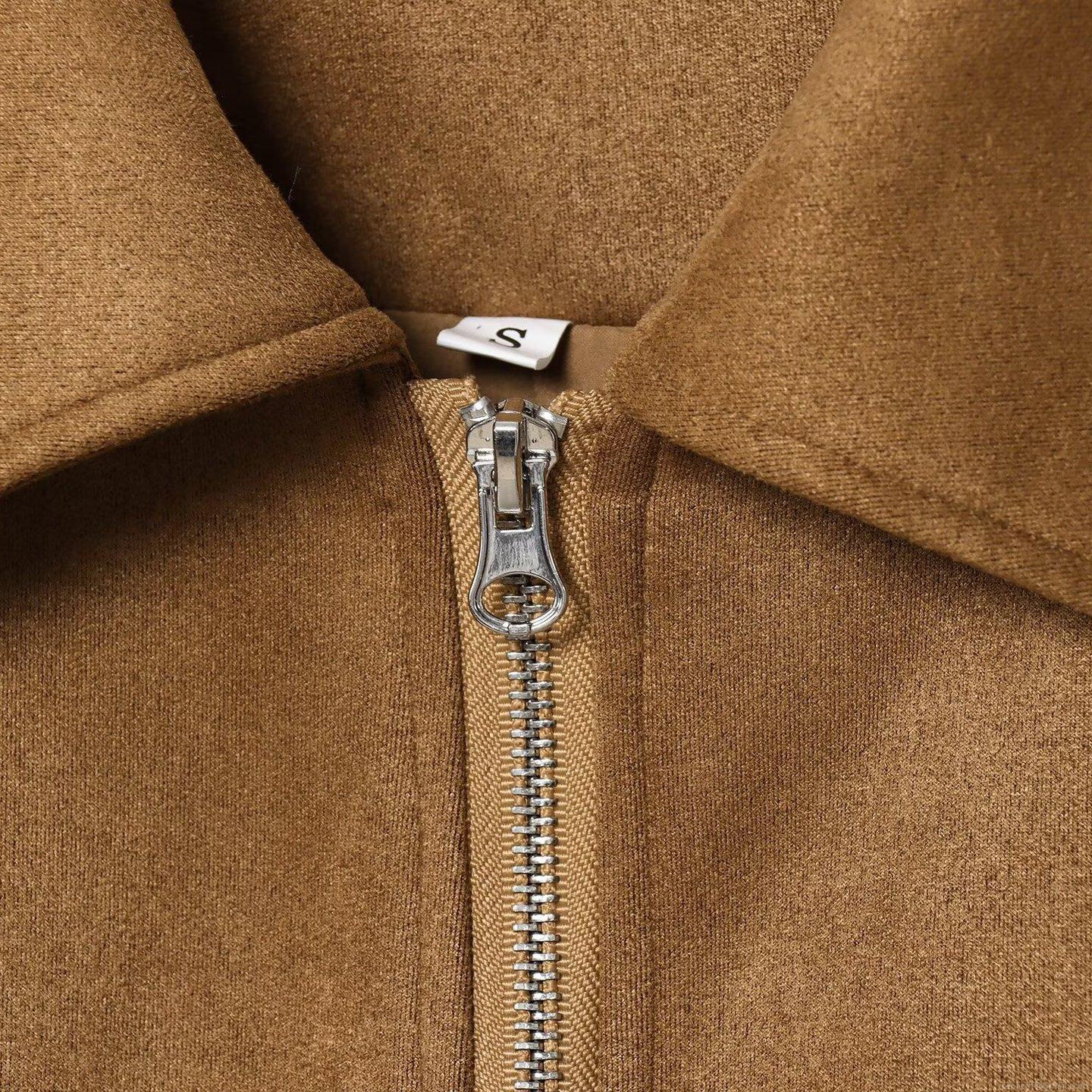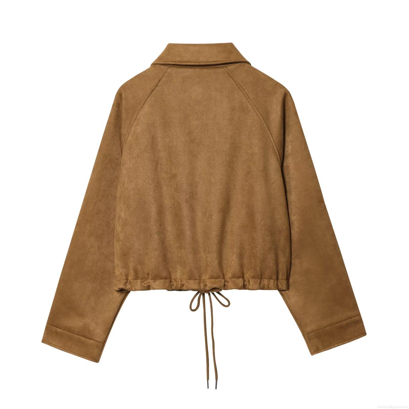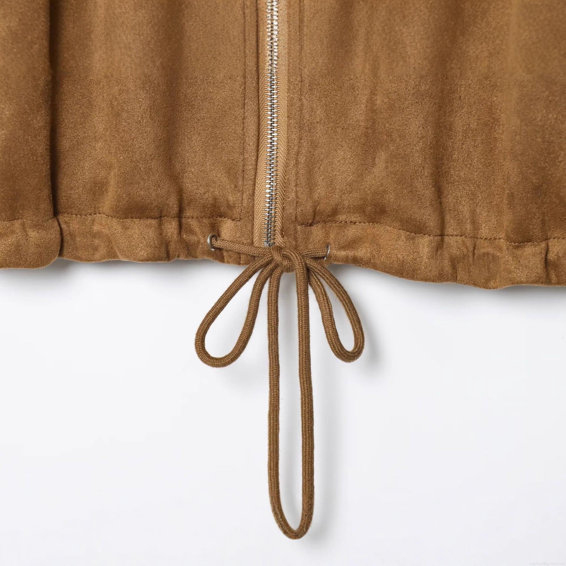 • Women European Style Suede Jacket Brown Solid Color Lapel Collar Metal Zipper Outerwear Long Sleeve Drawstring Hem Loose Fit Casual Streetwear Autumn Winter Coat For Women