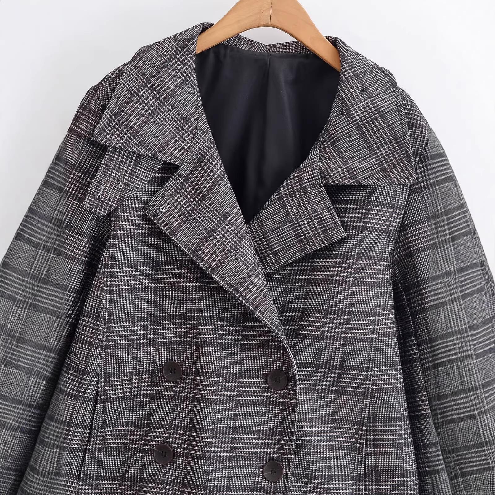 • Women Fashion Double Breasted Plaid Jacket Outerwear Classic Notched Lapel Prince of Wales Check Long Sleeve Loose Fit Casual Coat Streetwear For Ladies
