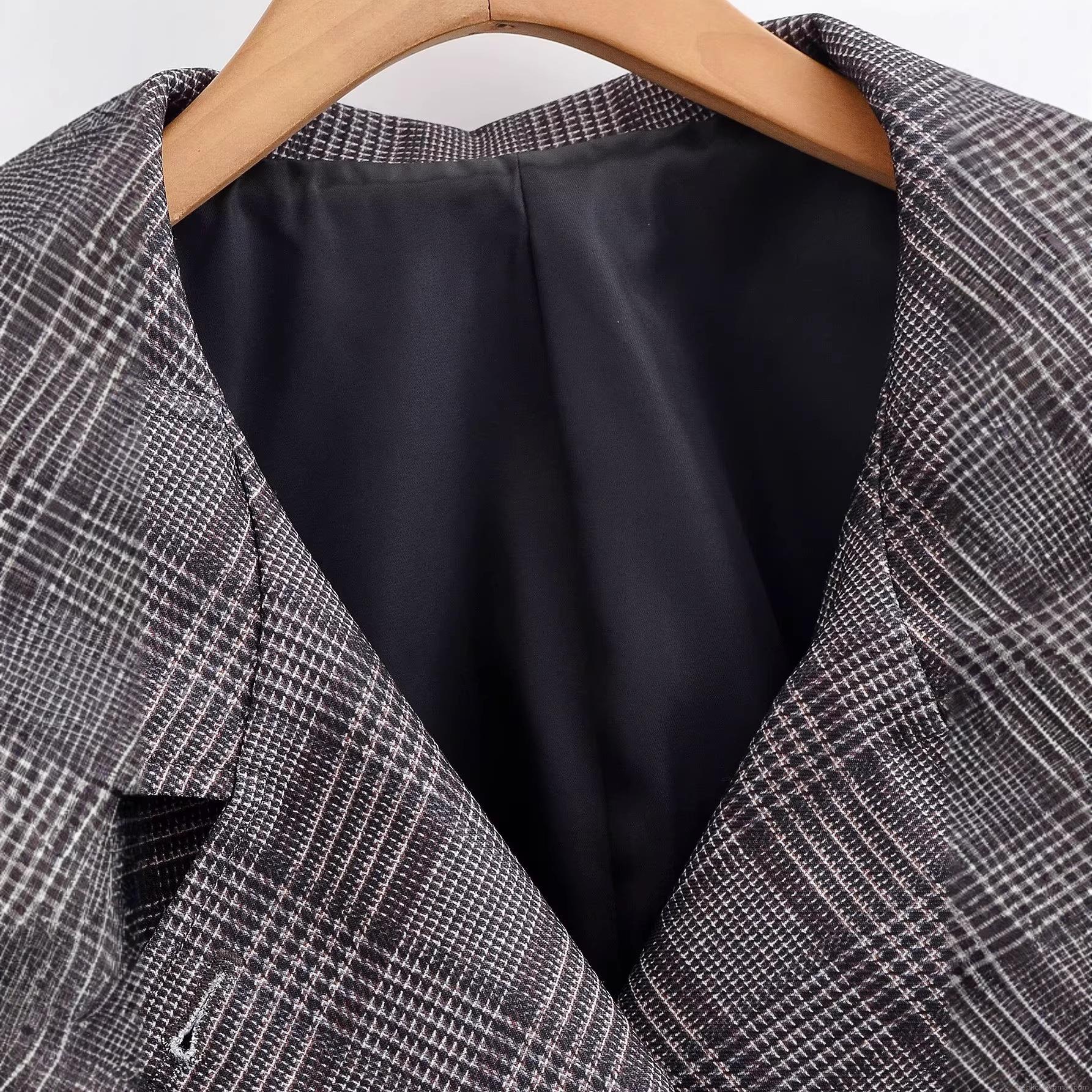 Women Fashion Double Breasted Plaid Jacket Outerwear Classic Notched Lapel Prince of Wales Check Long Sleeve Loose Fit Casual Coat Streetwear For Ladies