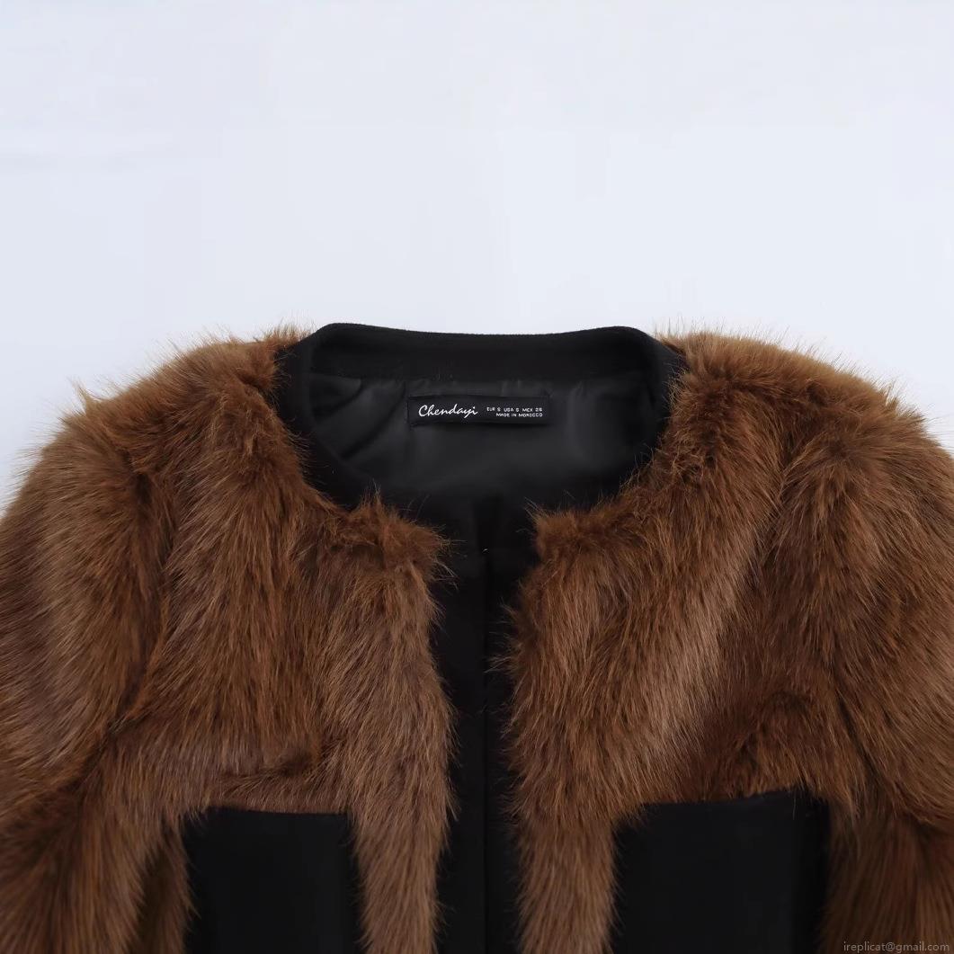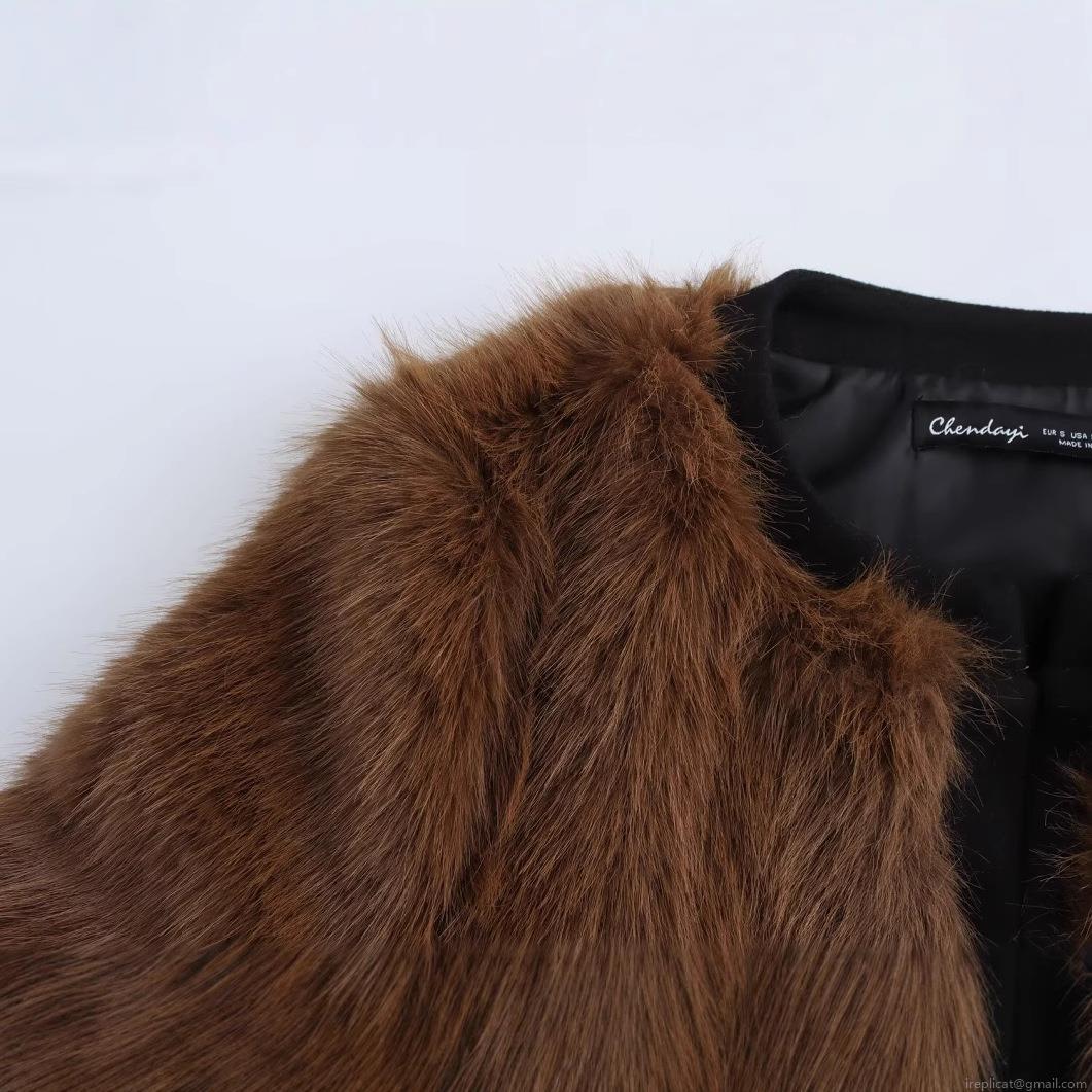 • Women Fashion Faux Fur Jacket Dark Brown Round Neck Long Sleeve Button Coat Streetwear Autumn Winter Warm Outerwear With Black Trim