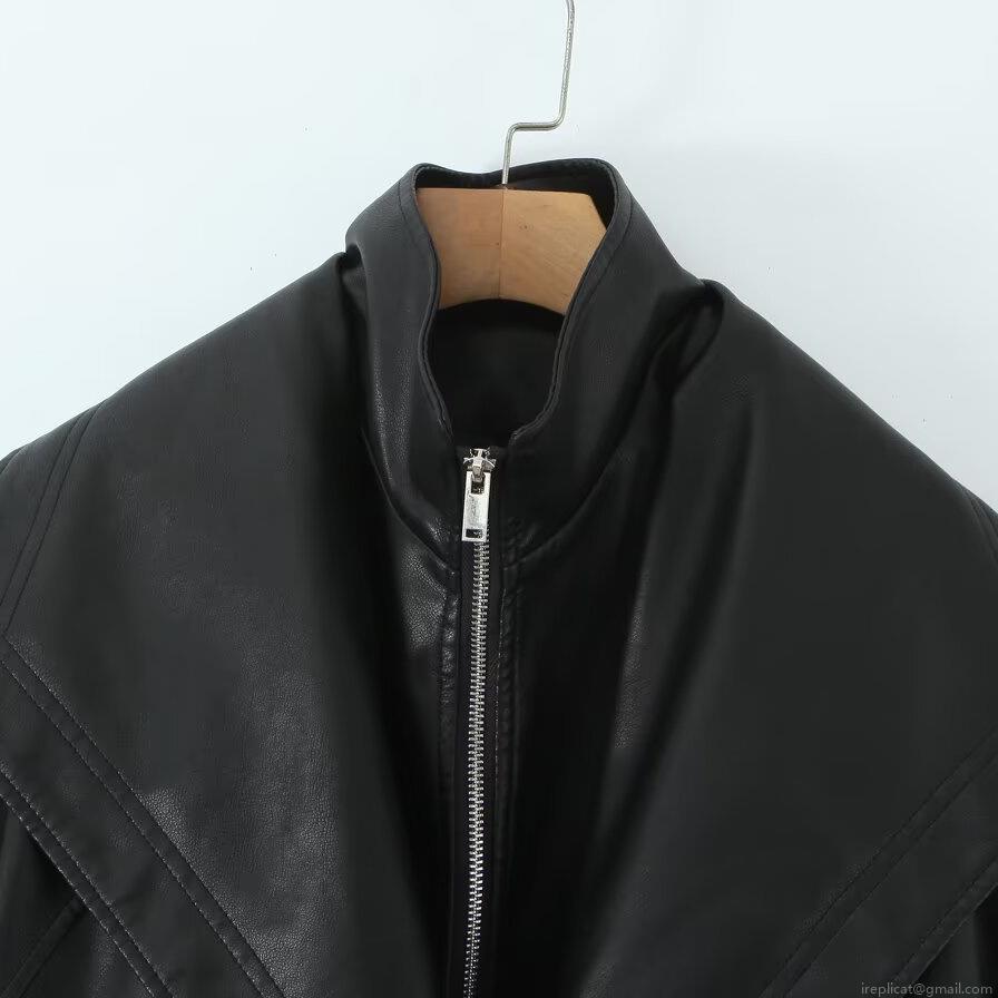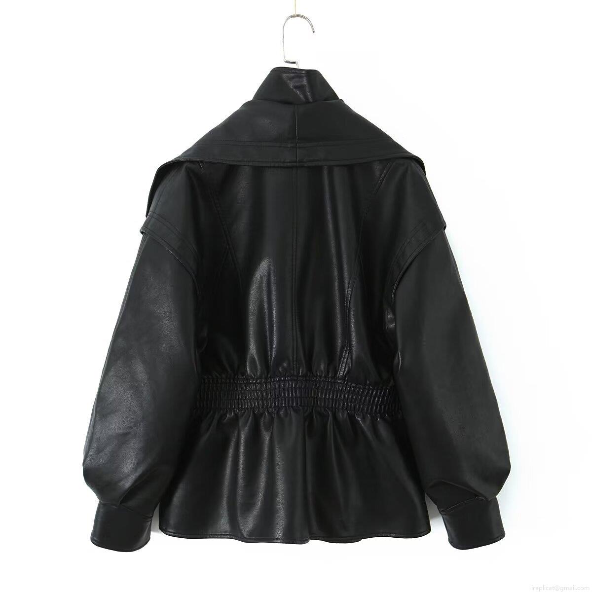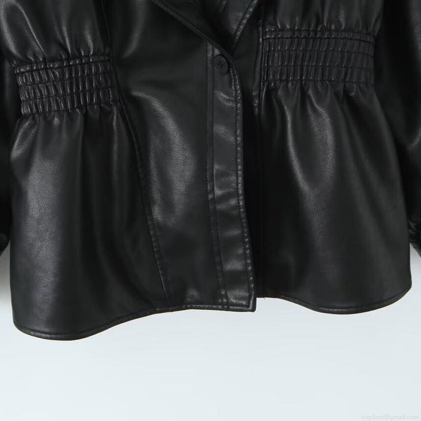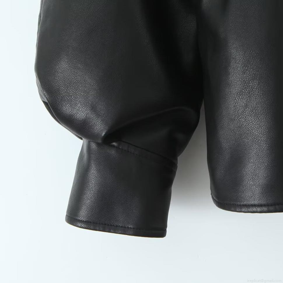 • Women Fashion Faux PU Leather Jacket Modern Waist Cinching Lantern Sleeve Large Lapel Zipper Short Outerwear For Ladies Commuter Style Autumn Winter Coat