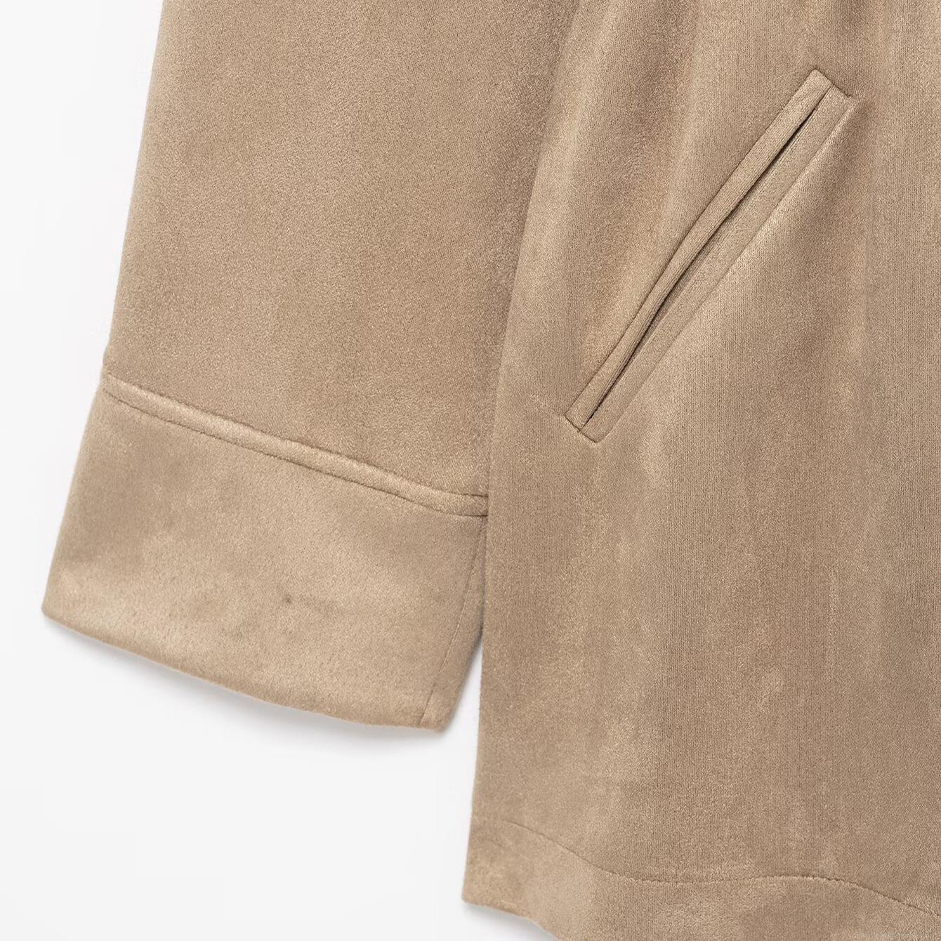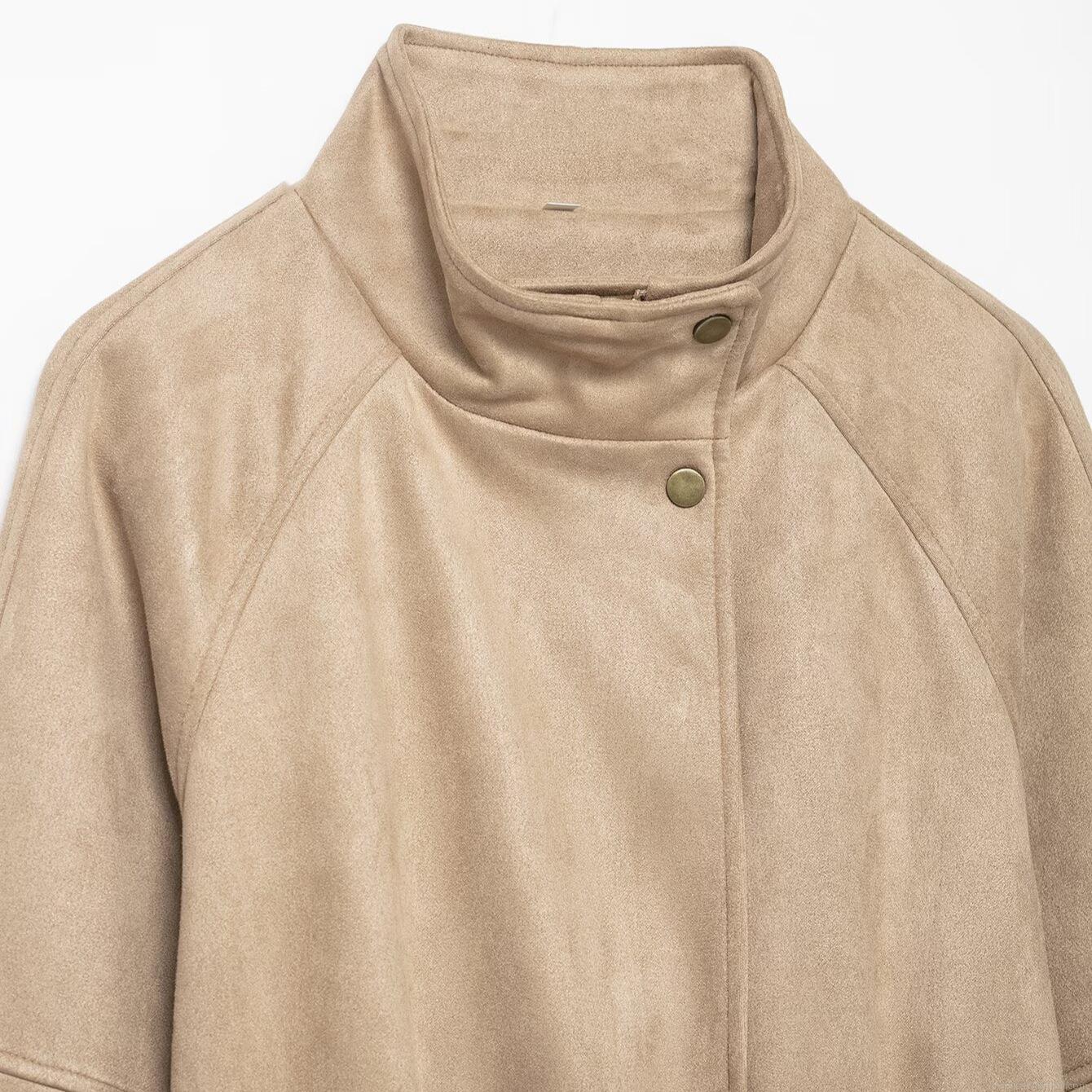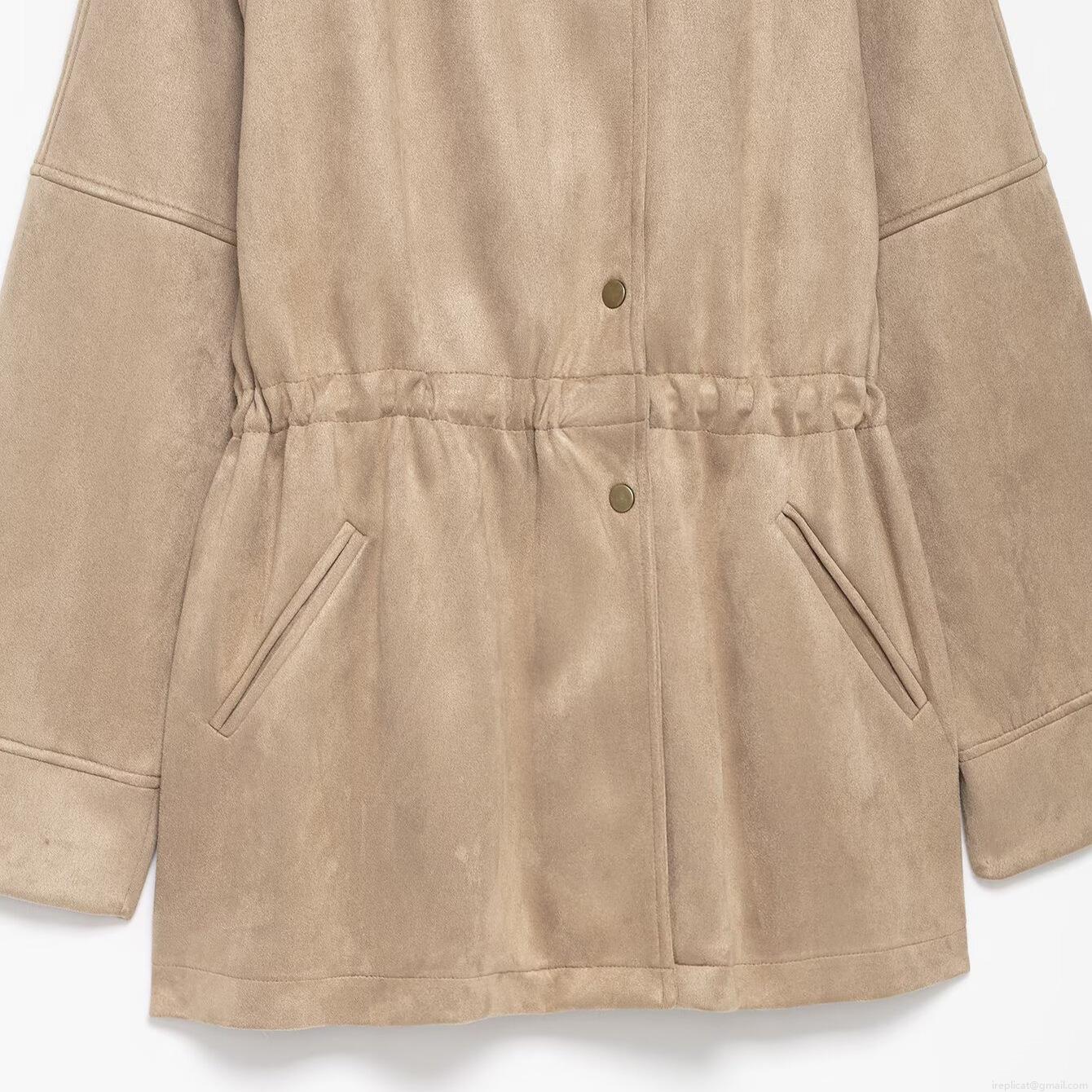 • Women Fashion Faux Suede Mid-Length Jacket Stand Collar Drawstring Waist Slimming Coat Casual Loose Long Sleeve Khaki Solid Color Outerwear For Women Winter