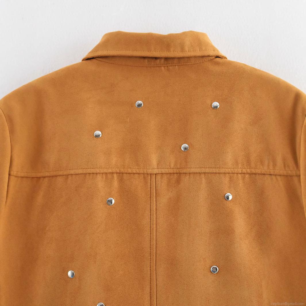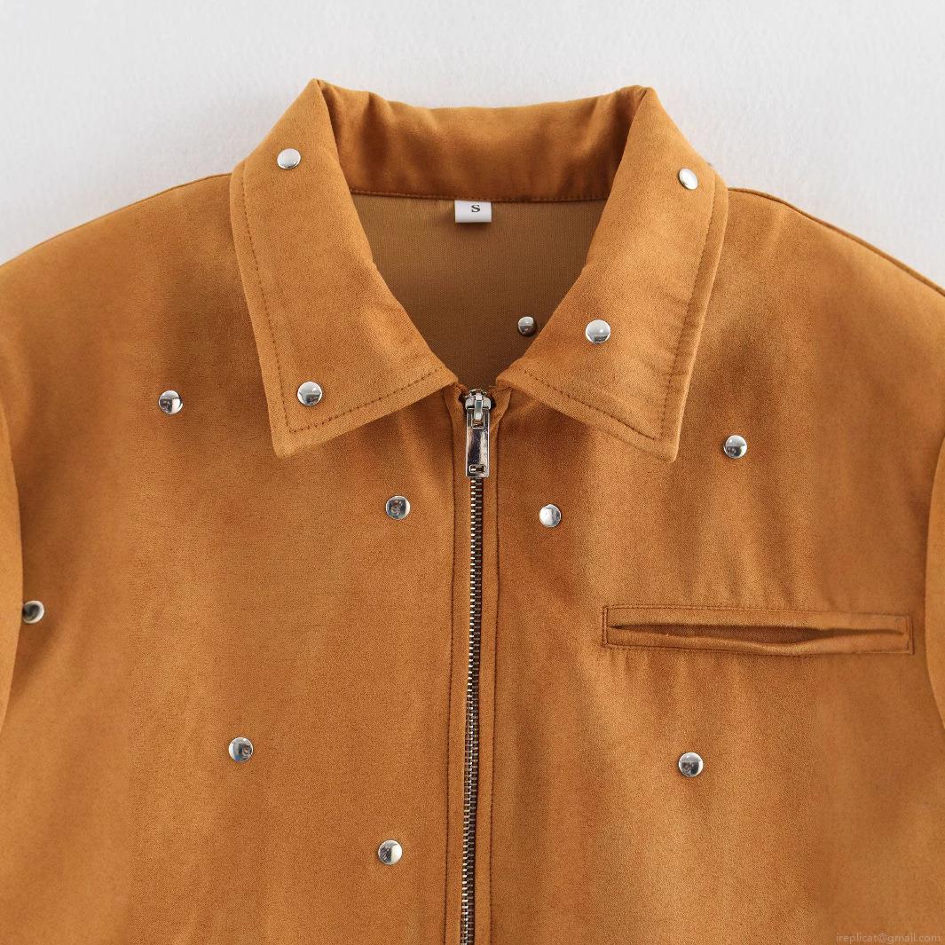 • Women Fashion Faux Suede Rivet Short Jacket Turn-down Collar Zipper Closure Streetwear Casual Spring Autumn Coat Long Sleeve Solid Color Outerwear