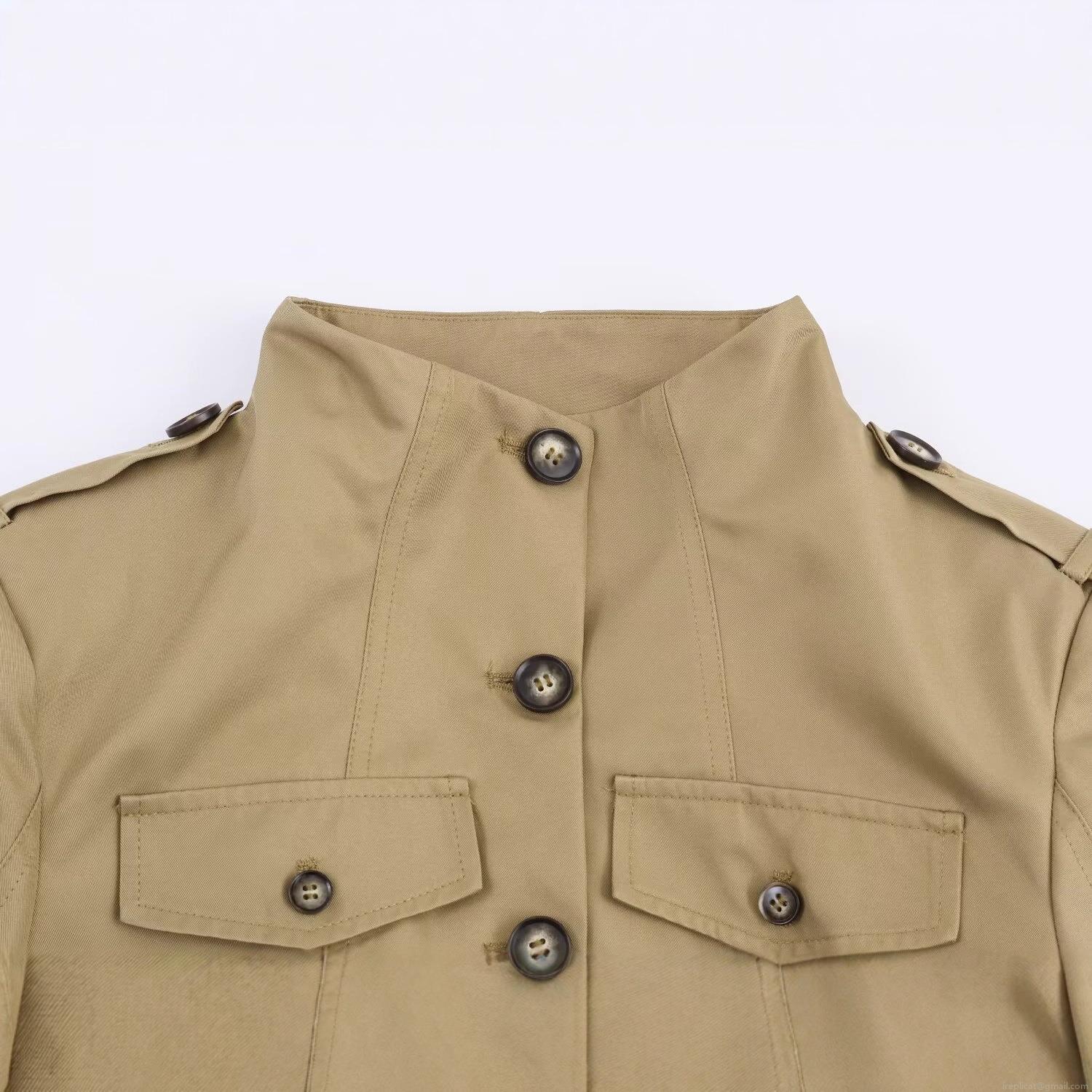 • Women Fashion Khaki Stand Collar Safari Jacket With Waist Tie Belt Epaulettes Casual Long Sleeve Polyester Twill Outerwear For Lady Daily Office