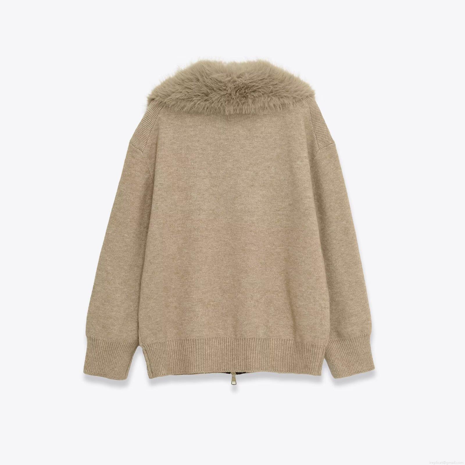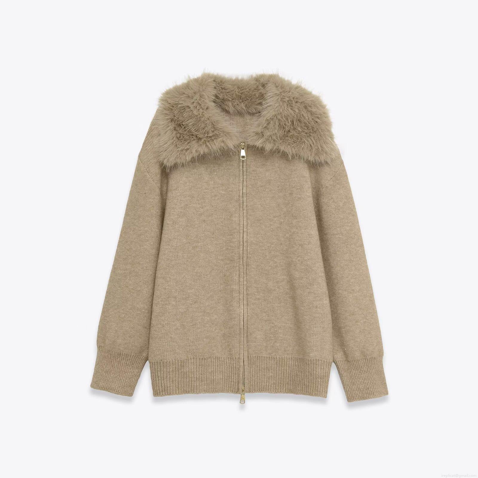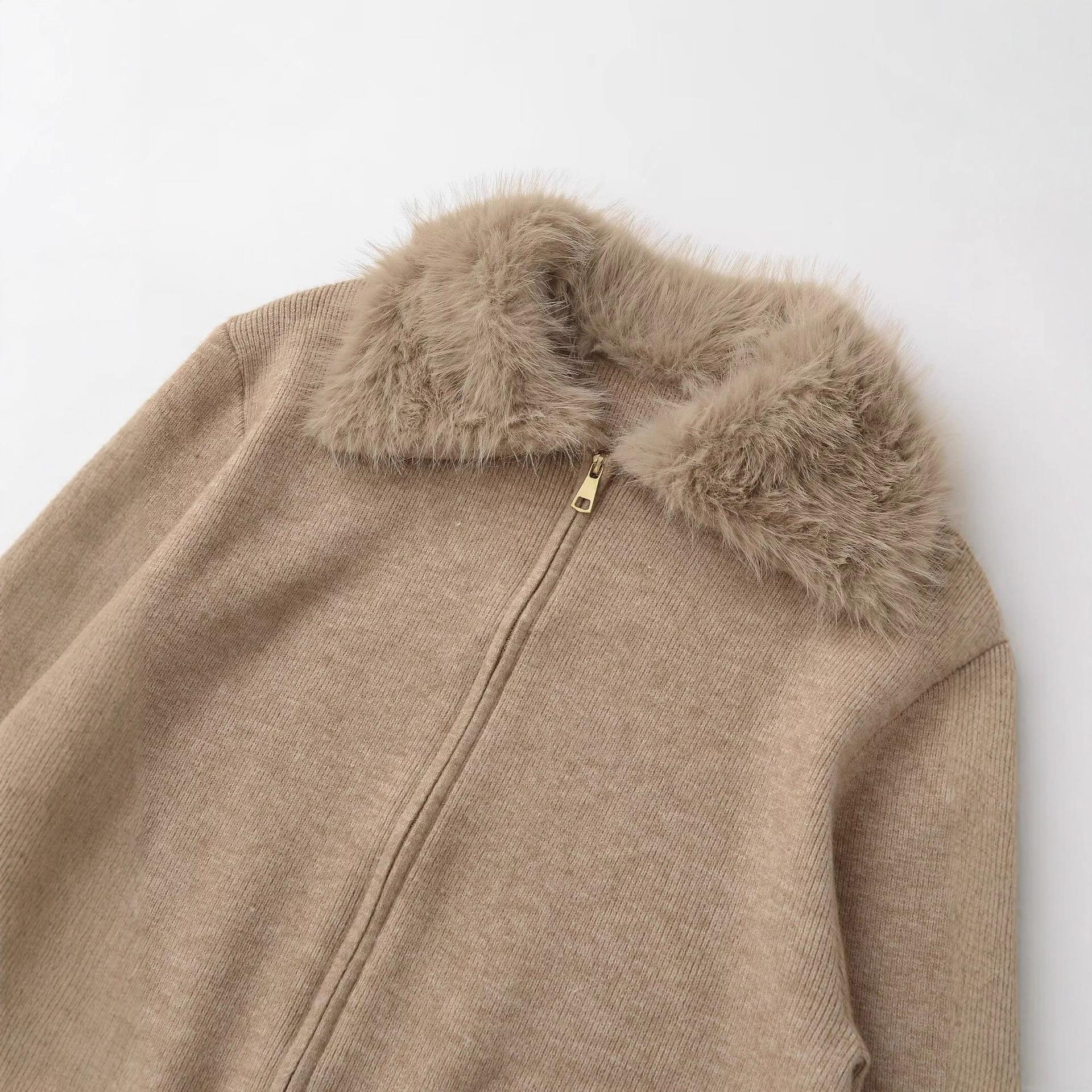 Women Fashion Knit Jacket With Faux Fur Collar Polyester Fabric Ribbed Texture Full Zip Mid-length Khaki Casual Elegant Outerwear For Women