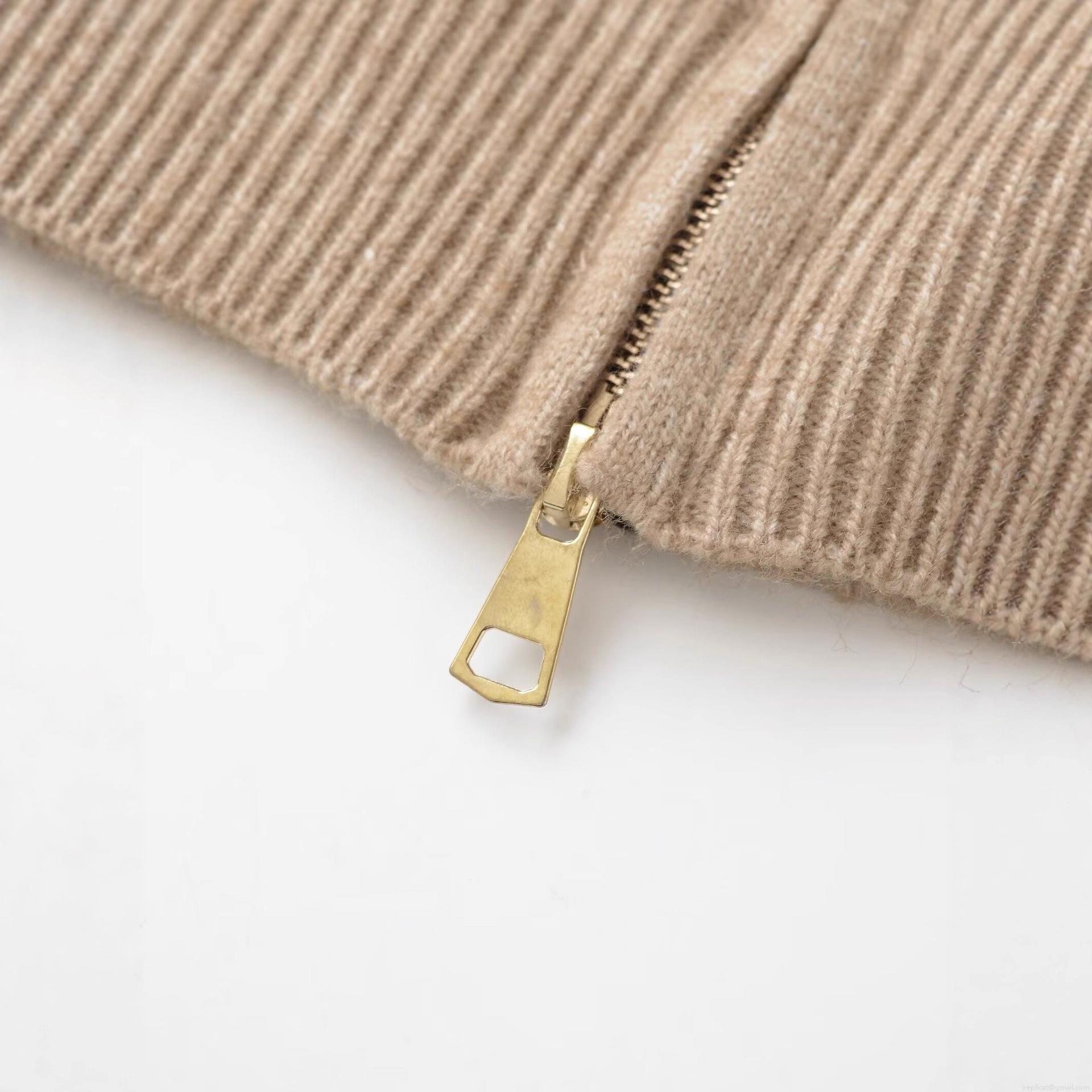 • Women Fashion Knit Jacket With Faux Fur Collar Polyester Fabric Ribbed Texture Full Zip Mid-length Khaki Casual Elegant Outerwear For Women