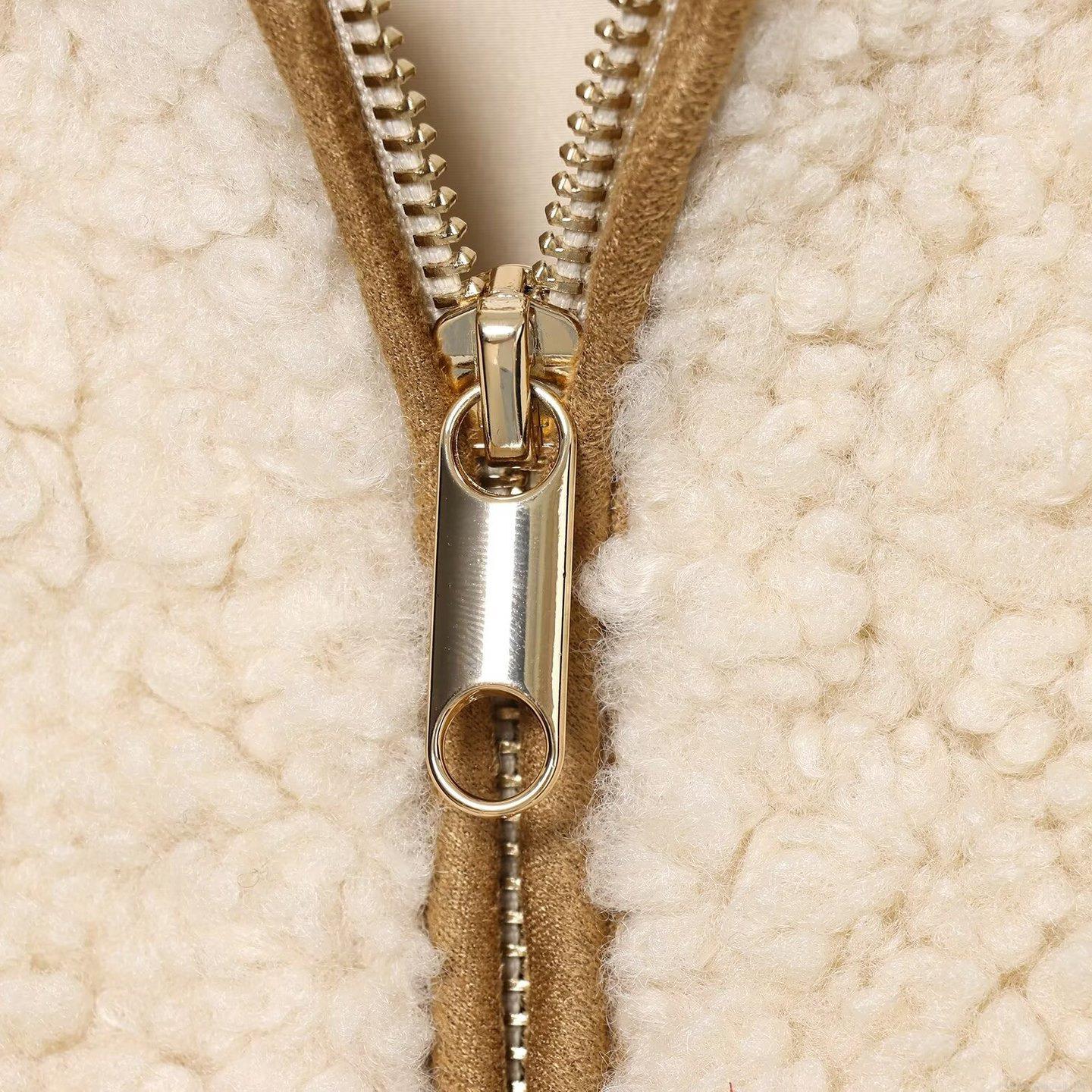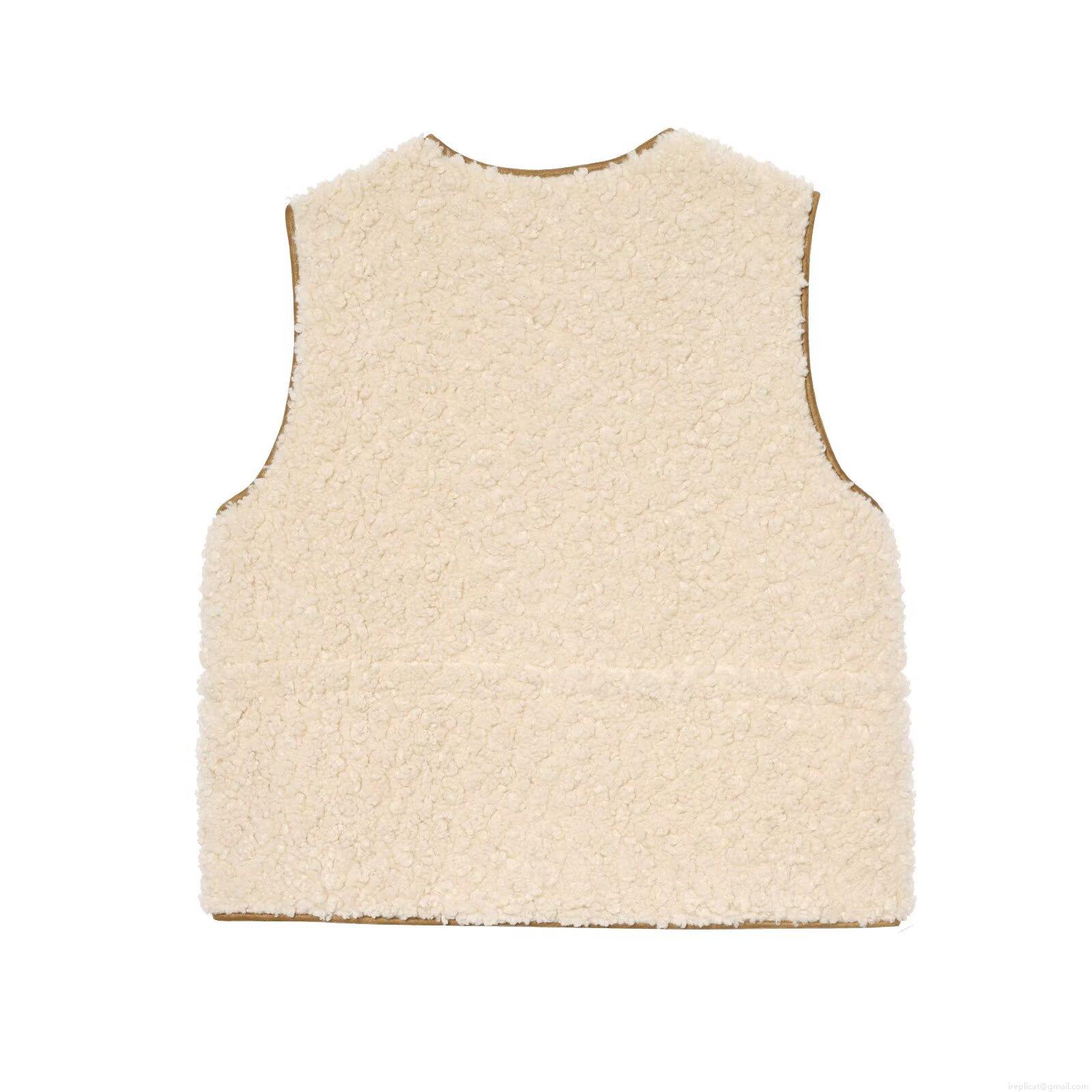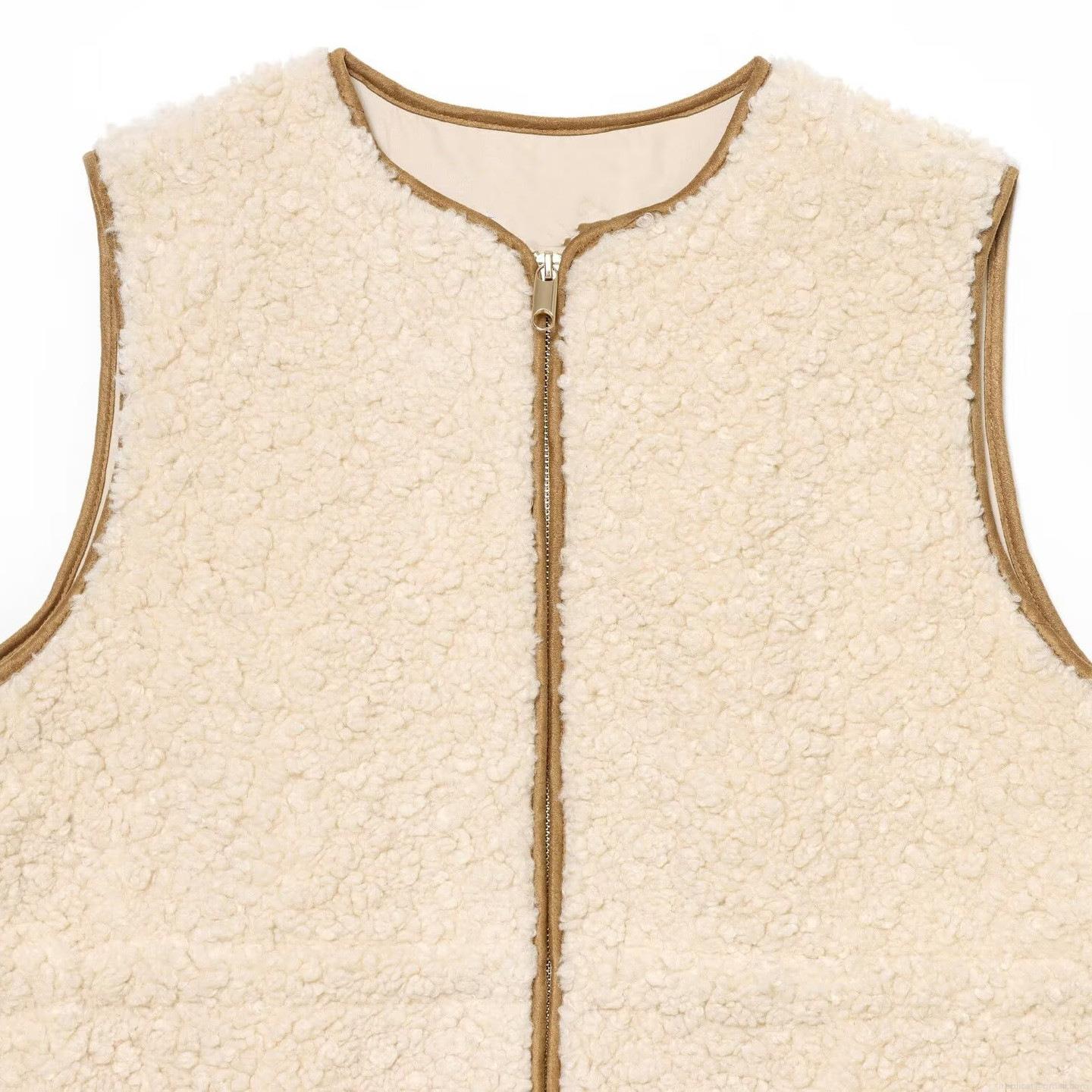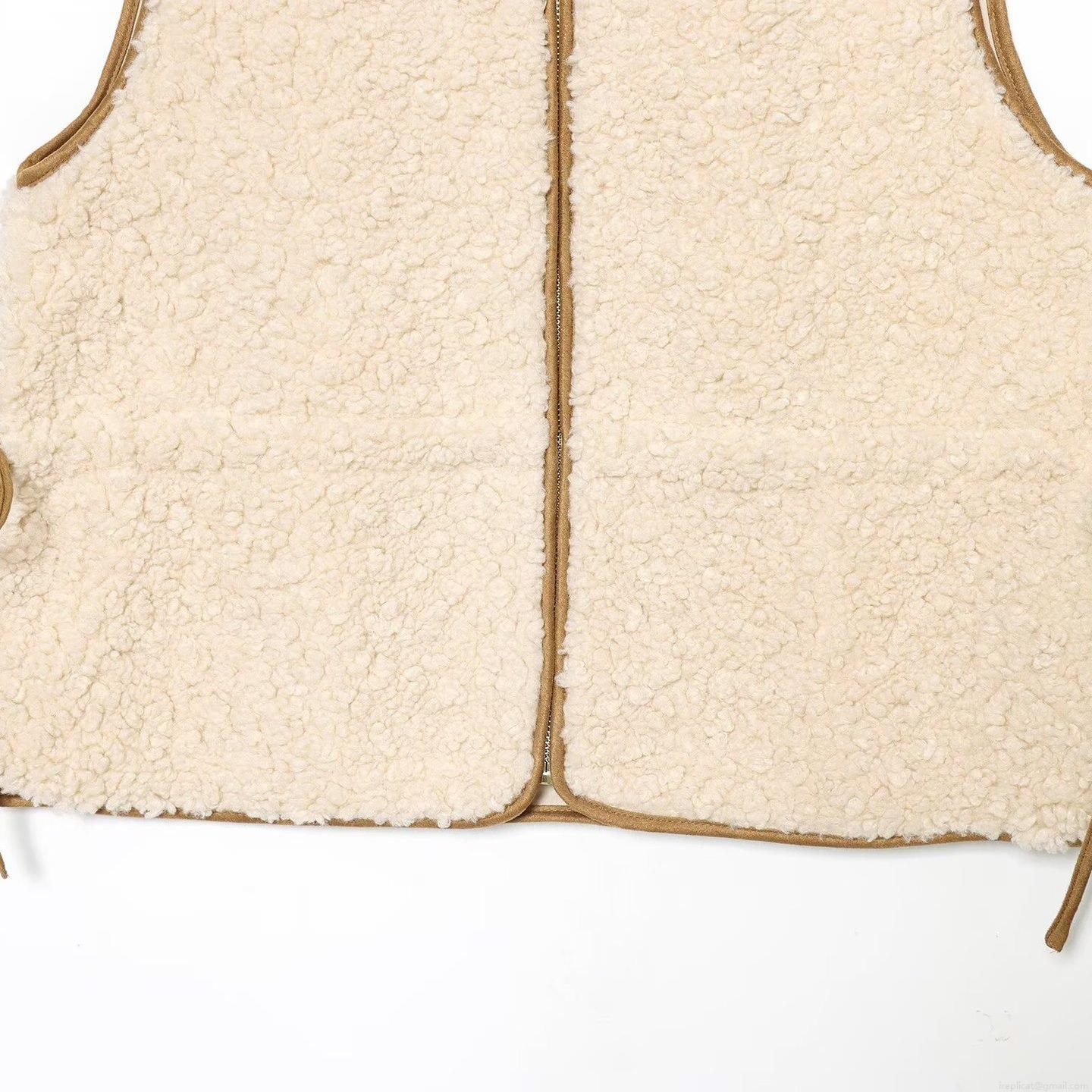 • Women Fashion Lambswool Vest Beige Solid Color Sweet Zip Up Sleeveless Jacket With Adjustable Drawstring Waist Winter Warm Fleece Outerwear