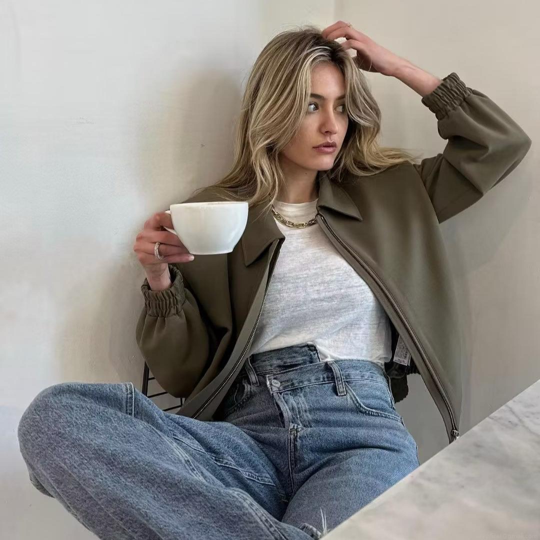 Women Fashion Lapel Collar Zipper Jacket Loose Solid Color Long Sleeve Baseball Uniform Outerwear Street Style Coat For Spring Autumn