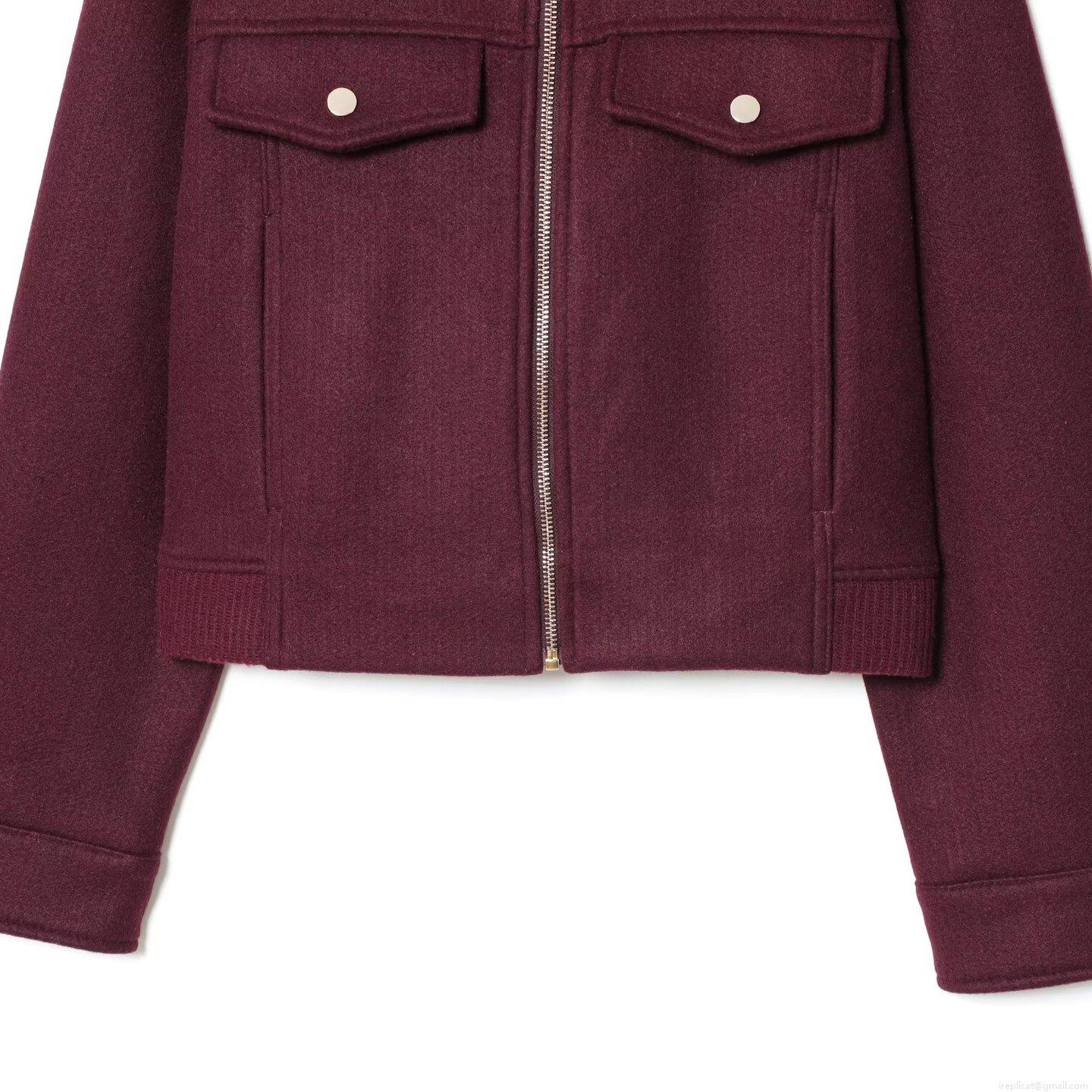 • Women Fashion Short Bomber Jacket Wine Red Polyester Wool-like Texture Long Sleeve Zipper Coat With Chest Pockets Casual Slim Outerwear For Women