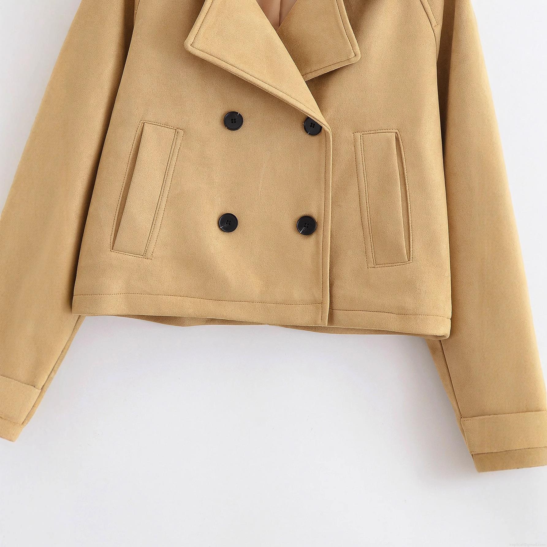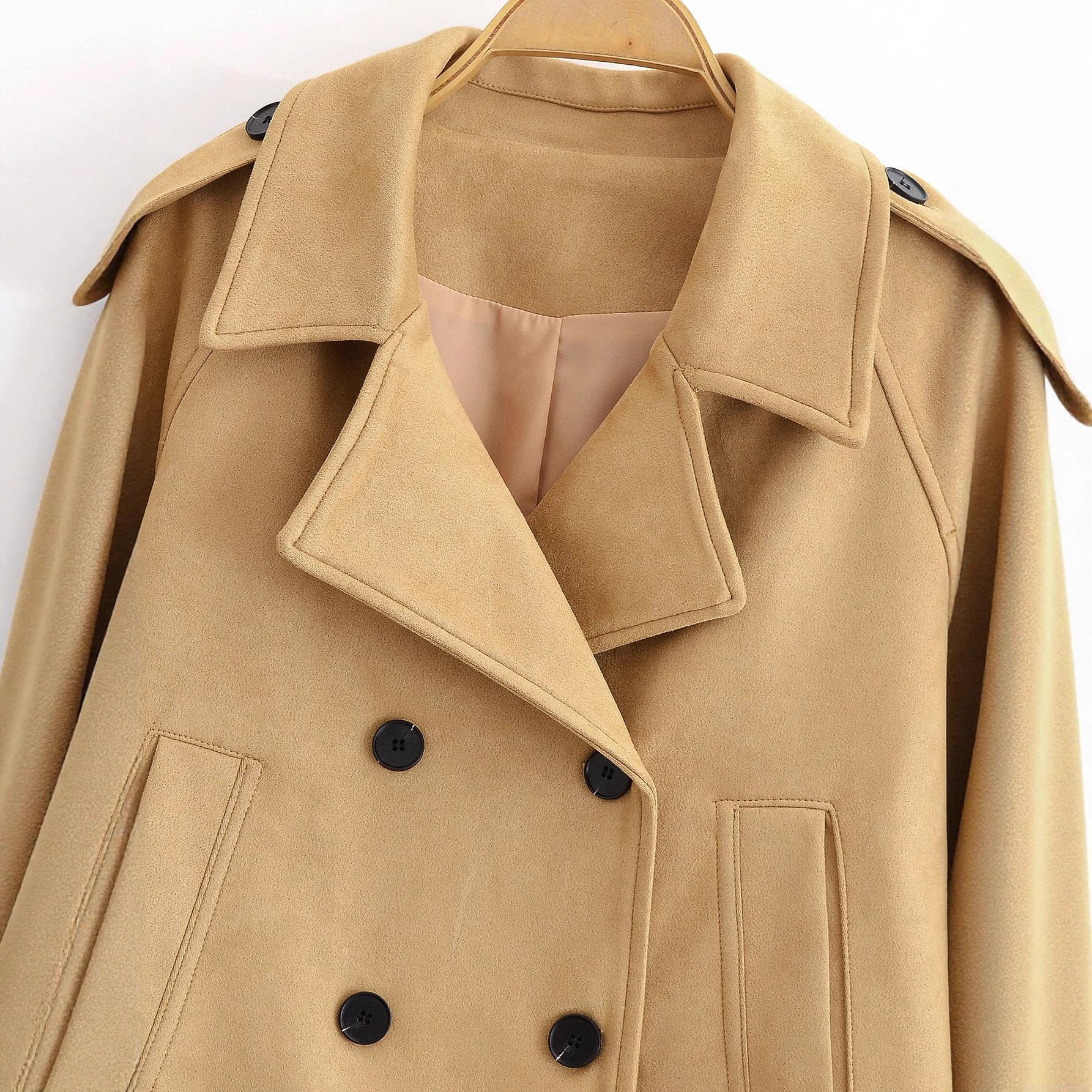 • Women Fashion Short Faux Suede Double Breasted Jacket With Lapel Epaulettes Casual Solid Color Long Sleeve Cropped Trench Outerwear For Ladies