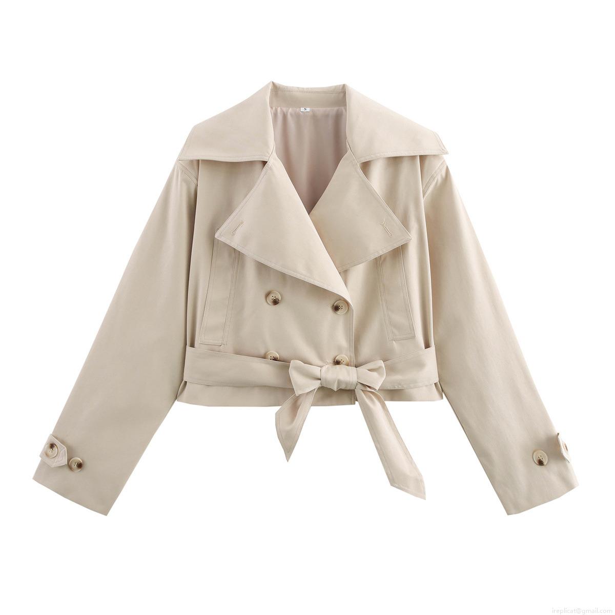 Women Fashion Short Trench Coat 100% Polyester Double Breasted Bow Tie Waist Jacket Streetwear Loose Fit Autumn Winter Outwear Lapel Windbreaker