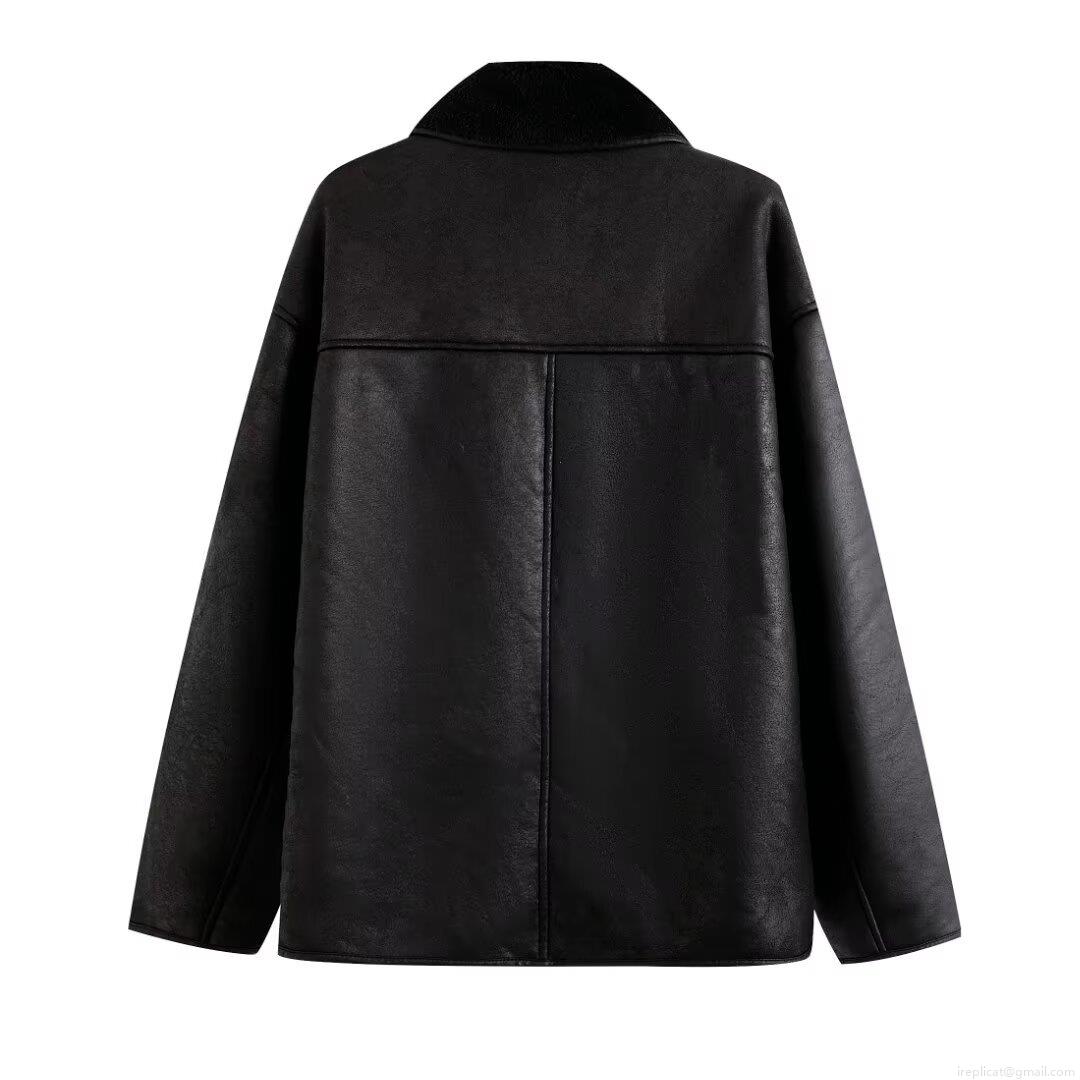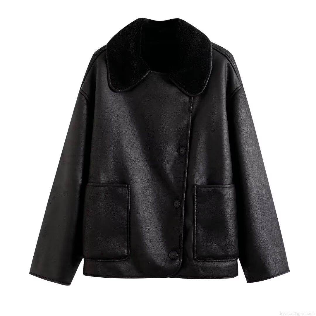 • Women Fashion Two-Tone Faux Shearling Leather Jacket Long Sleeve Contrast Lapel Warm Coat Streetwear Winter Outerwear Patchwork PU Leather Button Jacket For Women