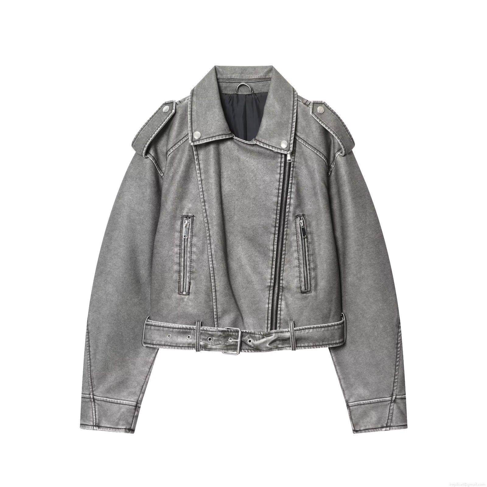 • Women Fashion Washed PU Leather Biker Jacket With Waist Belt Turn-Down Collar Metal Zipper Long Sleeve Streetwear Motorcycle Coat Spring Autumn Outerwear
