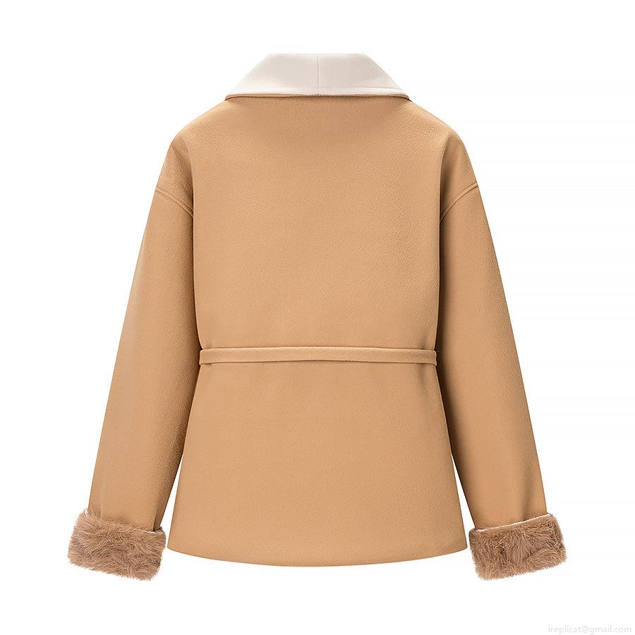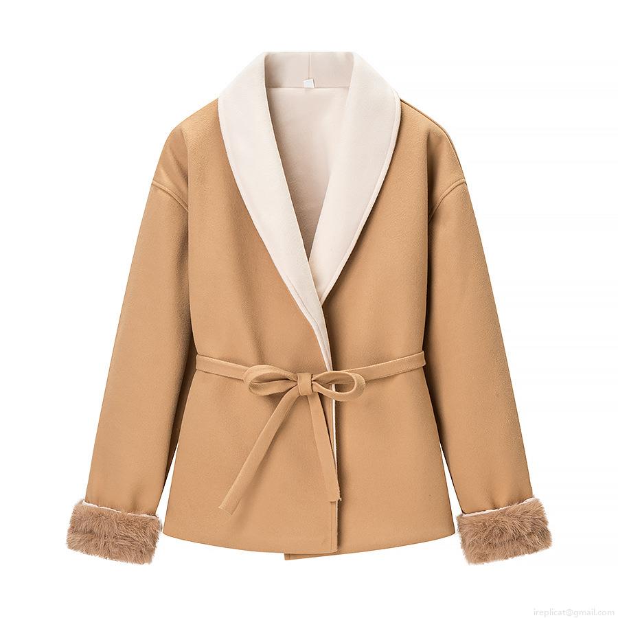 • Women Fashion Woolen Coat With Faux Fur Cuffs And Belt Elegant Contrast Shawl Collar Autumn Winter Casual Overcoat For Ladies