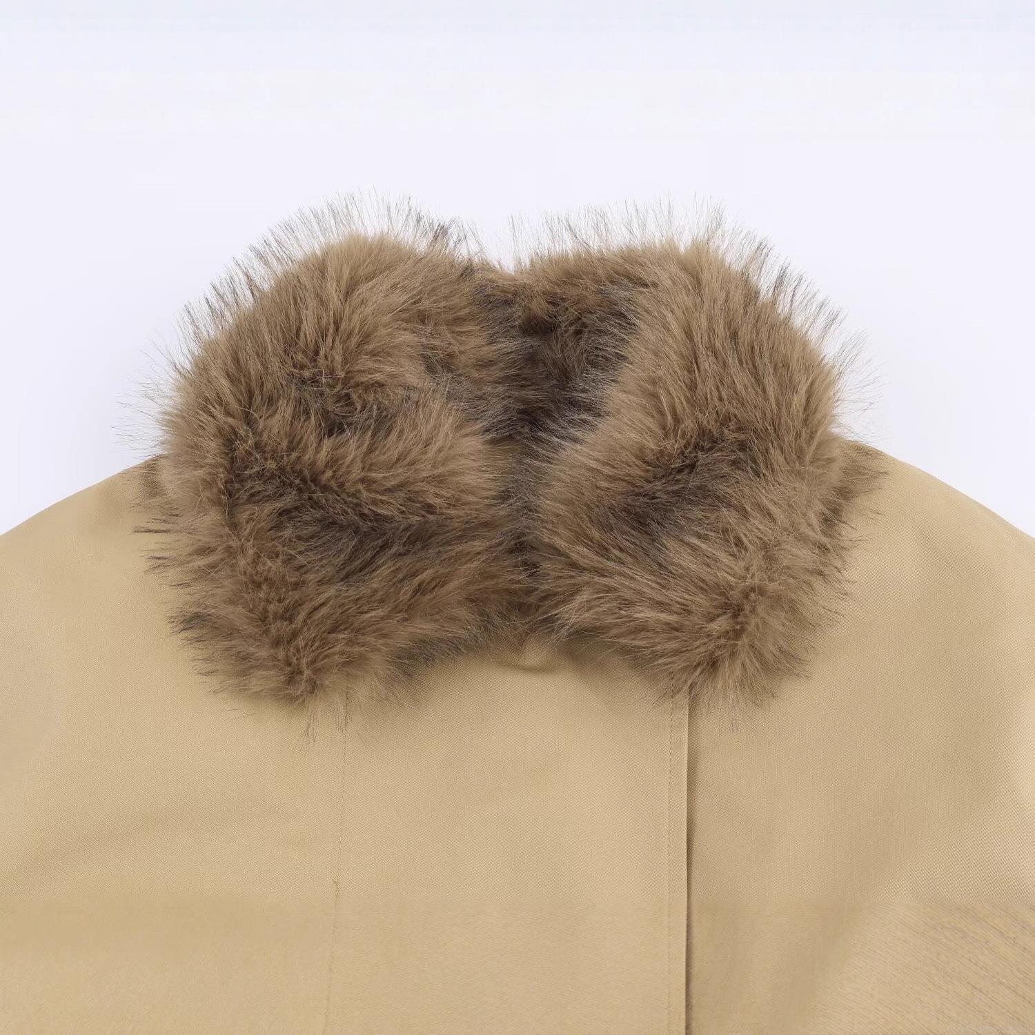 • Women Faux Fur Collar Bomber Jacket Fashionable Zip Up Windproof Khaki Solid Color Short Coat Casual Commuter Polyester Outerwear For Lady