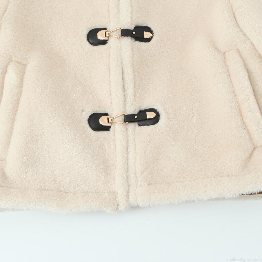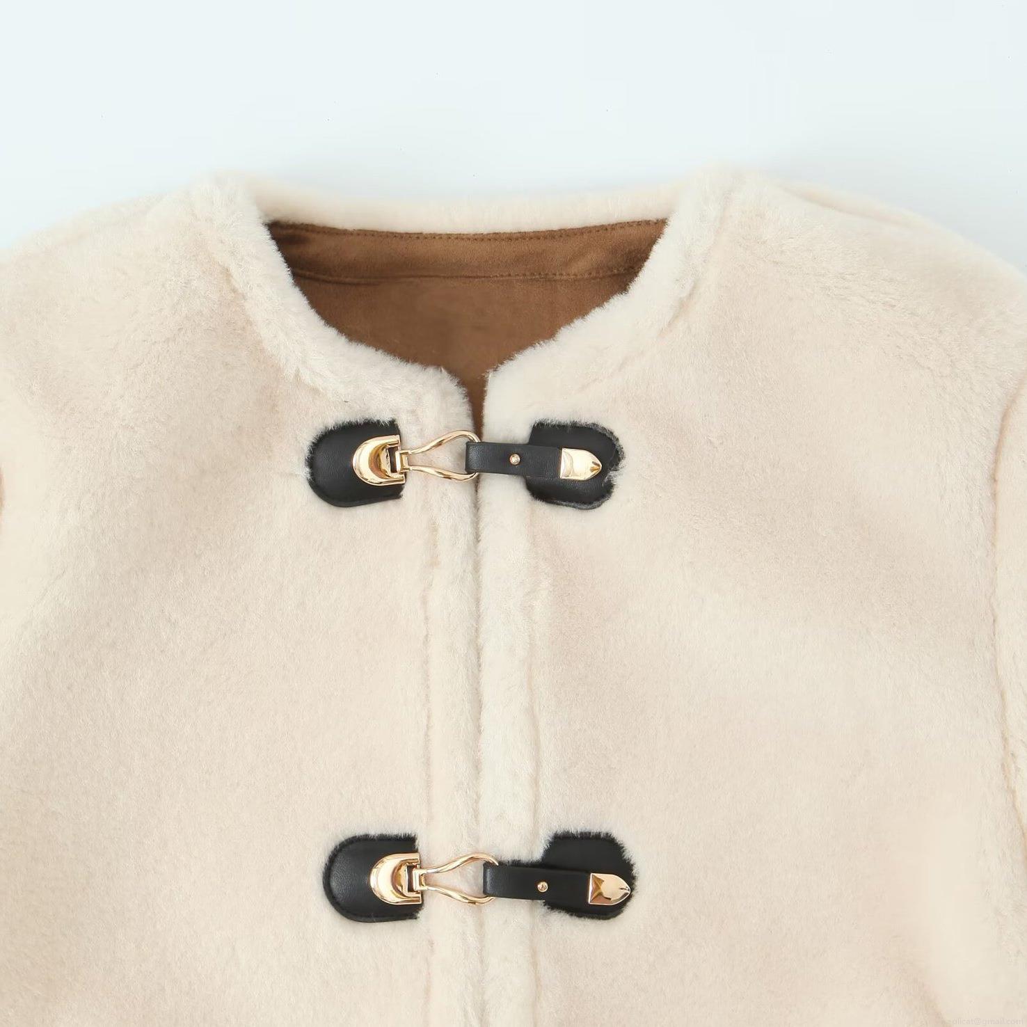 • Women Faux Fur Jacket Round Neck Warm Polyester Sherpa Coat With Metal Buckle Leather Patch Casual Autumn Winter Outerwear For Ladies Fashion Soft Thick Jacket