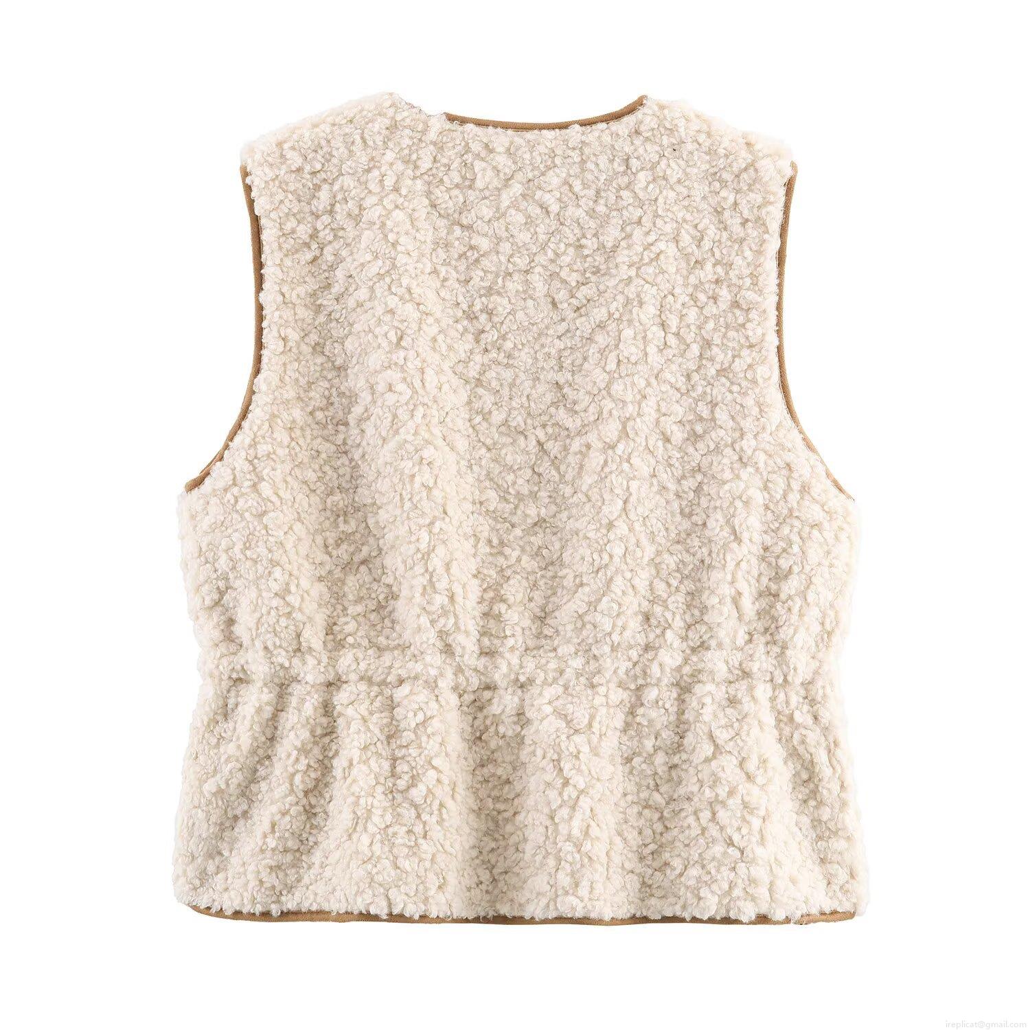 • Women Faux Lamb Wool Sherpa Vest Round Neck Zipper Waistcoat With Contrast Binding Adjustable Tie Side Cream White Warm Casual Outerwear