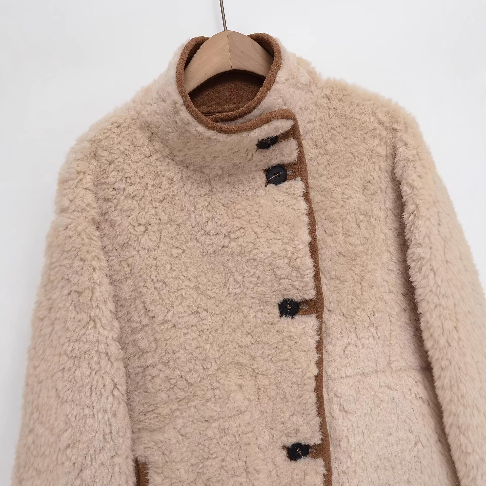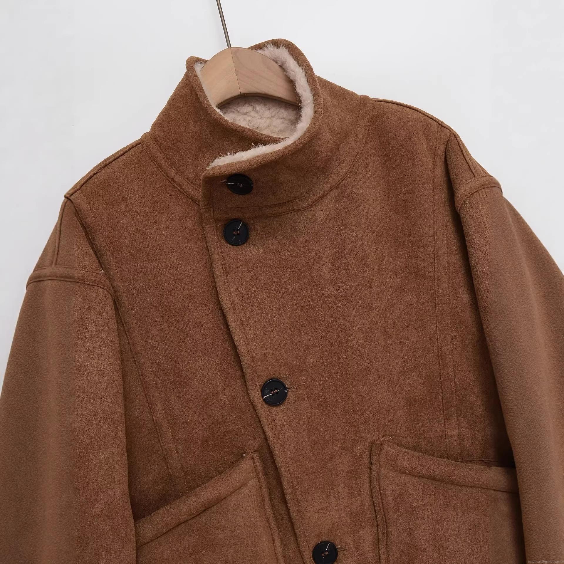 • Women Faux Shearling Jacket Suede Outerwear Thick Warm Winter Coat Stand Collar Button Up Loose Casual Streetwear Caramel Brown For Lady