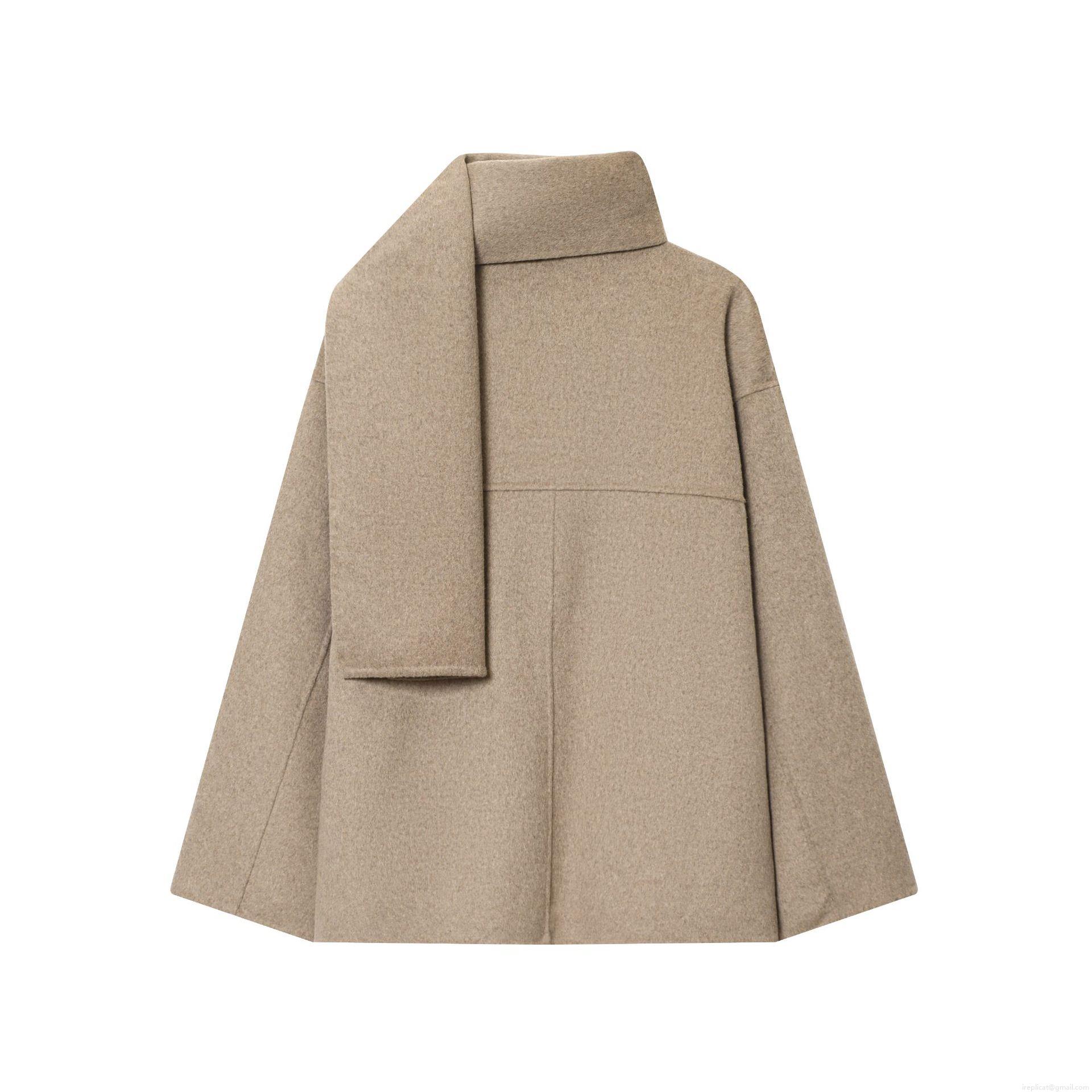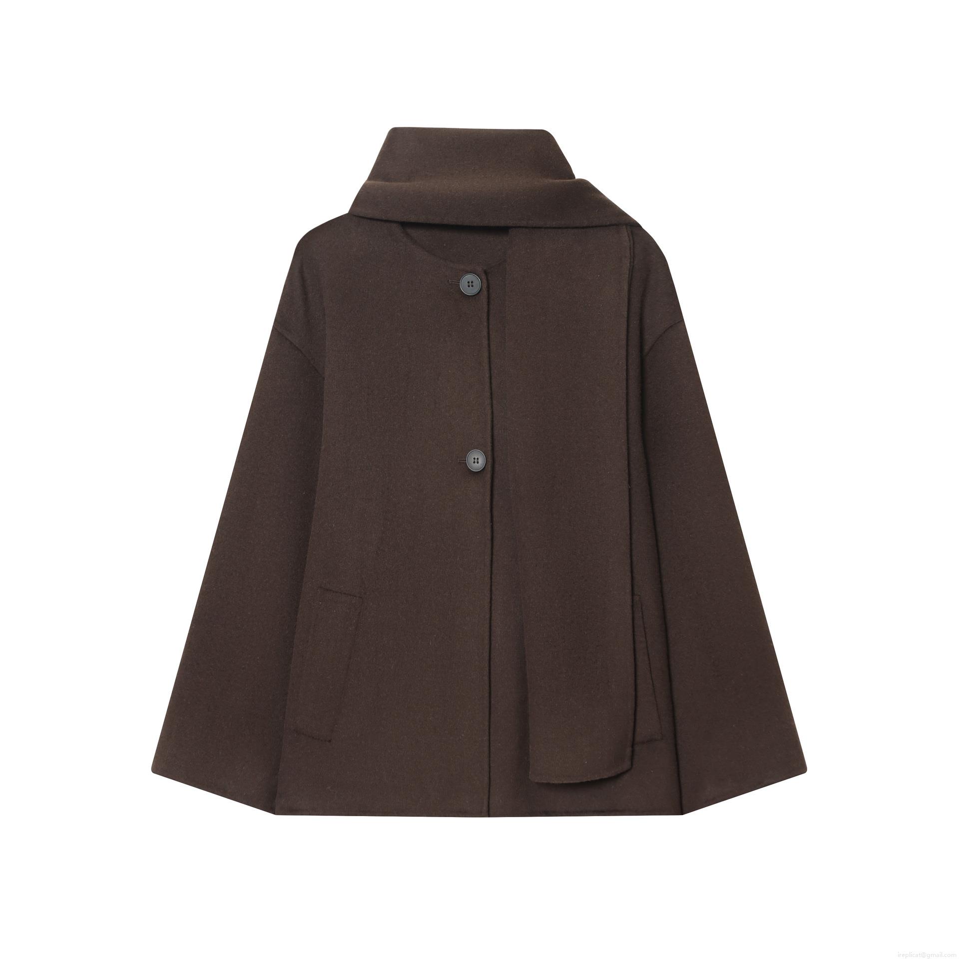 • Women French Fashion Retro Design Scarf Collar Short Woolen Coat Elegant Solid Color Double Button Outwear Minimalist Autumn Winter Jackets For Women