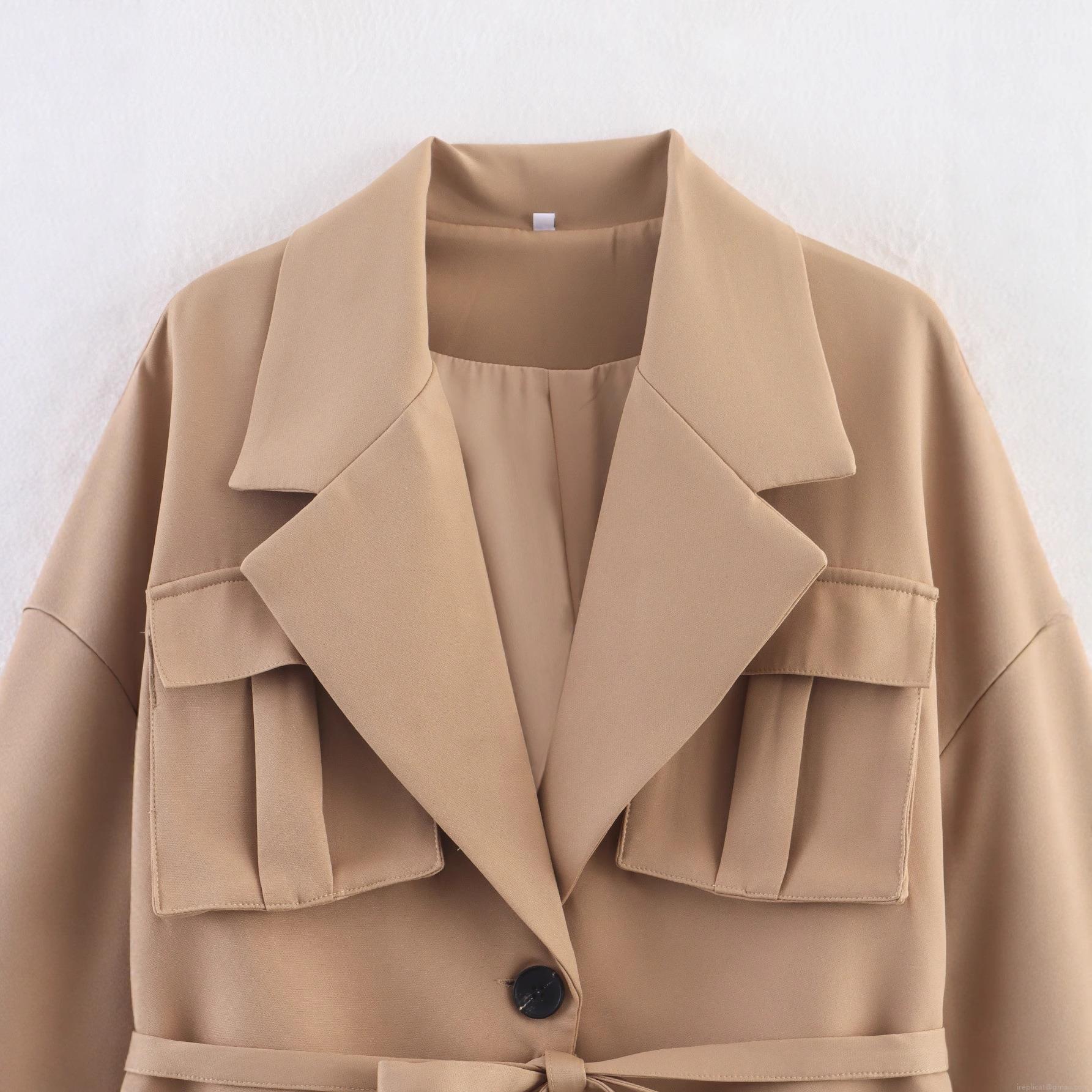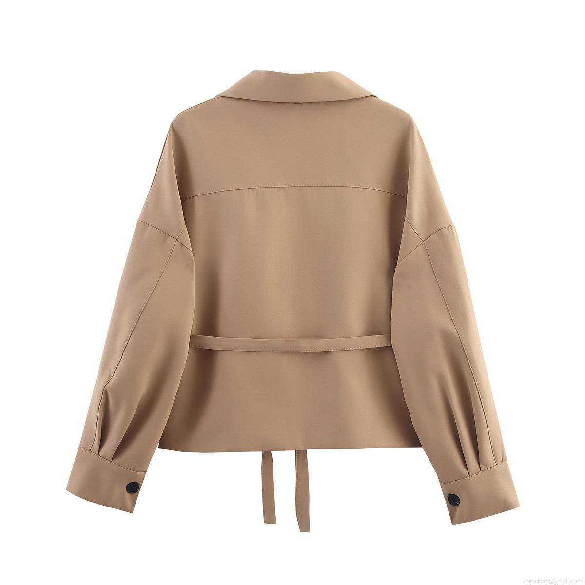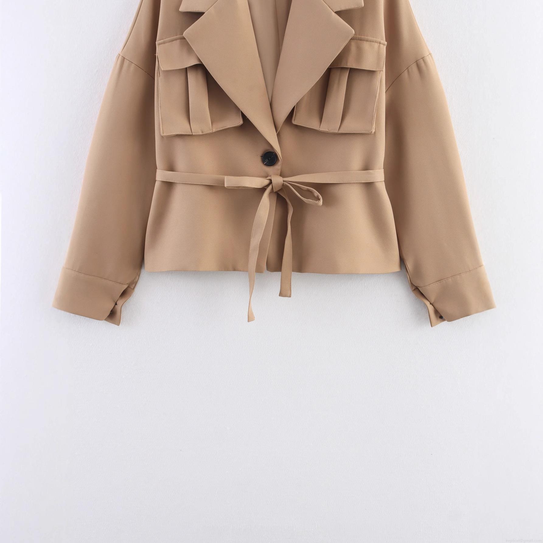 • Women Khaki Short Blazer Jacket With Belt Solid Color Lapel Long Sleeve Casual Workwear Style Outerwear Elegant Fall Fashion For Lady